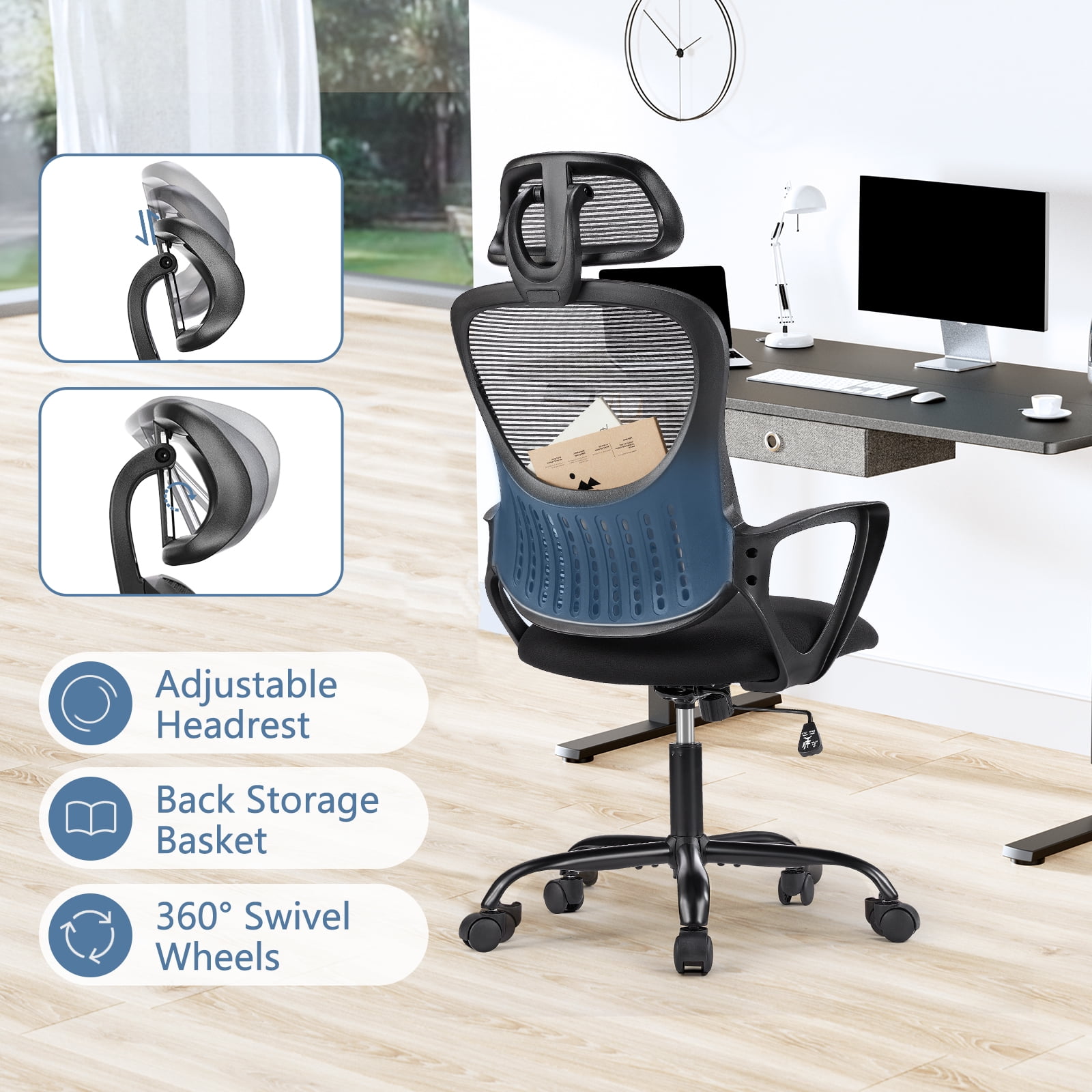 JOINSUN Ergonomic Mesh Office Desk Chair with Adjustable Headrest, Lumbar Support and Fixed Armrests, Black