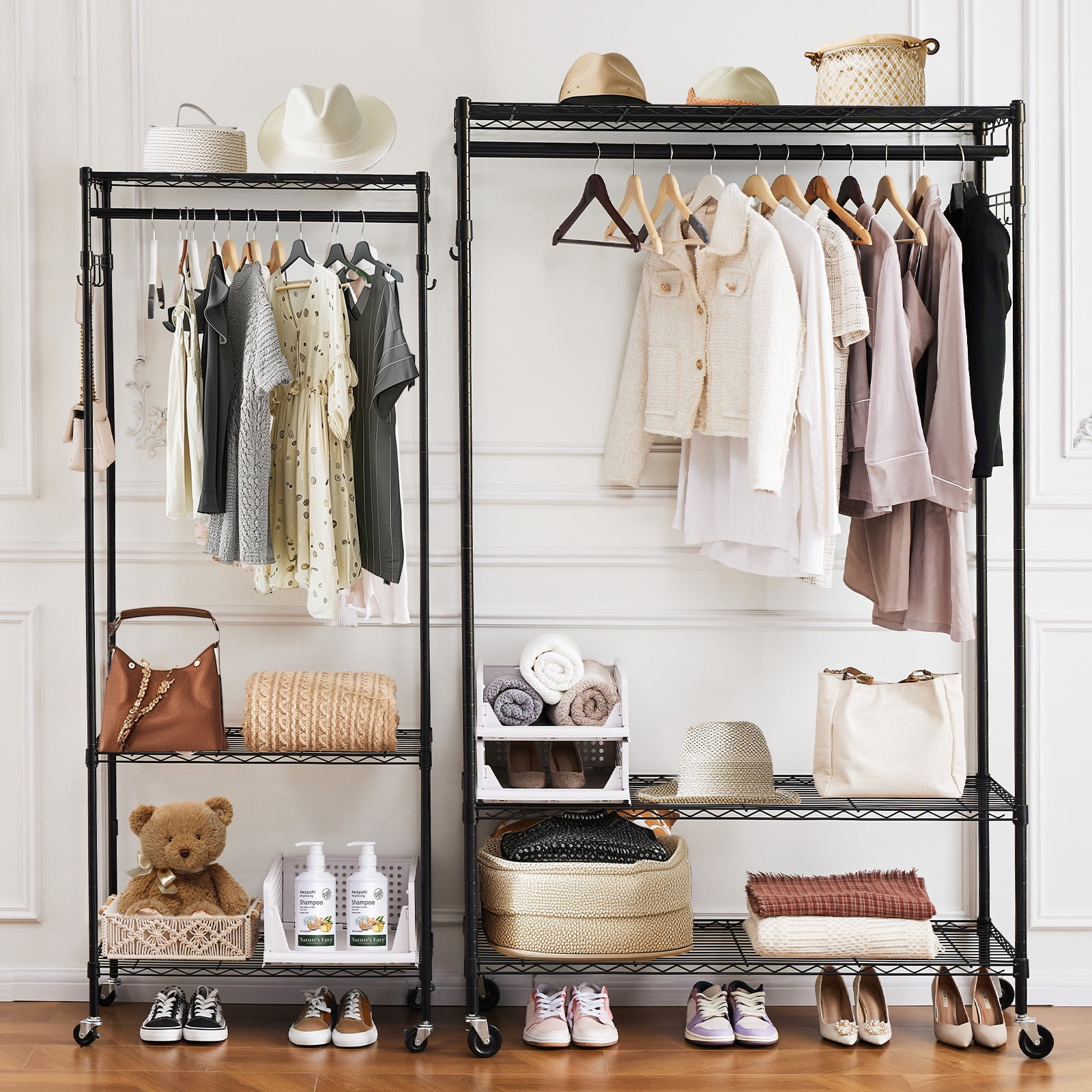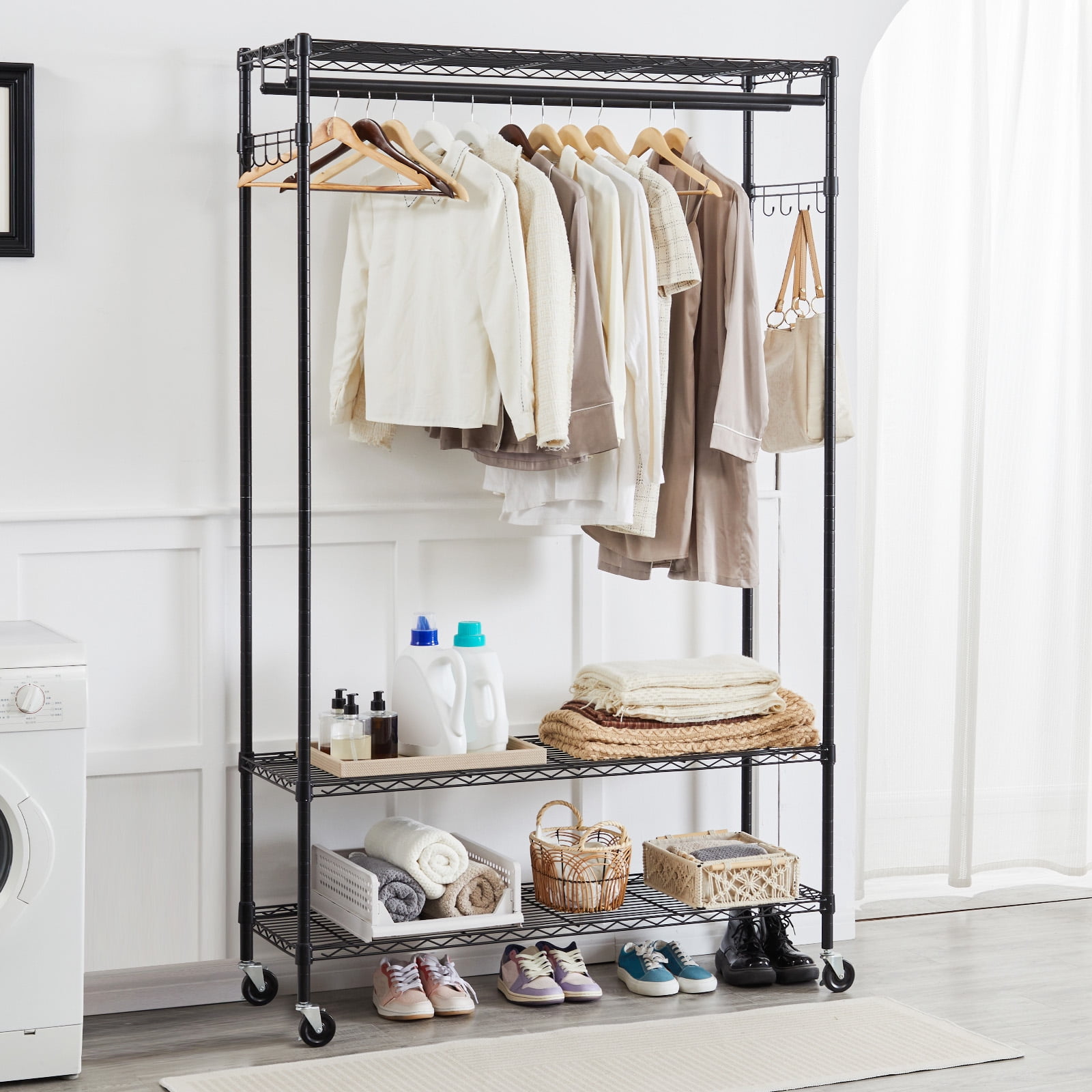 Dimension & Load Weight: 17.7″D x 47.2″W x 80.3″H(Included wheels height). 350 lbs. net weight per level with load bearing feet installed. Static weight capacity with wheels installed is 440 lbs. and dynamic weight capacity is 260 lbs. Metal clothes rack hangers are stronger and more durable and can hold heavier loads of clothing without being easily deformed or damaged. Space saving: With 3 tiers of shelves, 2 hanging rods and 2 sets of side hooks, this clothing rack is able to easily sort and hang different kinds of garments, making your closet more tidy and organized. The garment rack has plenty of storage space and saves floor space. Adjustable Clothes Rack: The adjustable feature of the hangers allows you to manage your clothes more conveniently. Adjusting the height of the dividers according to the size and type of clothes allows you to organize and store your clothes more efficiently. Each piece of clothing has a proper space to keep your clothes neat and organized. Sturdy and Durable: 350 lbs. per net layer with load bearing feet installed. 440 lbs. static load capacity with wheels installed, 260 lbs. dynamic load capacity. Metal clothes rack are stronger and more durable, and can withstand heavier clothing without being easily deformed or damaged. Metal hangers are also easier to clean and can be wiped with a damp cloth to keep them clean. Easy Assembly: Read the installation instructions carefully before you begin assembling the hanger. Make sure that all components follow the correct order and that all connection points are firm and stable. Once assembly is complete, check all connections and structural stability to ensure safe use.