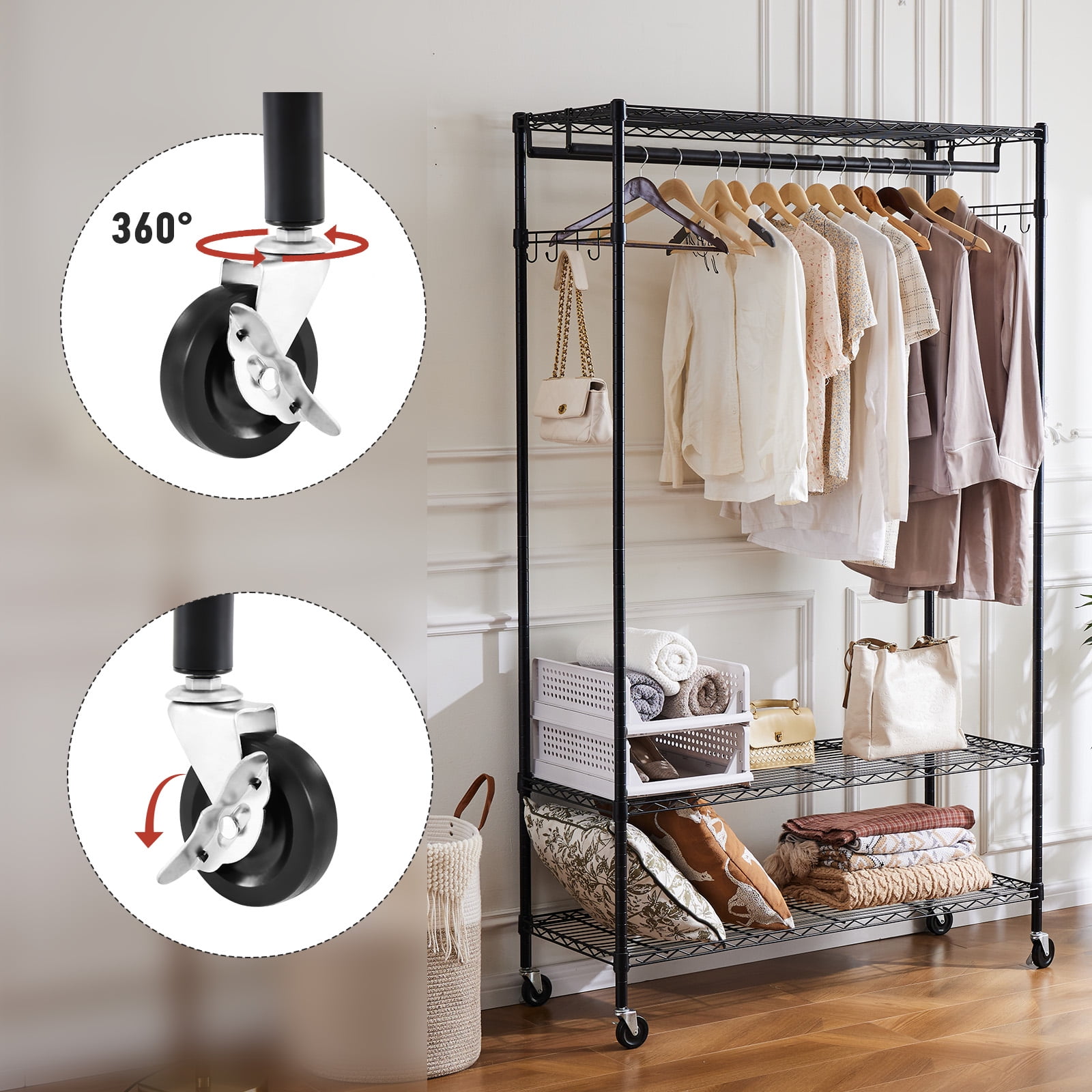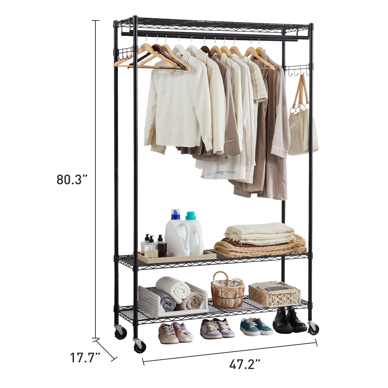 JOINSUN Rolling Clothes Rack, Adjustable Wire Closet Organizer with Wheels, Freestanding Wardrobe with 2 Hang Rods and 3 Shelves, 17.7″ D x 47.2″ W x 80.3″ H