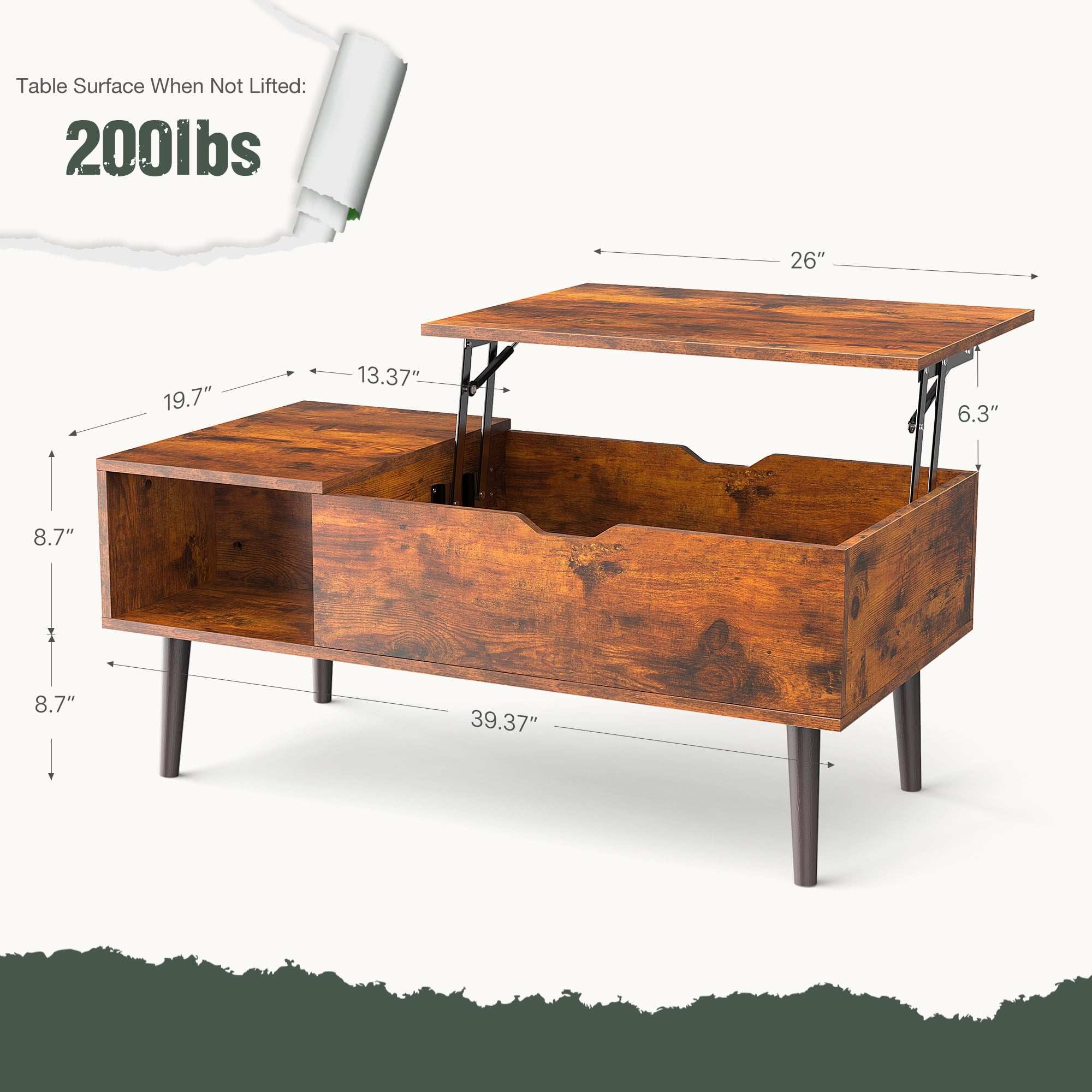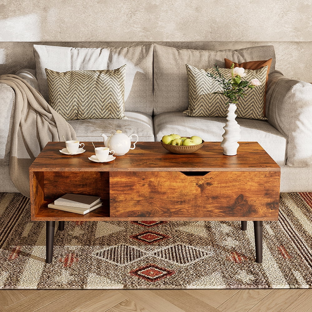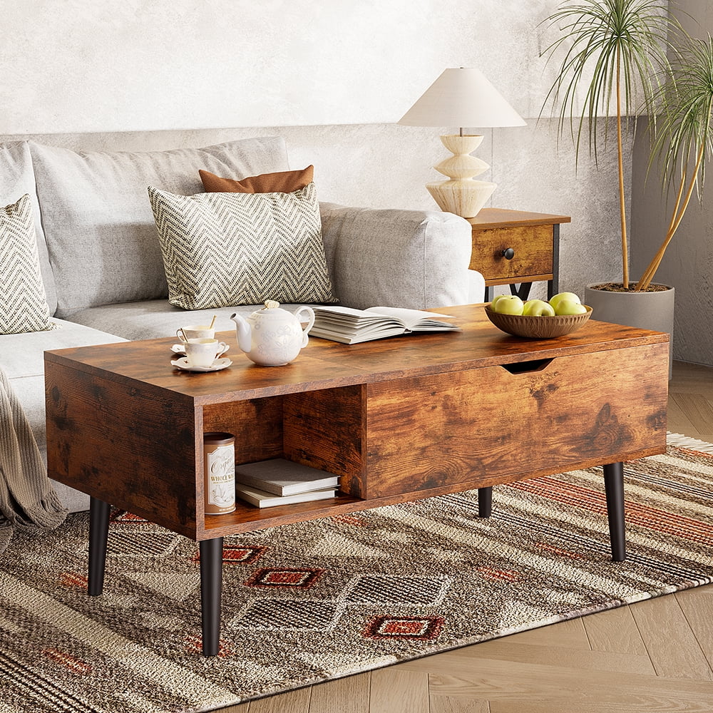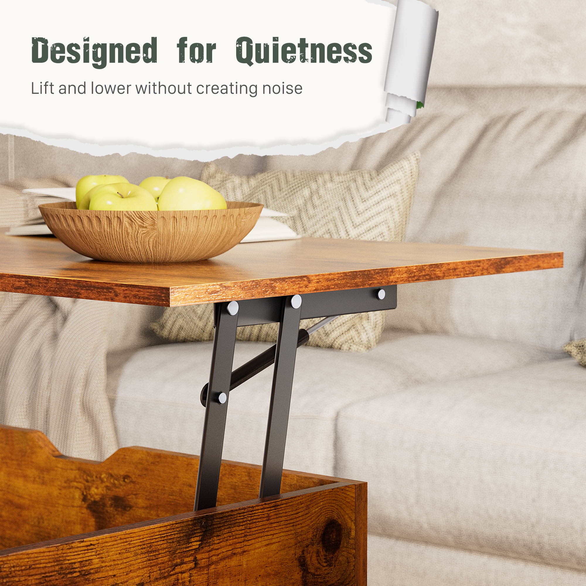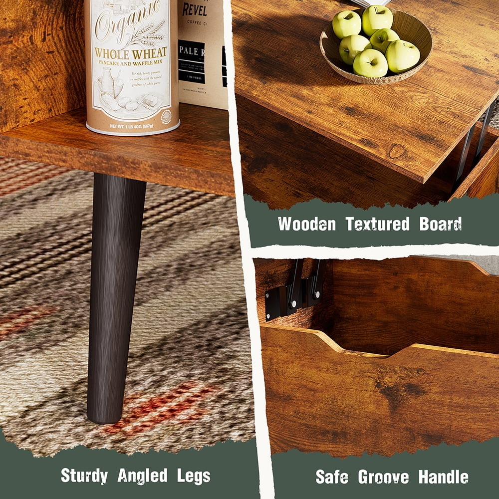 [Lift-Top Design]-The tabletop of this coffee table can be raised from 16.93 inches to 23.62 inches, creating a temporary workspace. After being used as a workspace, the desktop can be easily folded and reused as a regular sofa table. This way, you can work or eat comfortably without bending over. [Storage Space]-The coffee table provides ample storage space, including a spacious tabletop, an open compartment, and a storage compartment hidden beneath the tabletop. This allows cups, magazines, and other small items to be stored neatly and orderly to meet your storage needs. [Structural Stability]-The high-quality metal air pressure support mechanism is better than traditional pressure springs, allowing the desktop to be easily and silently lifted. Using wooden structure and carefully selected materials, in order to ensure durability and stability, it will not shake or tilt during use. [Easy To Assemble And Clean]-Clear instructions and marked parts make assembling this coffee table a breeze. The water-resistant surface can be easily cleaned with a damp cloth when needed. [Multi-functional Table]-This adjustable coffee table is a versatile piece that is ideal for small apartments, dorms, and studies. It can be used as a coffee table, temporary dining table, or computer desk.