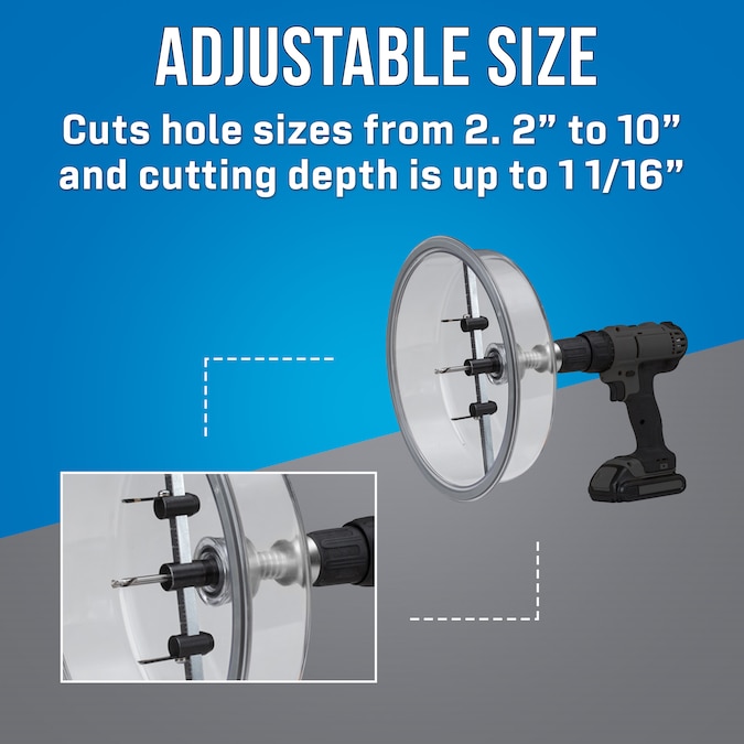 • ADJUSTABLE SIZE: Cuts hole sizes from 2. 2-in to 10-in (55 mm to 254 mm) and cutting depth is up to 1-1/16-in (27 mm) with adjustable hex locknut and compression spring