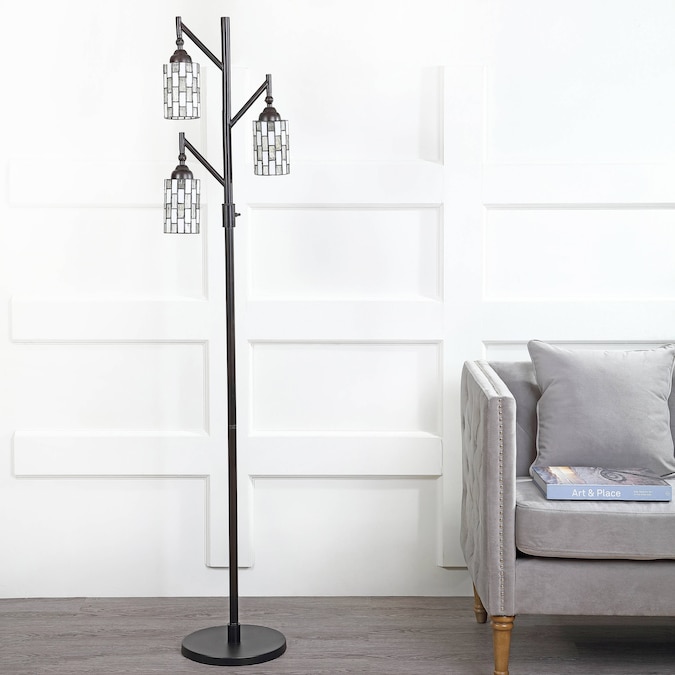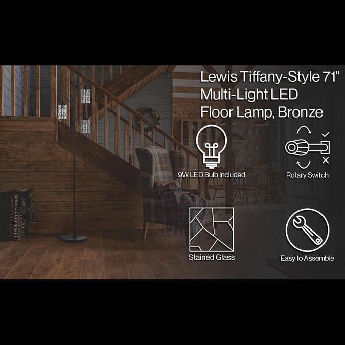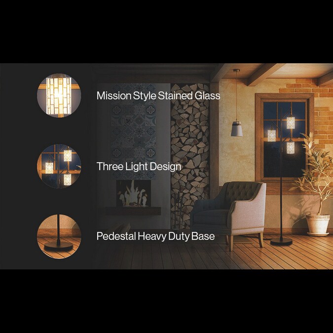 With three lights glowing through the mission-style stained glass design, this floor lamp will stand out in any space. One of the finest techniques to come out of the Art Nouveau movement, the Tiffany-style stained glass technique is steeped in traditional design, though this piece is updated with the functionality expected today — a step-on on/off button, LED bulb compatibility, and a beautiful silk-wrapped cord. Each shade is hand-made by artisans who specialize in the intricate art of stained glass soldering.