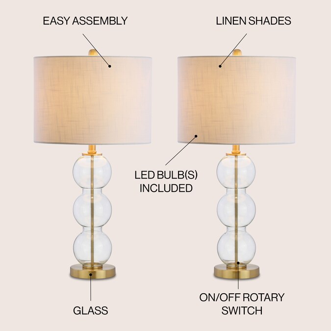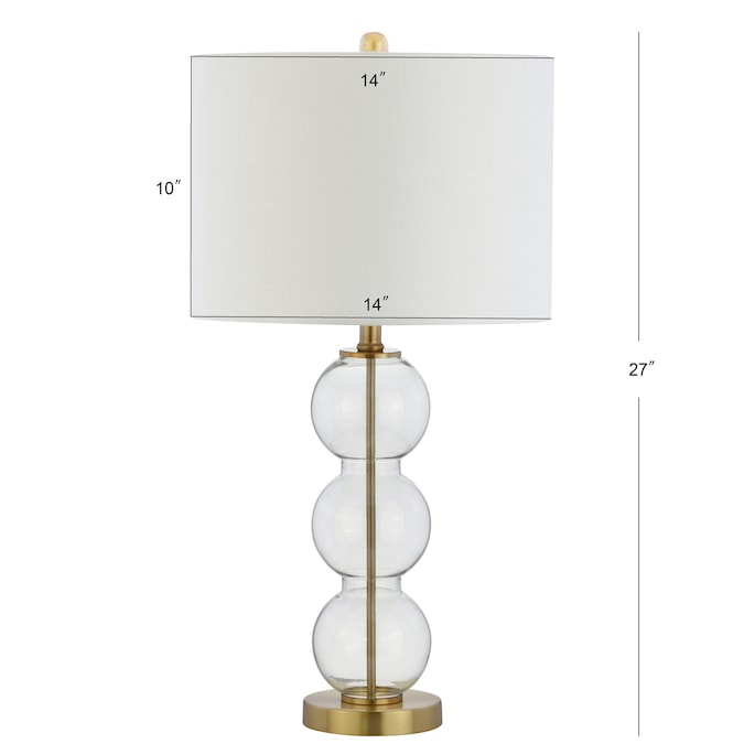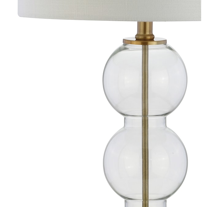 Glass blown into a trio of perfectly aligned orbs makes this shapely lamp base an eye-catching addition to any home décor. Colored in a versatile clear glass with a brass base and fittings, the look is completed with a matching finial and linen drum shade. Style extends all the way to the plug with a silk-wrapped cord reminiscent of classic antiques.