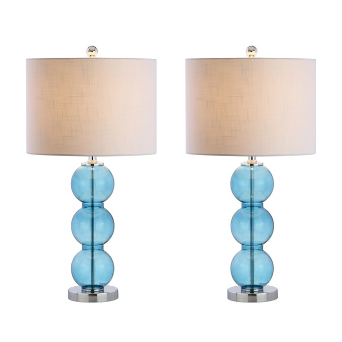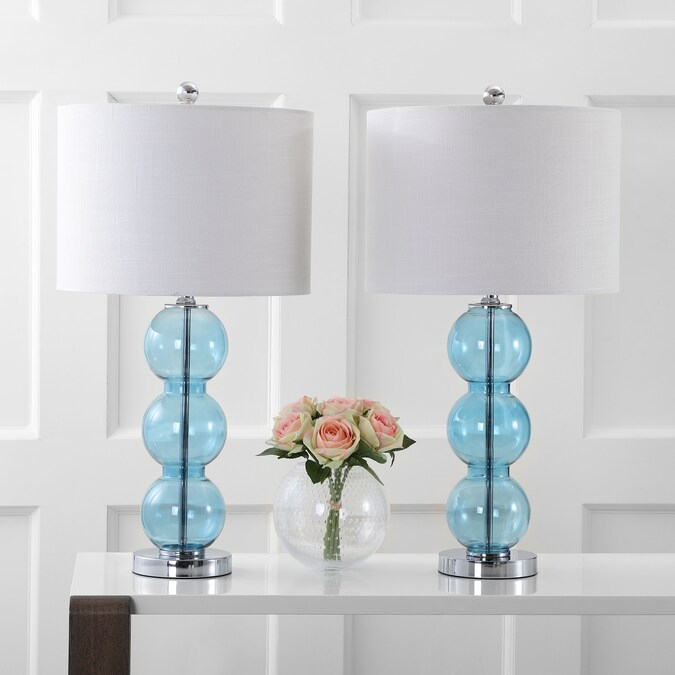 Glass blown into a trio of perfectly aligned orbs makes this shapely lamp base an eye-catching addition to any home décor. Colored in a cerulean blue glass with a chrome base and fittings, the look is completed with a matching finial and linen drum shade. Style extends all the way to the plug with a silk-wrapped cord reminiscent of classic antiques.