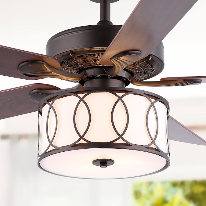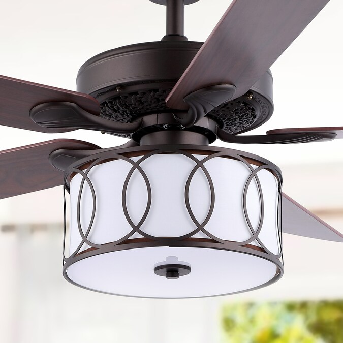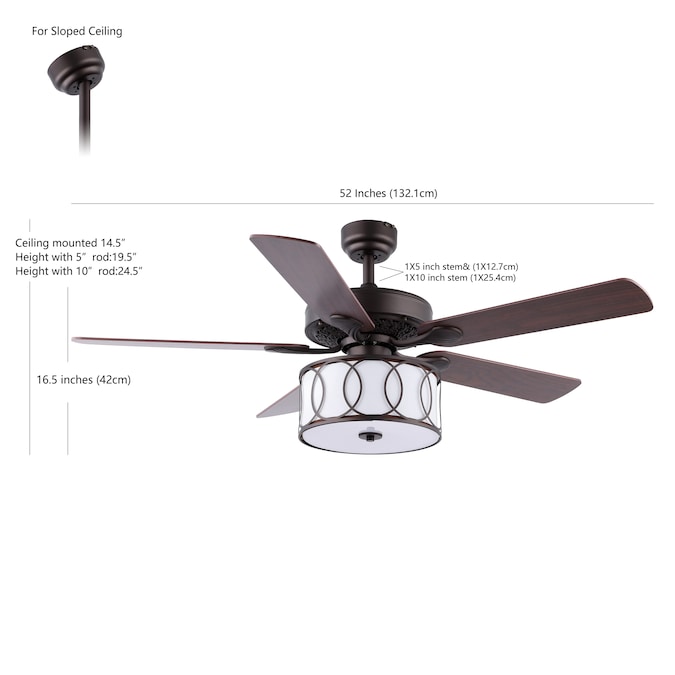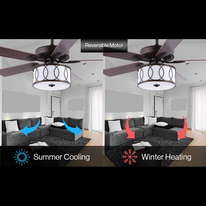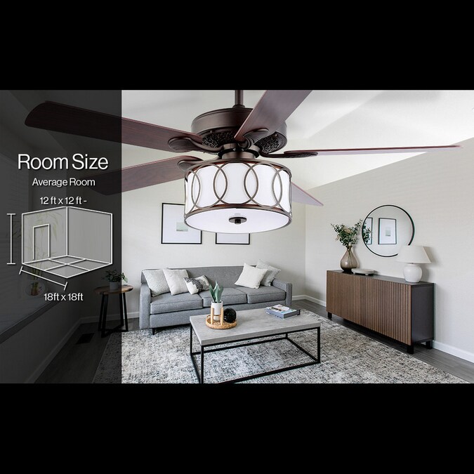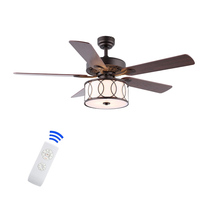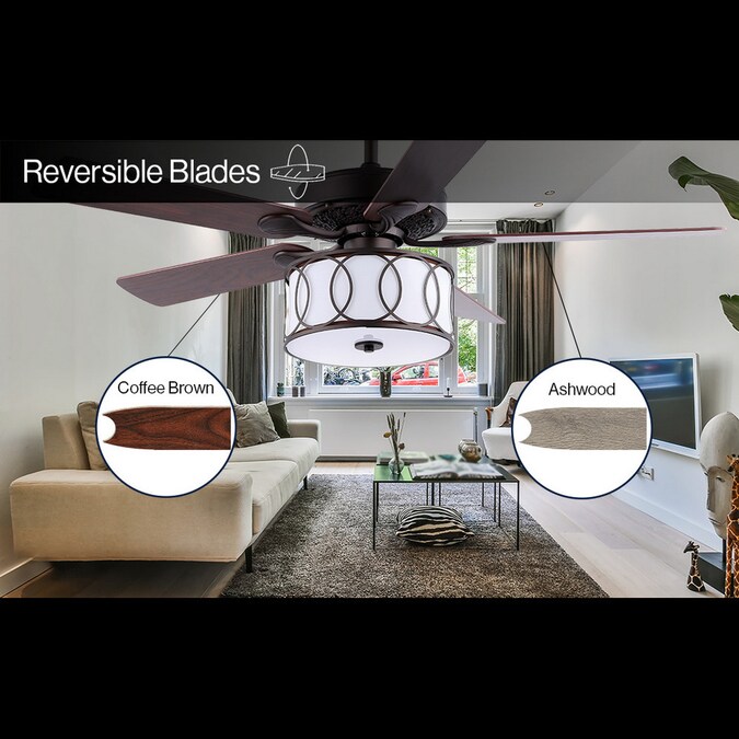 Our 52 Inch ceiling fan’s tailored design has a trendy drum lamp shade trimmed in oil rubbed bronze for an elegant, modern finish. Five reversible blades provide plenty of air flow by remote control. A diffuser panel conceals 3 LED light bulbs for a polished look.