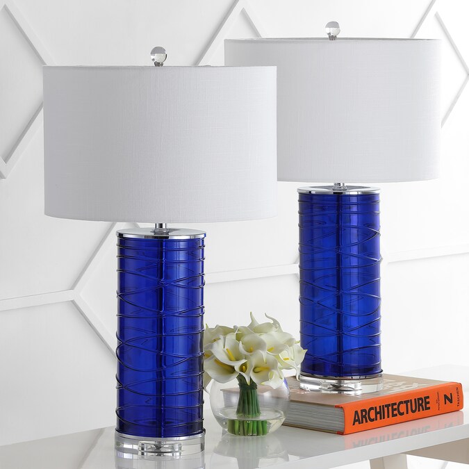 A pair of lamps to add sparkle to your space. Ribbons of glass create unique patterns on this lamp’s glass cylinder base. The clean, simple lines and a drum shade have mid-century modern flair, while the cobalt blue glass adds a touch of glam.