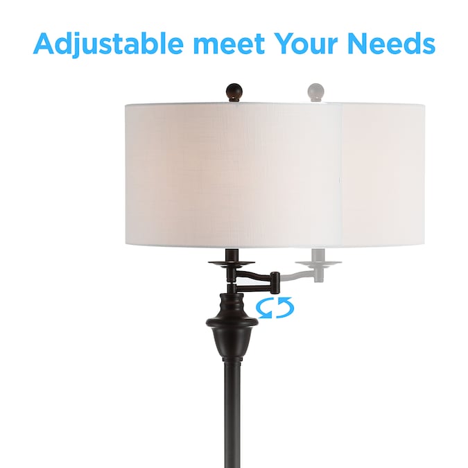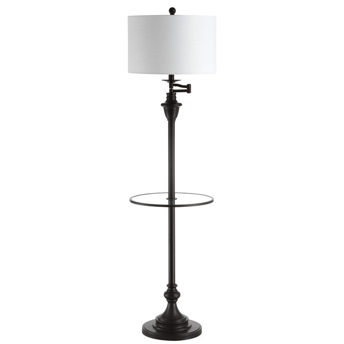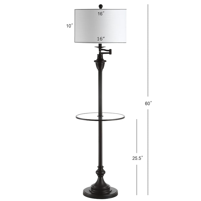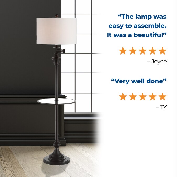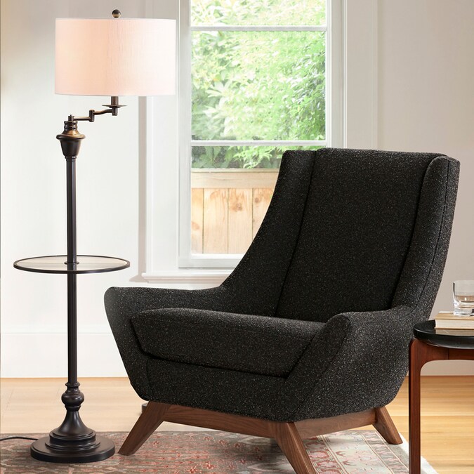 This floor lamp design offers both classic form and function. It comes with a built-in glass tray at perfect side-table height that’s ideal for holding your favorite novel or a TV remote. A step-on on/off switch and swing arm make it a practical choice for reading areas. Simultaneously, the oil rubbed bronze finish, urn-shaped column detail and linen drum shade make it an impeccable addition to any style of home decor.
