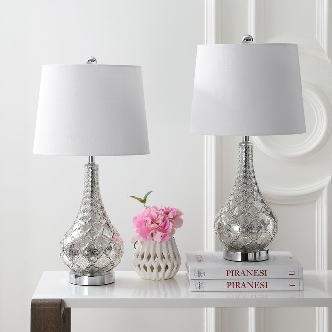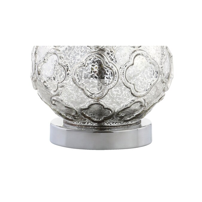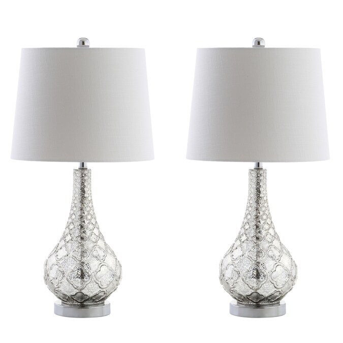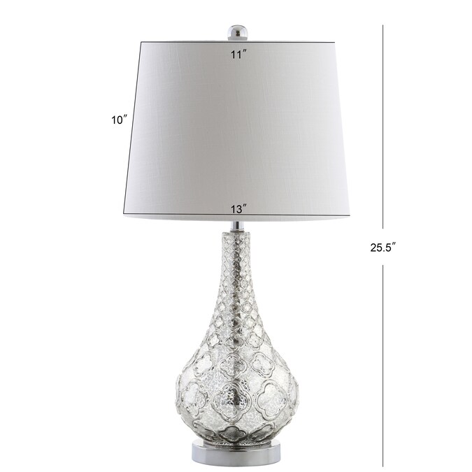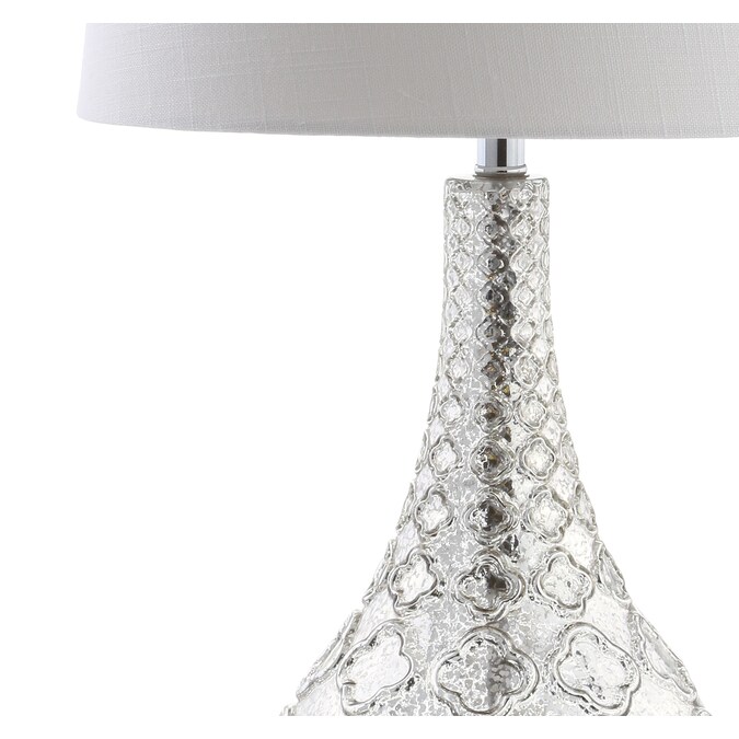 Featuring an antiqued silver finish applied within the lamp’s body, this transitional table lamp boasts modern elegance to complement any contemporary decor. The slightly tapered linen drum shade is smooth and stylish, complementing the textured quatrefoil trellis pattern on the body. Finished in a silk-wrapped cord and chrome finial, it would be lovely on a bedside table or in a living room.