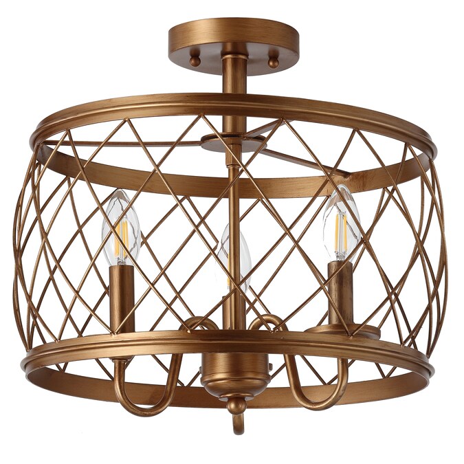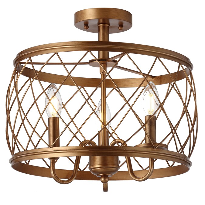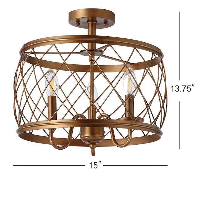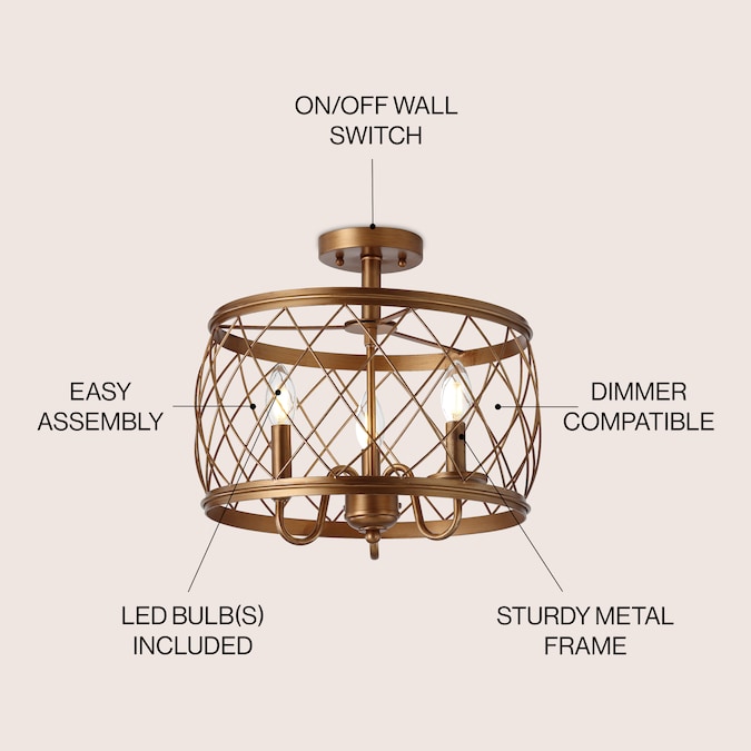 Surrounded by a drum of golden iron, three chandelier bulbs emanate a warm glow, creating a sense of-inwelcome-in suitable to any room in the home. Industrial hardware finds restoration with a fresh finish, creating a look that is rugged but feminine. Easy to assemble, maintain, and clean; this fixture is as functional as it is lovely.
