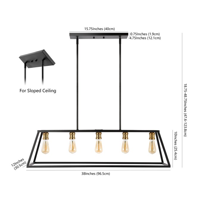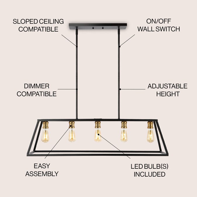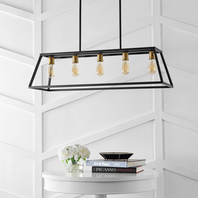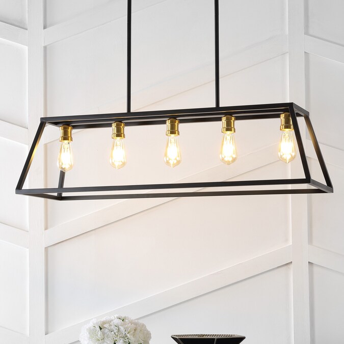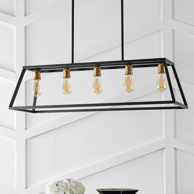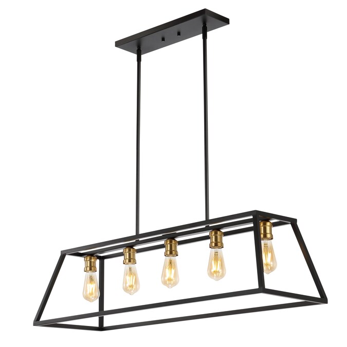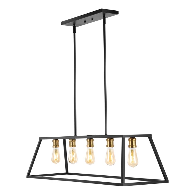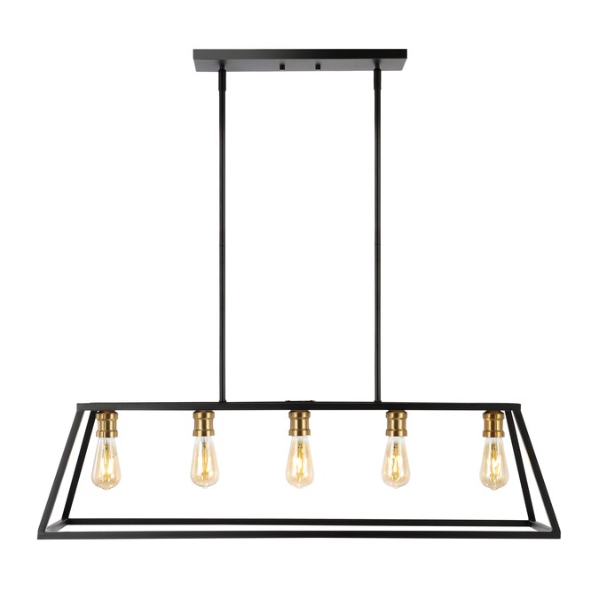 Perfectly sized for over a kitchen island, kitchen table or cottage dining room, this pendant lantern is only about four feet long; The simple black and brass gold metal frame features five Edison-style LED bulbs for an industrial touch; This versatile linear pendant is ideal for modern, minimalist dining rooms as well as rustic, industrial spaces