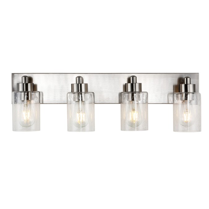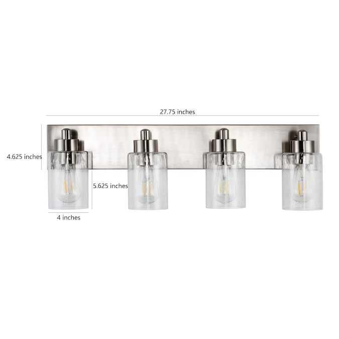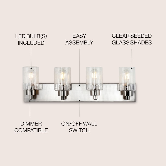 Elevate your bath vanity with our modern take on a classic mid-century wall light; Four LED bulbs are included, casting a warm glow and providing plenty of light; The pewter-inspired nickel finish adds Art Deco sparkle, and clear bubble-glass shades add to the elegant vintage style; This vanity light can be installed either facing up or down