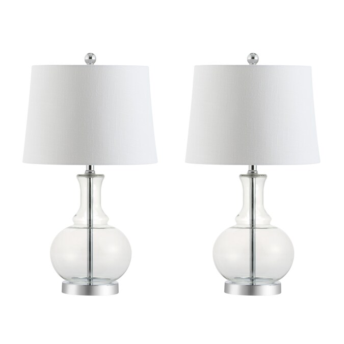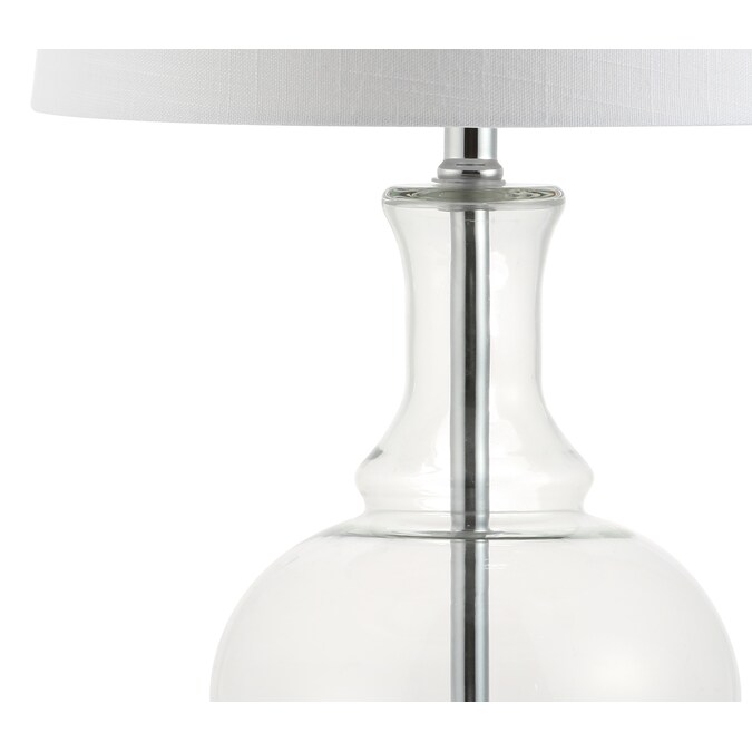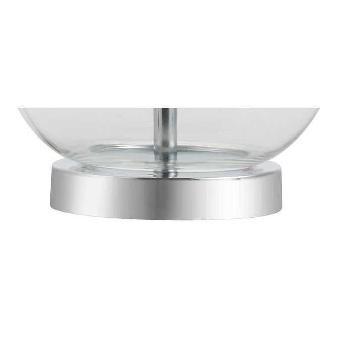 Classic curves accentuate hand-blown glass in this perfect combination of classic and contemporary. In an eye-catching clear glass and chrome base, rod, and finial, no design detail was overlooked. Softened with a white linen drum shade and finished with a silk-wrapped cord, the style extends all the way to the plug.