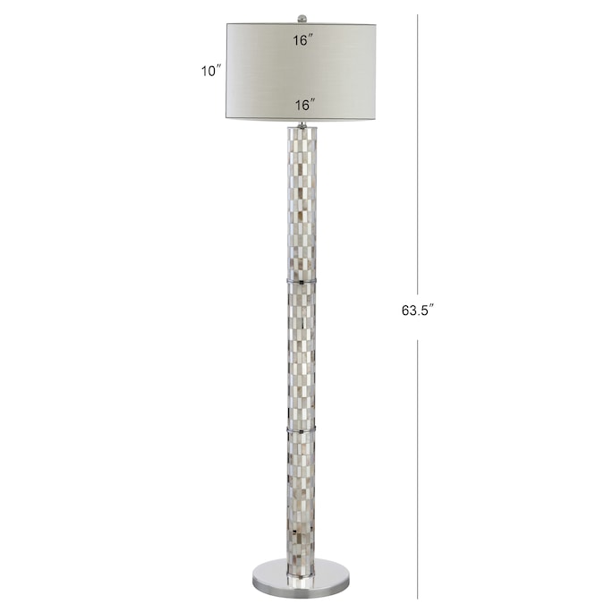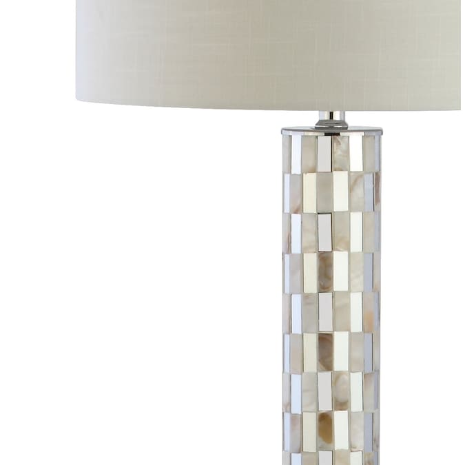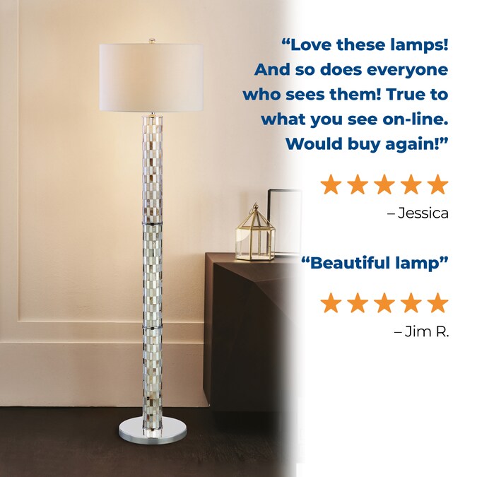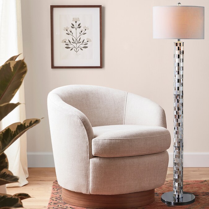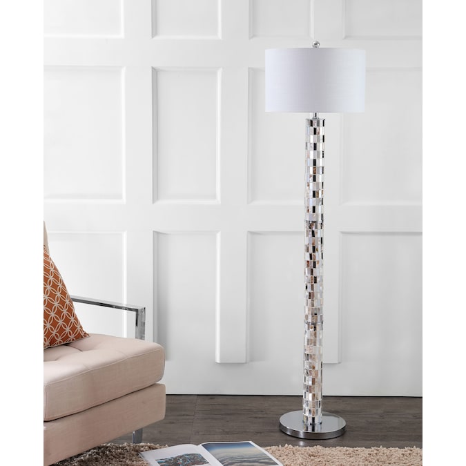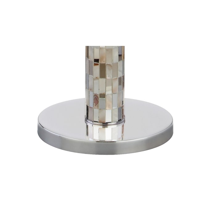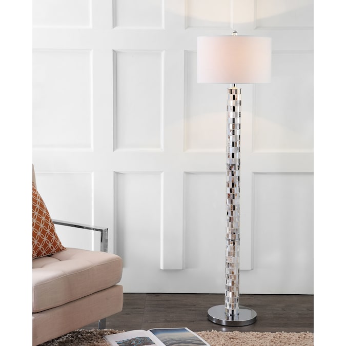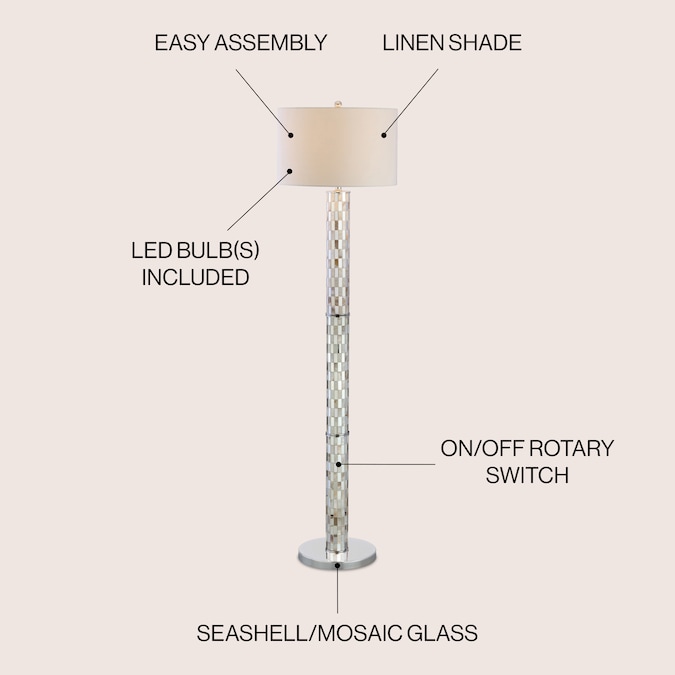 A mother of pearl and mirrored tile mosaic adds a luxurious glimmer to this beautiful floor lamp design. A chromed metal base and accents add shine to the base and finial. Topped with a round white linen fabric shade for a crisp look.