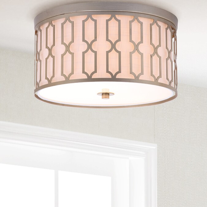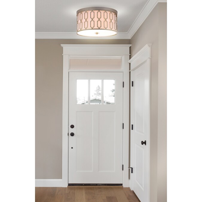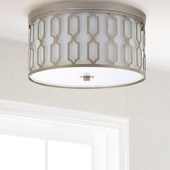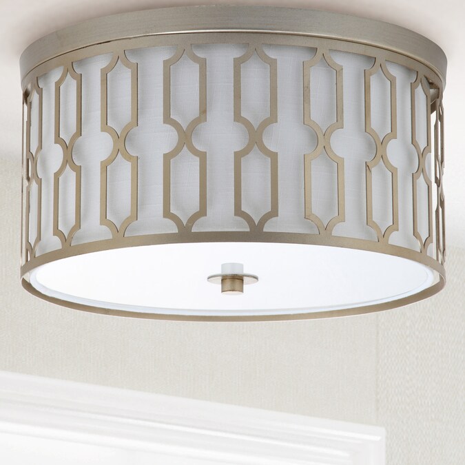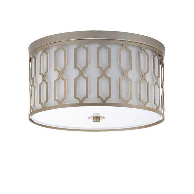 A delicate, linked geometric metal frame surrounds a round white linen shade in this soft gold flush mount ceiling light. The glow of its three bulbs highlights the intricate fretwork of the link design. This lux transitional look would work well in both high and low ceilings and with any style of decor.