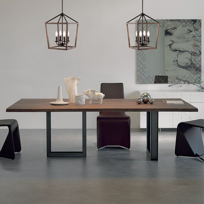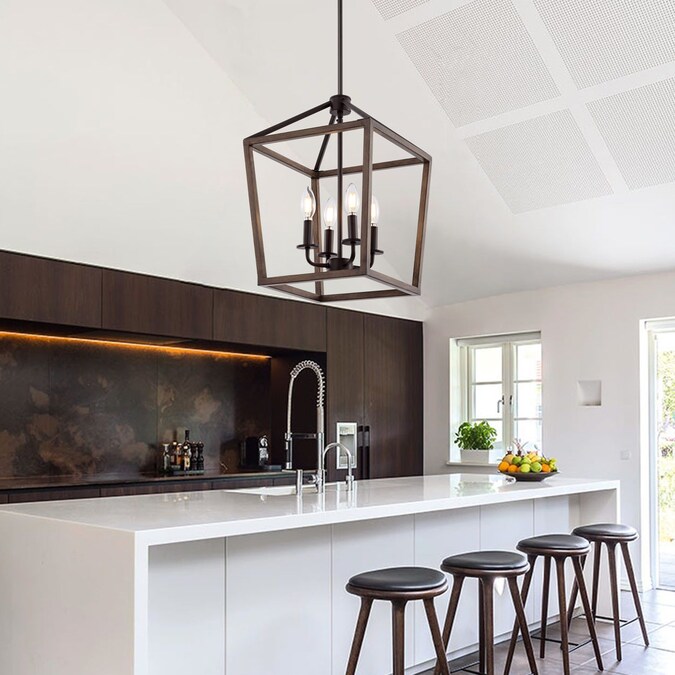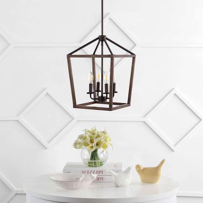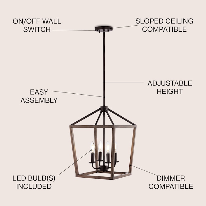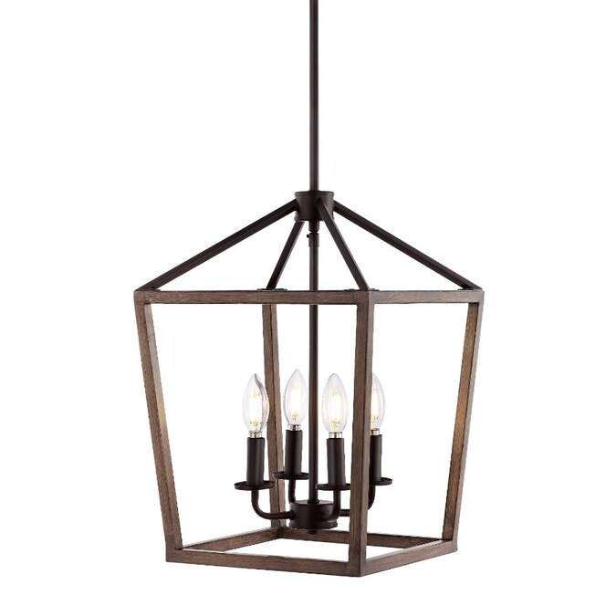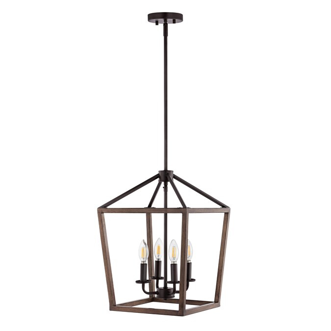 Perfectly sized for a kitchen island, small dining table, entry or hallway, the traditional silhouette of our pendant lantern is updated by a faux-wood finish accented with bronze. The open frame contains four candles with LED bulbs that provide warm light for a vintage touch. With its adjustable chain, this versatile lantern is ideal for a modern farmhouse kitchen, rustic entry, or traditional foyer.