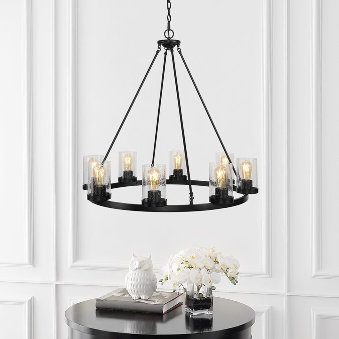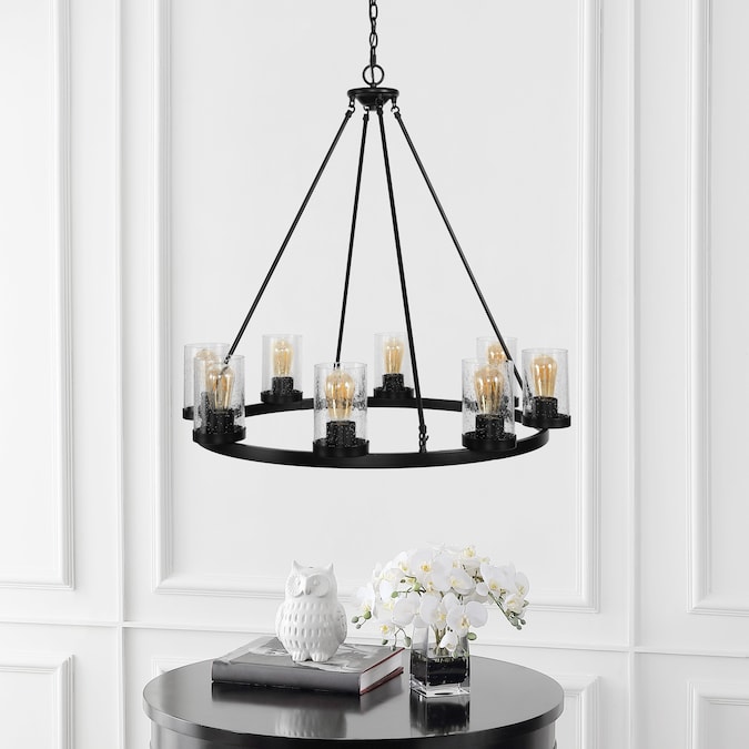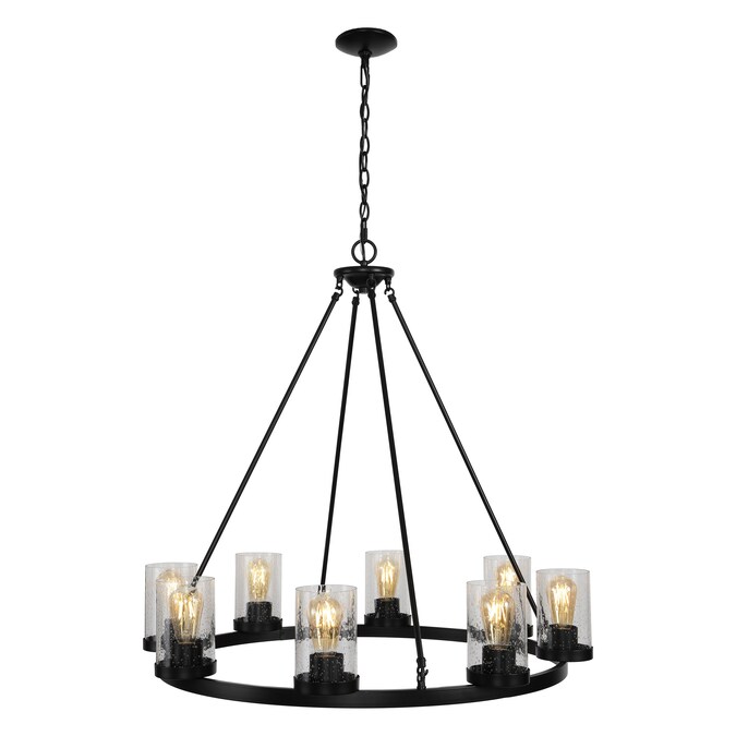 Perfectly sized for an entry, over kitchen table, or in a cottage dining room, this wrought-iron style chandelier features LED candles with vintage glass shades. An oil-rubbed bronze finish completes the Old World look. Use this versatile pendant chandelier in your Tuscan or Spanish style home, or to add character to a rustic, industrial space.