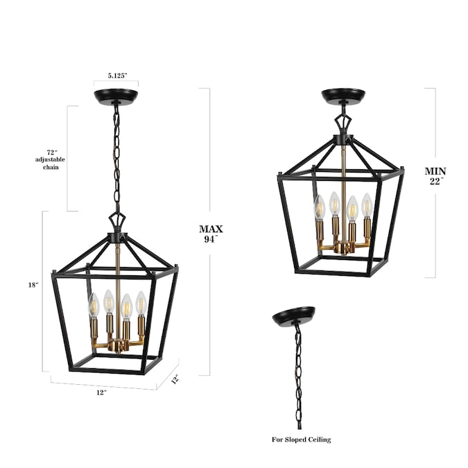 This classic lantern pendant light features a metal caged frame of negative space with exposed bulbs that illuminate from within the center. The shape of the fixture is inspired by iconic street oil lanterns. The pendant light suspends from a chain link that is adjustable to allow the fixture to hang only 22″down, or up to 94″ from your ceiling, where it anchors with a round metal canopy.