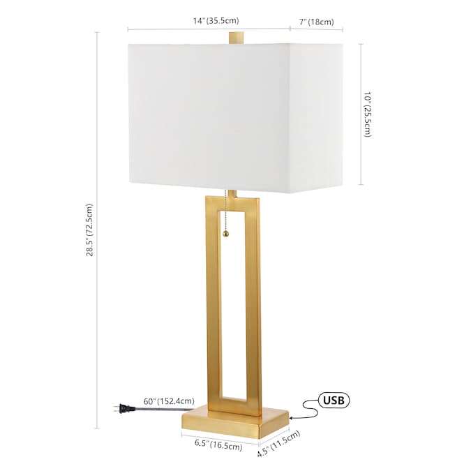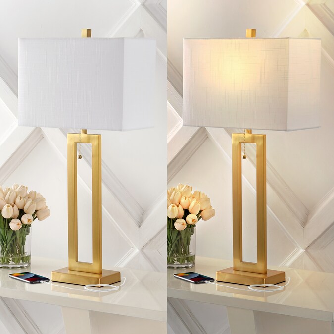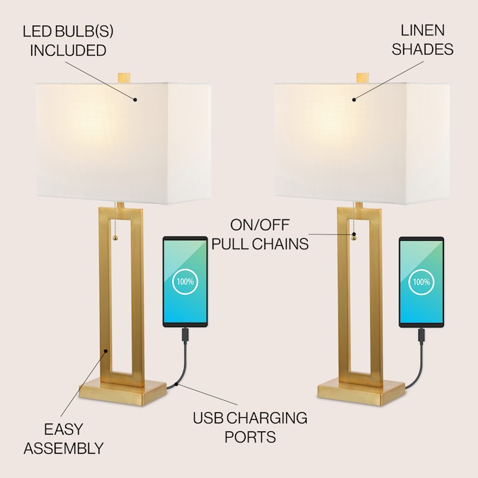 A sleek metal finish and square linen shades give this pair of lamps a clean, modern look; Perfect for resort and office interiors, each lamp includes a USB port and LED bulb for bright, warm light; Use these geometric lamps to add understated style to a bedroom, living room, or entry console