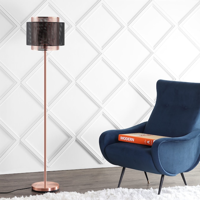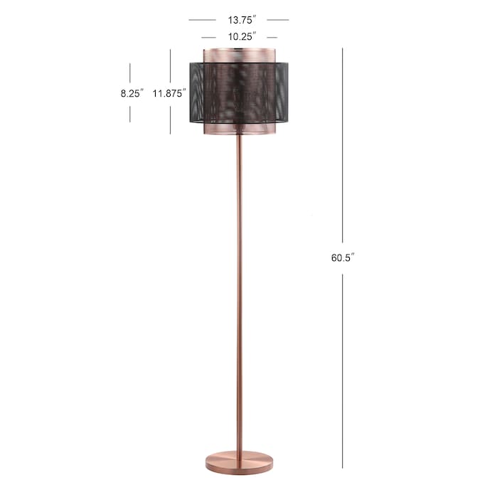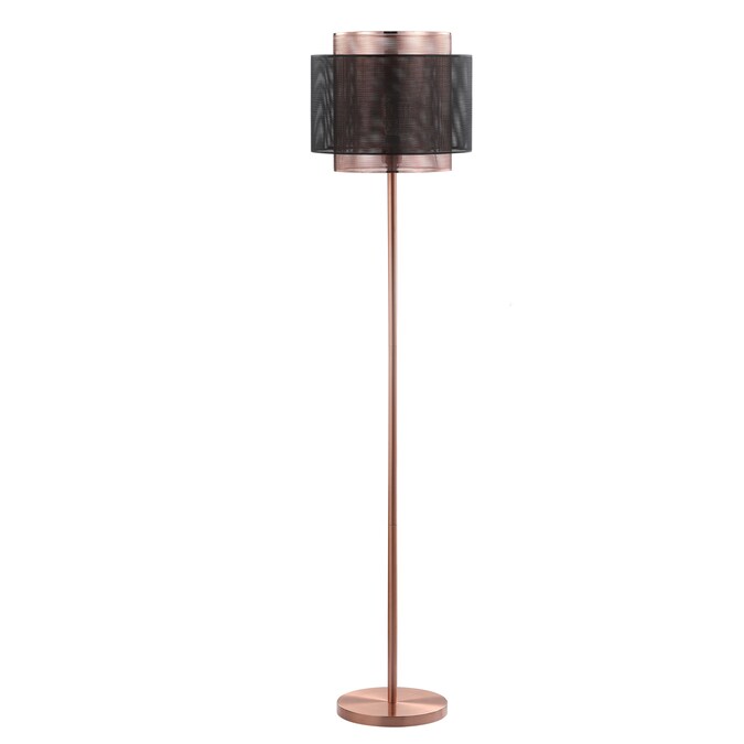 This modern metal floor lamp combines two finishes, copper and blackened metal, to stunning effect. Layered mesh drums allow enough light through to give a subtle glow, illuminating but not overpowering your space. The ideal height for beside a chair or sofa, we love utilizing this floor lamp for a home office or living space.