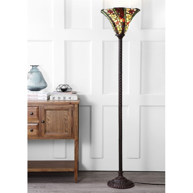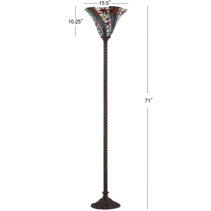 One of the finest techniques to come out of the Art Nouveau movement, the Tiffany-style stained glass shade on this torchiere floor lamp makes for a stunning addition to any space. While steeped in traditional design with it’s barley-twist base and floral motif on the shade, this piece is updated with the functionality expected today — a step-on on/off button, LED bulb compatibility, and a beautiful silk-wrapped cord. Each shade is hand-made by artisans who specialize in the intricate art of stained glass soldering.