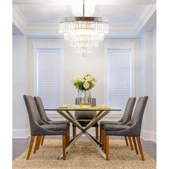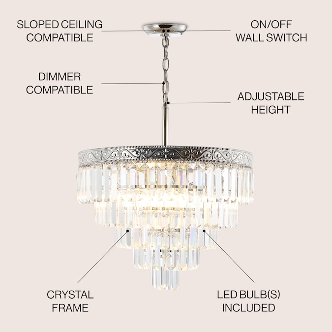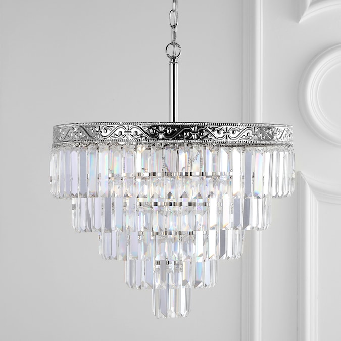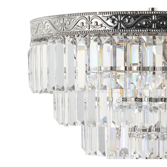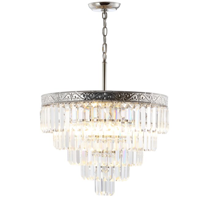 Add timeless elegance to your space with this clear crystal chandelier and its sparkling shade made from faceted rectangles. A band of polished nickel metal adorns the top of the tiered, upside down cake design. This striking accent brightens your home with 4 lights and is compatible with any 40w bulbs, including CFL or LED.
