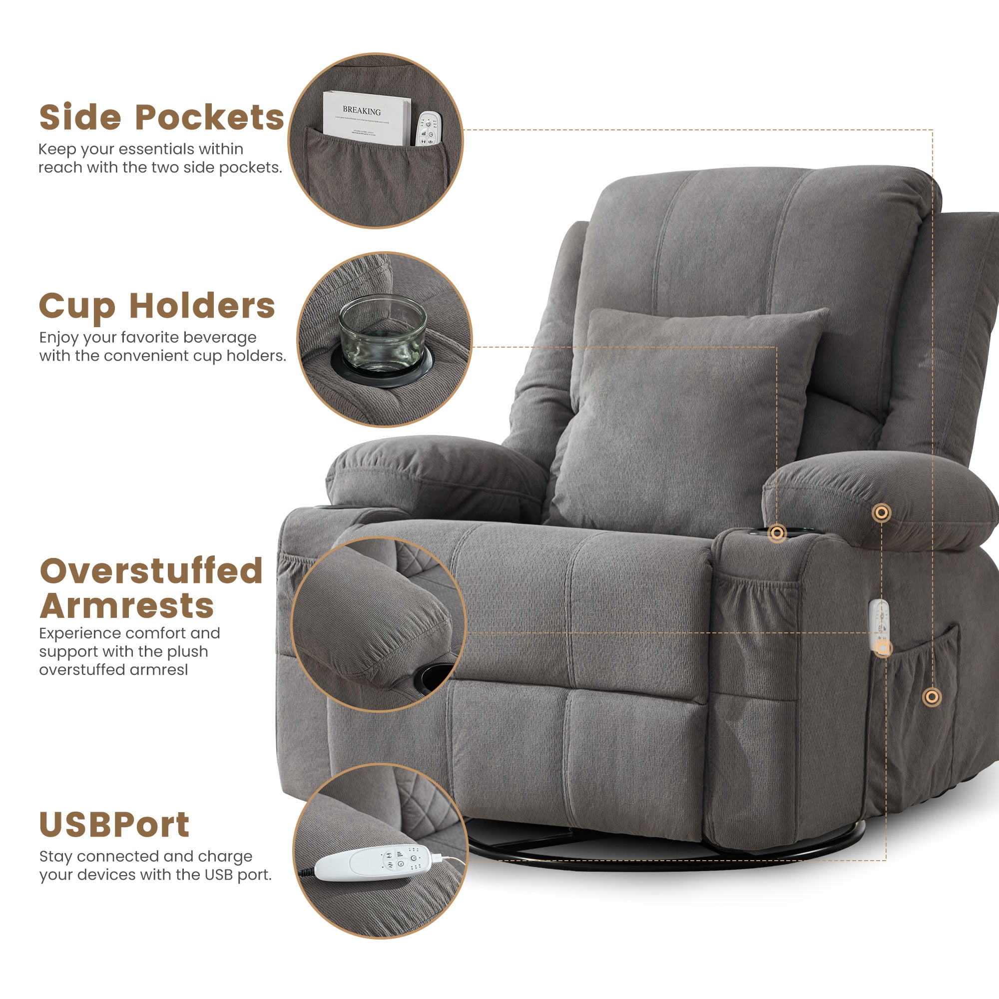 JONPONY Swivel Rocker Recliner Chair with 4 Point Back Kneading Massage and Seat Heat Lounge Chair for Living Room with Side Pockets, 2 Cup Holders,USB Charge Port,PU Gray