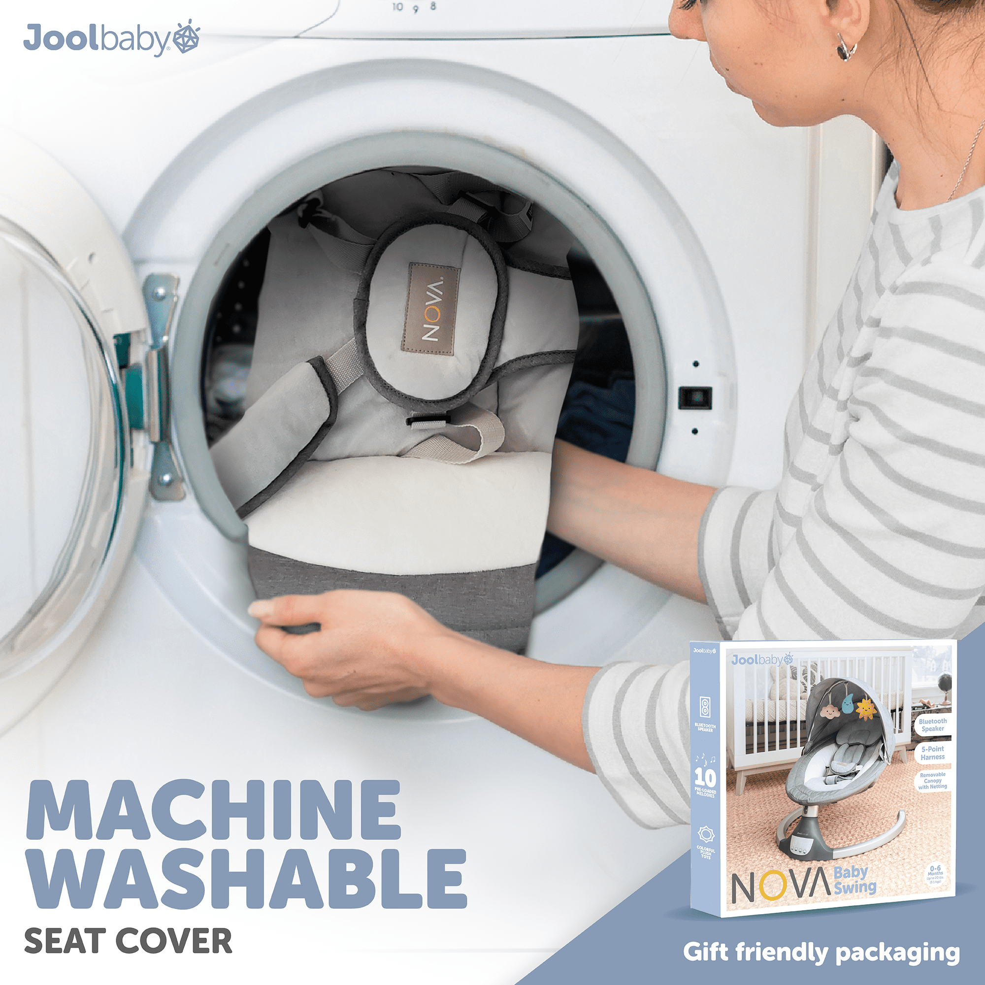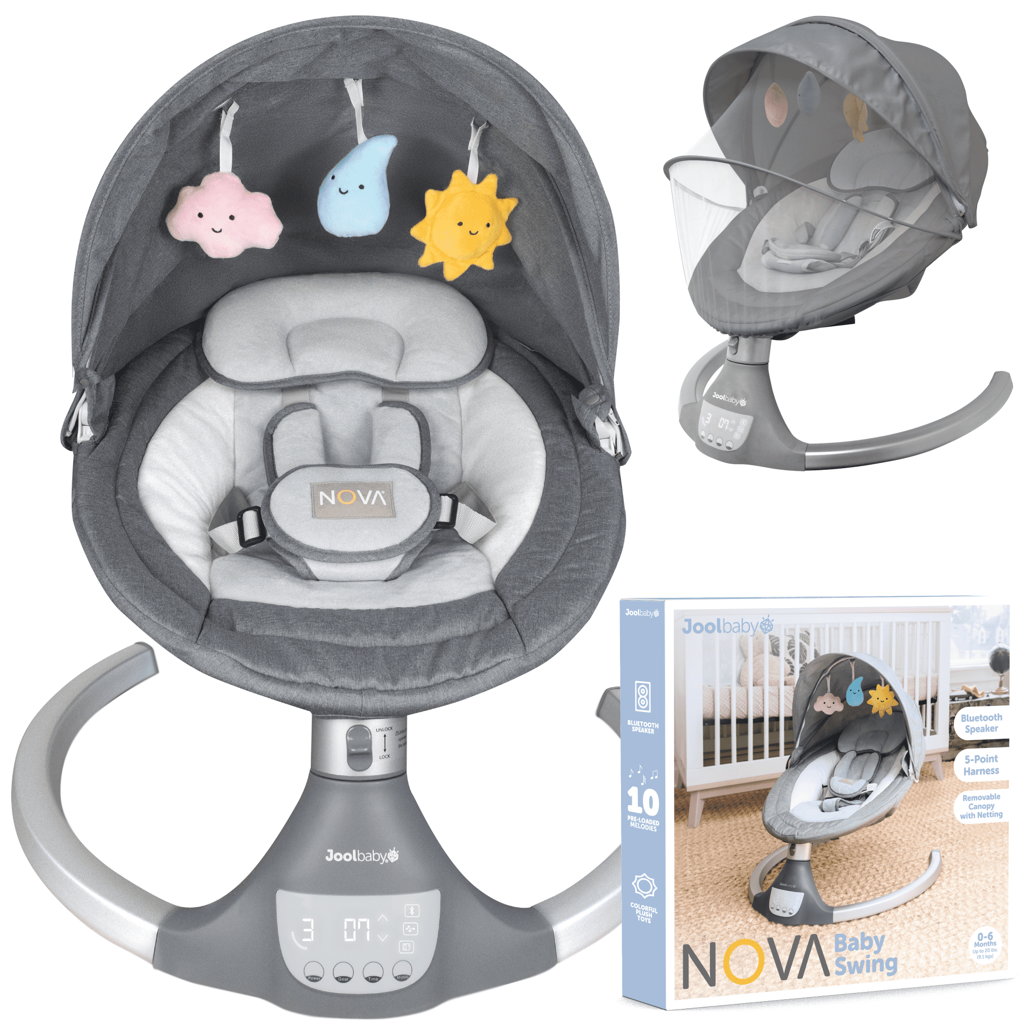 SIDE-TO-SIDE MOTION: The Nova baby swing features 5 levels of side-to-side swaying motion. The higher the level, the wider the range of motion. BLUETOOTH SPEAKER: Stream your favorite music for baby using the built-in Bluetooth speaker or USB port, or choose the 10 preset melodies that come with the swing. EASY TO ASSEMBLE: Put it together with just a few clicks—no tools required. LIGHTWEIGHT & PORTABLE: At just 7.25 lbs. and with a small frame, it’s easy to set up wherever you want it. REMOVABLE CANOPY & NETTING: Removable canopy provides shade, while the removable netting helps protect baby from insects and pets.