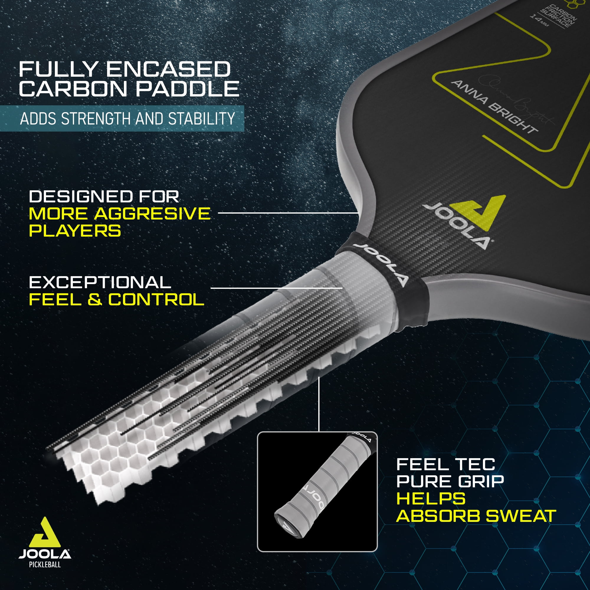 OFFICIAL SPONSOR OF TOP-RANKED FEMALE PICKLEBALL PLAYER ANNA BRIGHT & THE PPA TOUR: An innovator & global leader in table tennis for 70+ years, JOOLA teams up with Anna Bright to design a new line of pickleball equipment to perform at the highest level. CHARGED CARBON SURFACE TECHNOLOGY: Newest innovation that strengthens the paddle & provides a crisp feel with greater energy return. Creates a poppier response with impressive feedback for abetter feeling of the ball coming off the face of the paddle. FULLY ENCASED IN CARBON FOR DURABILITY: Carbon fiber pickleball paddle with extreme strength & stability. Stands up to aggressive play & keeps the paddle consistent across its life. Length 16″ Width 8″ Weight 8.0oz, Grip Length: 5.25″, USAPA Approved SWEET SPOT OPTIMIZED SHAPE: Specially engineered shape creates a large sweet spot pickleball paddle that adds accuracy and control to your game. The latest Feel-Tec Pure Grip creates a tacky handle while absorbing sweat from your palms. ANNA BRIGHT SIGNATURE PADDLE: The top women’s pro player Anna Bright uses the JOOLA Scorpeus to highlight her fast hands & aggressive style of play. You’ll quickly see why Anna chose this paddle to help her dominate women’s pickleball.