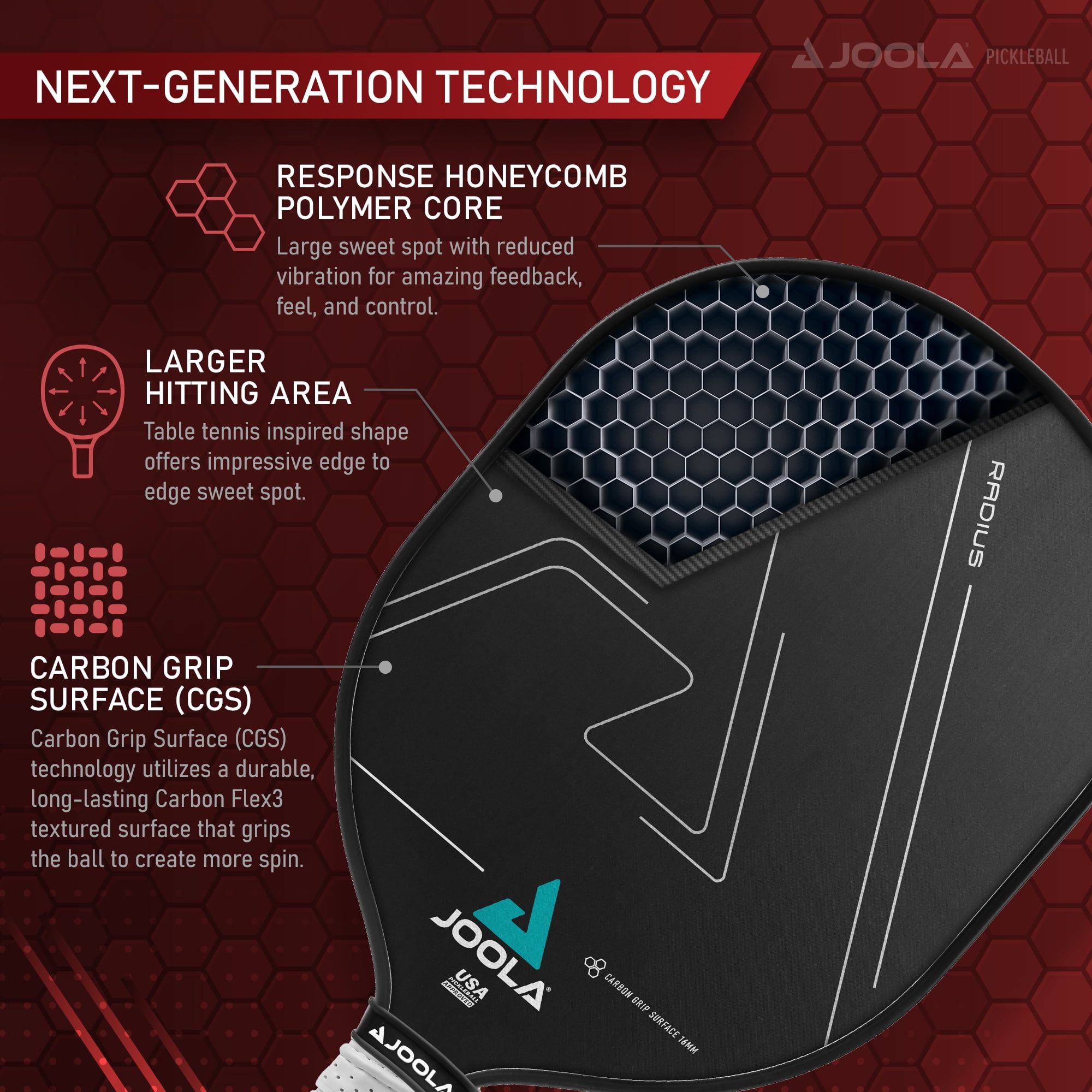 OFFICIAL SPONSOR OF THE PPA TOUR & WORLD #1 PICKLEBALL PLAYER BEN JOHNS: Building upon its 70+ years as a global leader in table tennis, JOOLA now joins with Ben Johns to develop the next generation of pickleball equipment. BRINGING JOOLA’s OLYMPIC HERITAGE TO PICKLEBALL: A ping pong inspired shape offering our largest edge to edge sweet spot of any pickleball paddle and a textured surface designed specifically for more spin. CARBON GRIP SURFACE (CGS) IS A GAME CHANGER: JOOLA’s USAPA Approved CGS technology utilizes a durable, long-lasting Carbon Flex3 textured surface that grips the ball to create more spin on every serve, drive, and dink. RESPONSE POLYPROPYLENE HONEYCOMB CORE ADDS DURABILITY & PERFORMANCE: 16mm Response polymer core provides reduced vibration & increases control. The honeycombs compress for better feel while their cell shape & material prolong the life of the racket. SWING WITH CONFIDENCE AND COMFORT: Our Sure-Grip technology offers a perforated anti-slip ridge grip, reduces moisture from the surface of the handle for an enhanced grip and increased shock absorption.