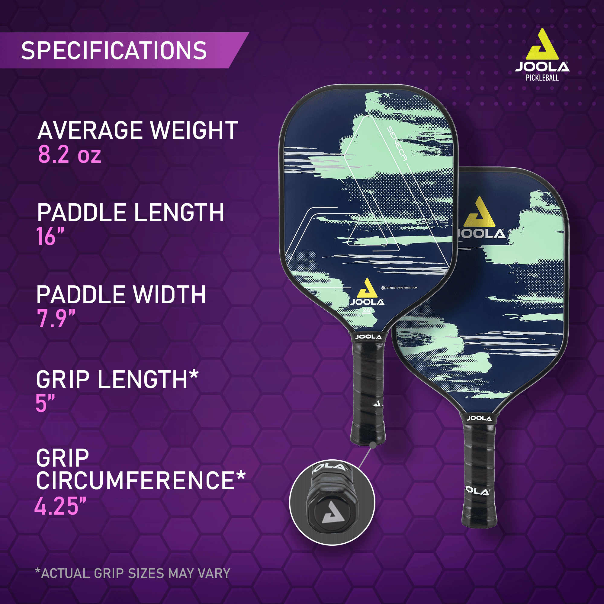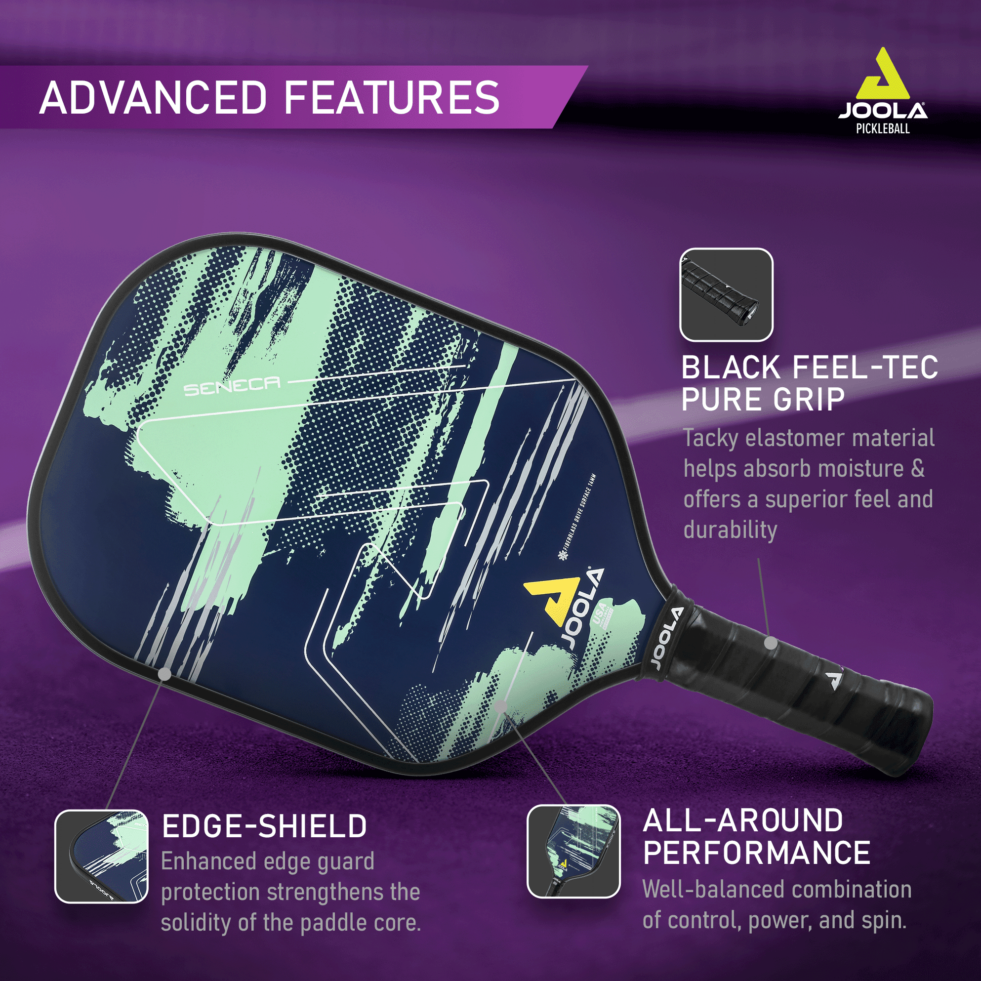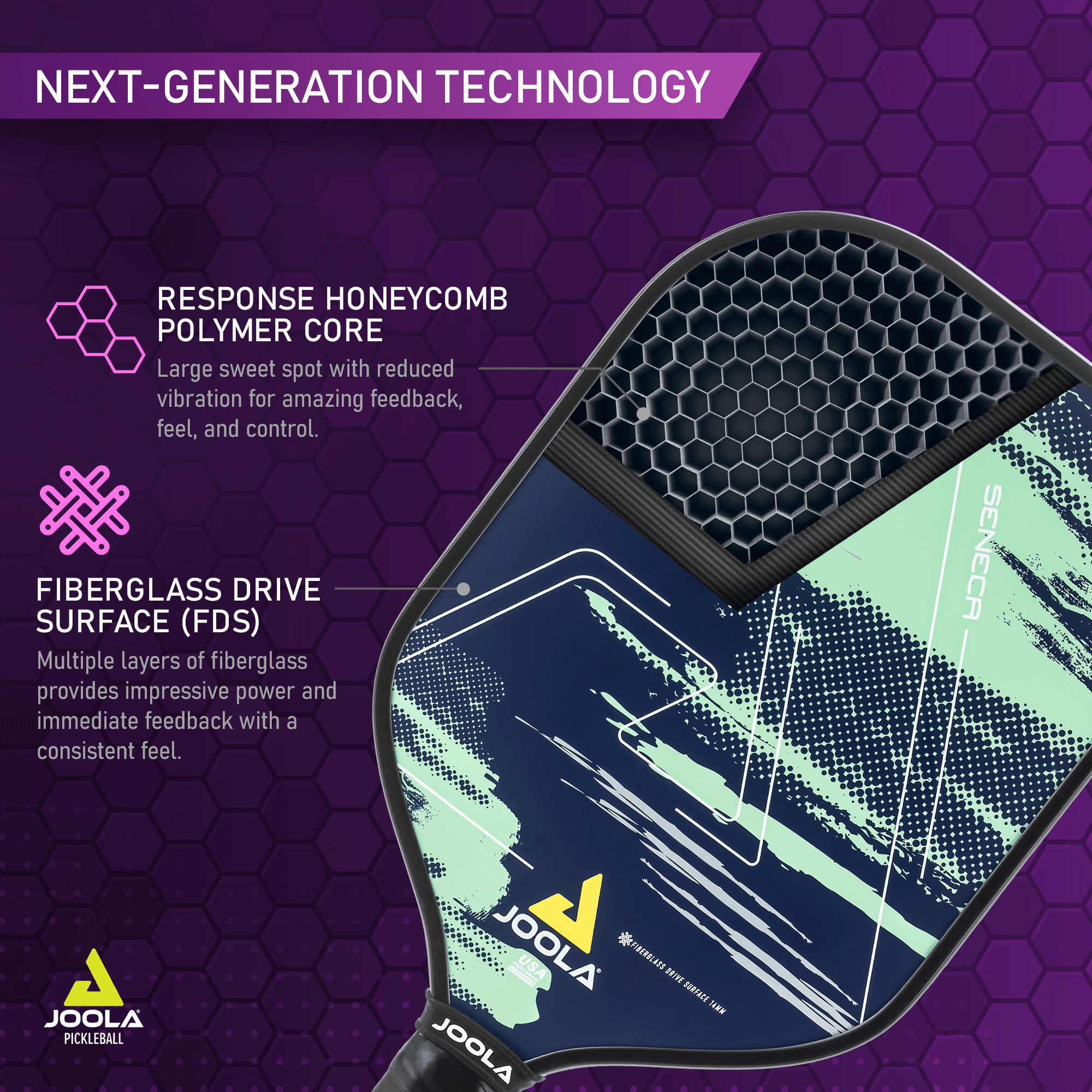 OFFICIAL PADDLE SPONSOR OF WORLD #1 PICKLEBALL PLAYER BEN JOHNS & THE PPA TOUR: An innovator & global leader in table tennis for 70+ years, JOOLA teams up with Ben Johns to create a new line of pickleball equipment that will forever change the game. FIBERGLASS DRIVE SURFACE: High performance fiberglass face for maximum power. Polymer honeycomb core provides balance of feel and control. Top performance paddle with eye-catching design. SWING WITH CONFIDENCE AND COMFORT: Black Feel-Tec Pure Grip technology offers a tacky feel for enhanced grip on your pickleball raquette. Grip has increased shock absorption for ideal comfort which lessens tiredness & allows for longer play. PICKLEBALL PADDLE FOR ADULTS AND KIDS: With tech handed down from JOOLA’s pro paddles, the Seneca is a go to for beginner pickleball players & those looking for a higher rated pickleball paddle. Lightweight for easier, faster swings & less fatigue. RESPONSE POLYPROPYLENE HONEYCOMB CORE ADDS DURABILITY & PERFORMANCE: Response polymer core provides reduced vibration & increases control. The honeycombs compress for better feel while their cell shape & material prolong the life of the racket.