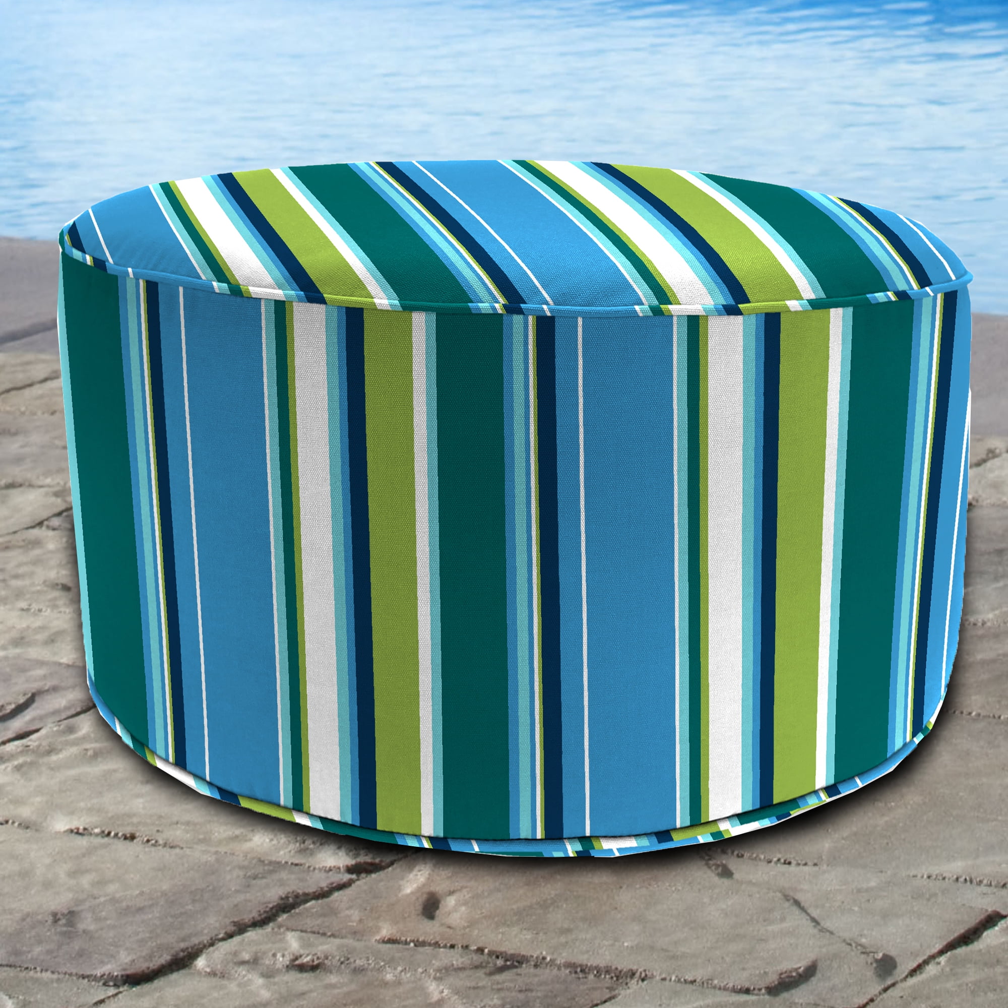 Bring curves, color and comfort to your outdoor decor with this 24″ Round Boxed Edge Outdoor Pouf. Crafted from outdoor fabric, this durable pouf is quick-drying and mildew-, mold-, water- and stain-resistant. Plus, the UV-protected material keeps your pouf looking fresh and prevents fading, even after hours of fun in the sun. Designed for multiple uses, this round pouf can be used alone or stacked as a set. Add instant seating for additional guests, create a safe spot to put your sunglasses and sunscreen, or kick up your feet while soaking up the sun with this versatile pouf ottoman. Lightweight beads inside add soft, shapeable support, while welt detailing outside adds a chic accent to edges and protects seams for added durability in open-air living areas. Even better, this compact outdoor pouf adds style without adding maintenance, thanks to the easy-care fabric that requires only a quick spot cleaning with soap, water and a soft cloth to stay looking new.