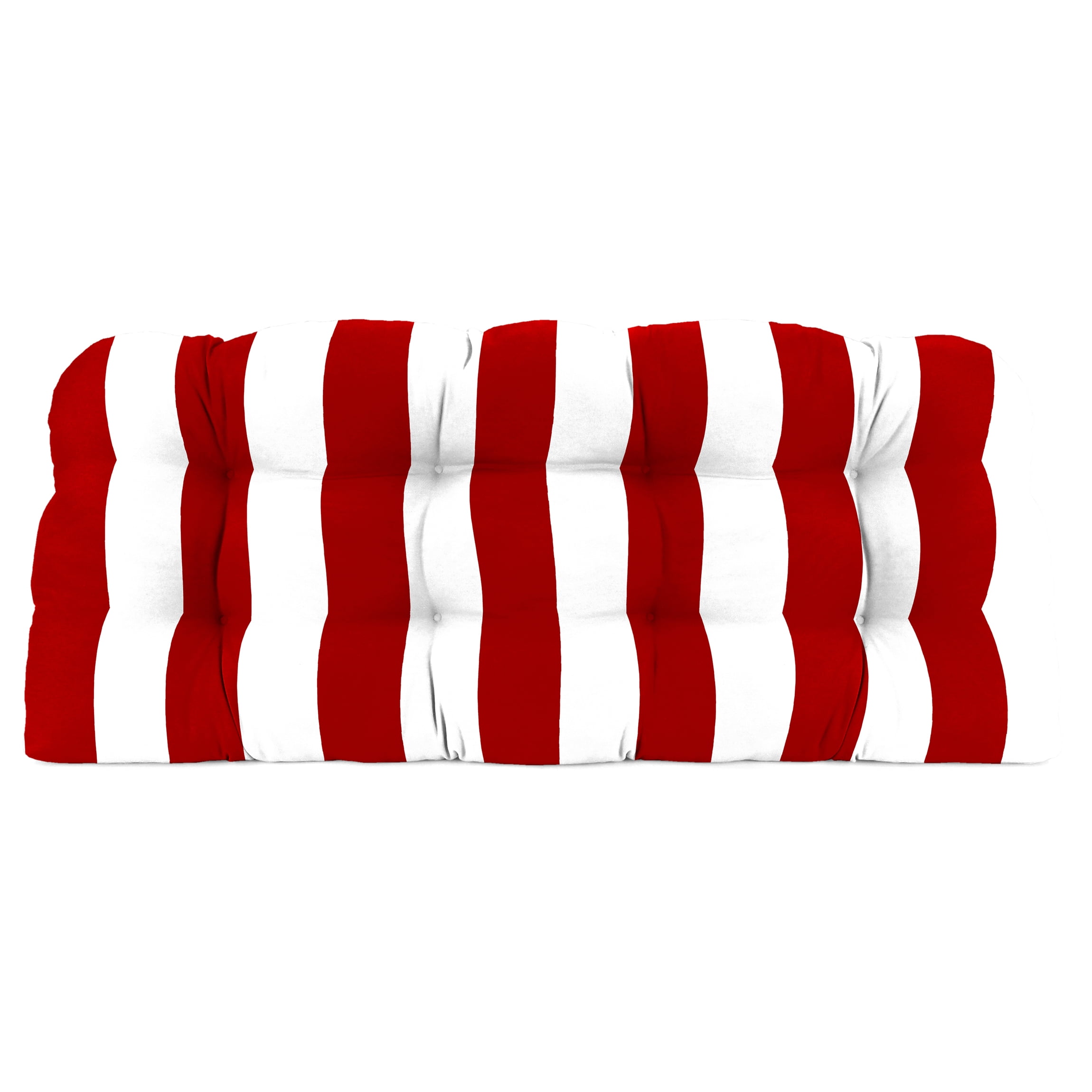 Jordan Manufacturing 3-Piece Cabana Red Stripe Tufted Outdoor Cushion with 1 Wicker Bench Cushion and 2 Wicker Seat Cushions Three-piece outdoor wicker cushion set. Chair cushion dimensions 18″ width x 18″ depth x 4″ thick; Bench cushion dimensions 44″ width x 18″ depth x 4″ thick RESISTS FADING, MILDEW, WATER AND STAINS. Designed for outdoor use, the durable fabric protects against damage from rain, spills or sunlight, with up to 500 hours of UV protection to prevent fading. COMFORTABLE AND DURABLE. Filled with blown polyester fiber for soft support and superior resilience. UPGRADE YOUR OUTDOOR SPACE. Add this three-piece wicker cushion set to give your patio or porch an instant makeover. ALL IN THE DETAILS. Rows of sewn tufts maintain each cushion’s shape and add a decorative touch to outdoor furniture. EASY TO CLEAN. Keep your wicker cushions looking new by spot cleaning with a soft cloth, mild soap and warm water. VERSATILE DESIGN. Finished on the front and back so the wicker cushion set can be flipped for use on both sides. FINISHED LOOK. French edges add detail at each corner, creating a classic appearance. BETTER FIT. Designed for a tailored fit on most outdoor wicker loveseats, benches and chairs. Actual colors may vary from screen representation