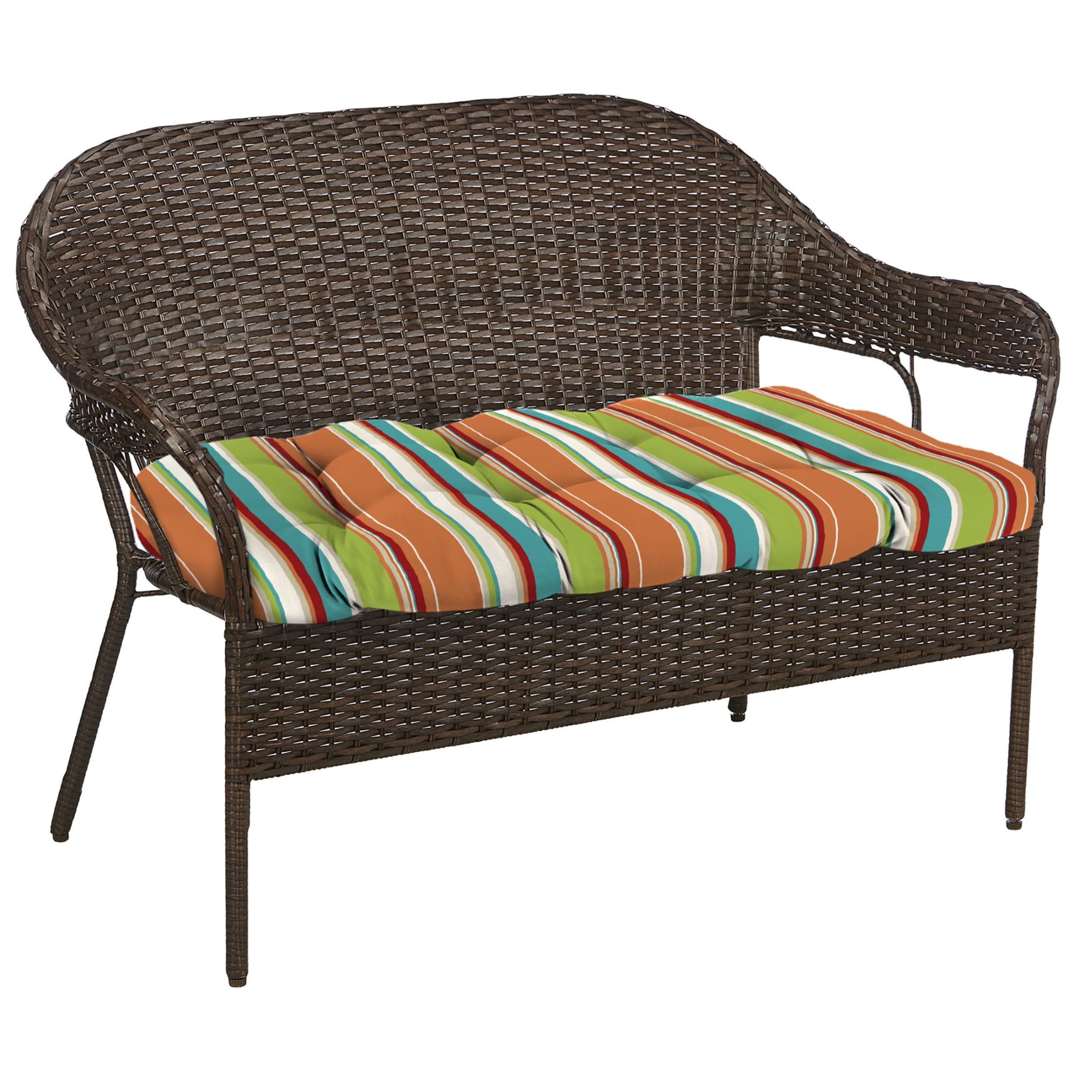 Three-piece outdoor wicker cushion set. Chair cushion dimensions 18″ width x 18″ depth x 4″ thick; Bench cushion dimensions 44″ width x 18″ depth x 4″ thick RESISTS FADING, MILDEW, WATER AND STAINS. Designed for outdoor use, the durable fabric protects against damage from rain, spills or sunlight, with up to 500 hours of UV protection to prevent fading. COMFORTABLE AND DURABLE. Filled with blown polyester fiber for soft support and superior resilience. UPGRADE YOUR OUTDOOR SPACE. Add this three-piece wicker cushion set to give your patio or porch an instant makeover. ALL IN THE DETAILS. Rows of sewn tufts maintain each cushion’s shape and add a decorative touch to outdoor furniture. EASY TO CLEAN. Keep your wicker cushions looking new by spot cleaning with a soft cloth, mild soap and warm water. VERSATILE DESIGN. Finished on the front and back so the wicker cushion set can be flipped for use on both sides. FINISHED LOOK. French edges add simple detail at each corner, creating a classic appearance. BETTER FIT. Designed for a tailored fit on most outdoor wicker loveseats, benches and chairs. Actual colors may vary from screen representation