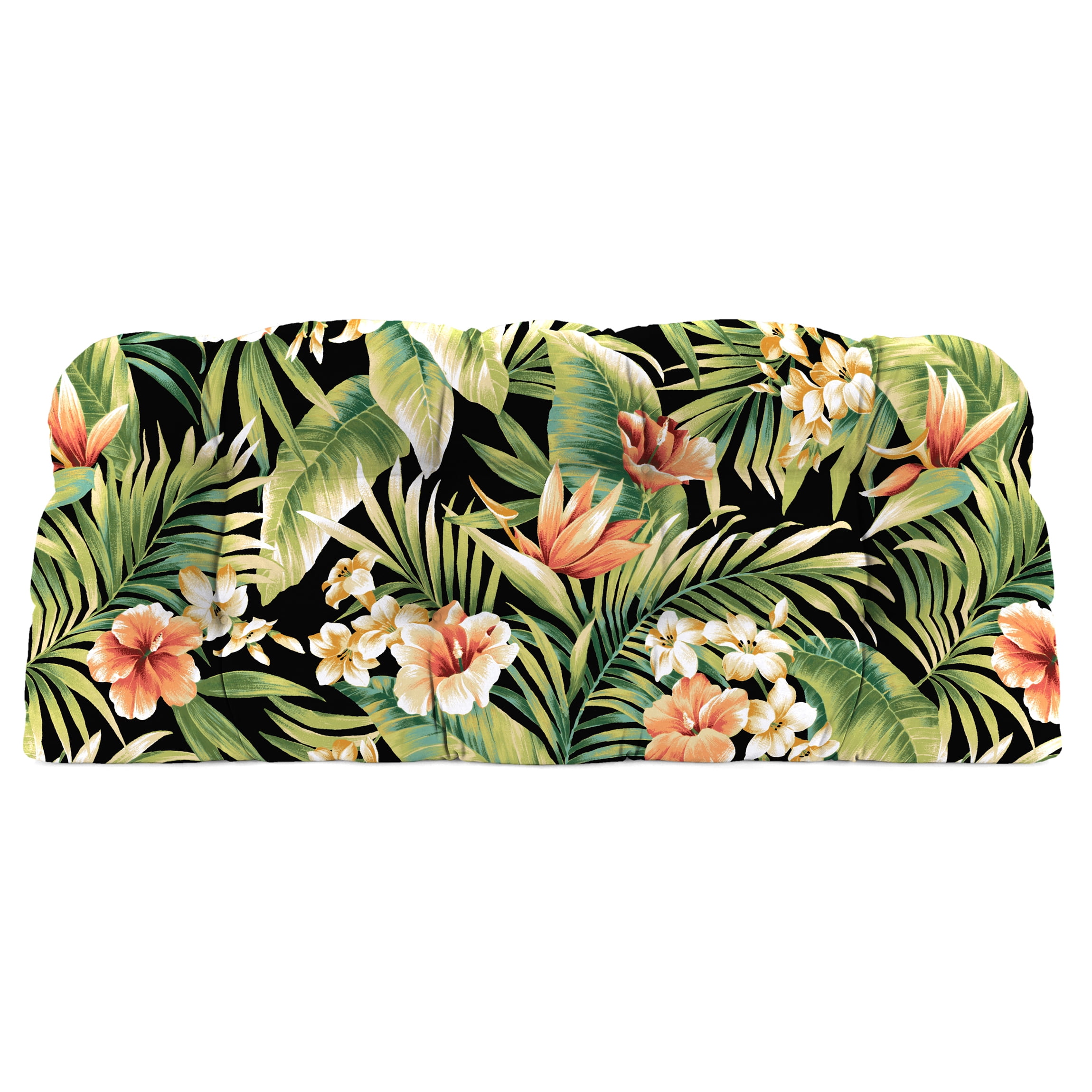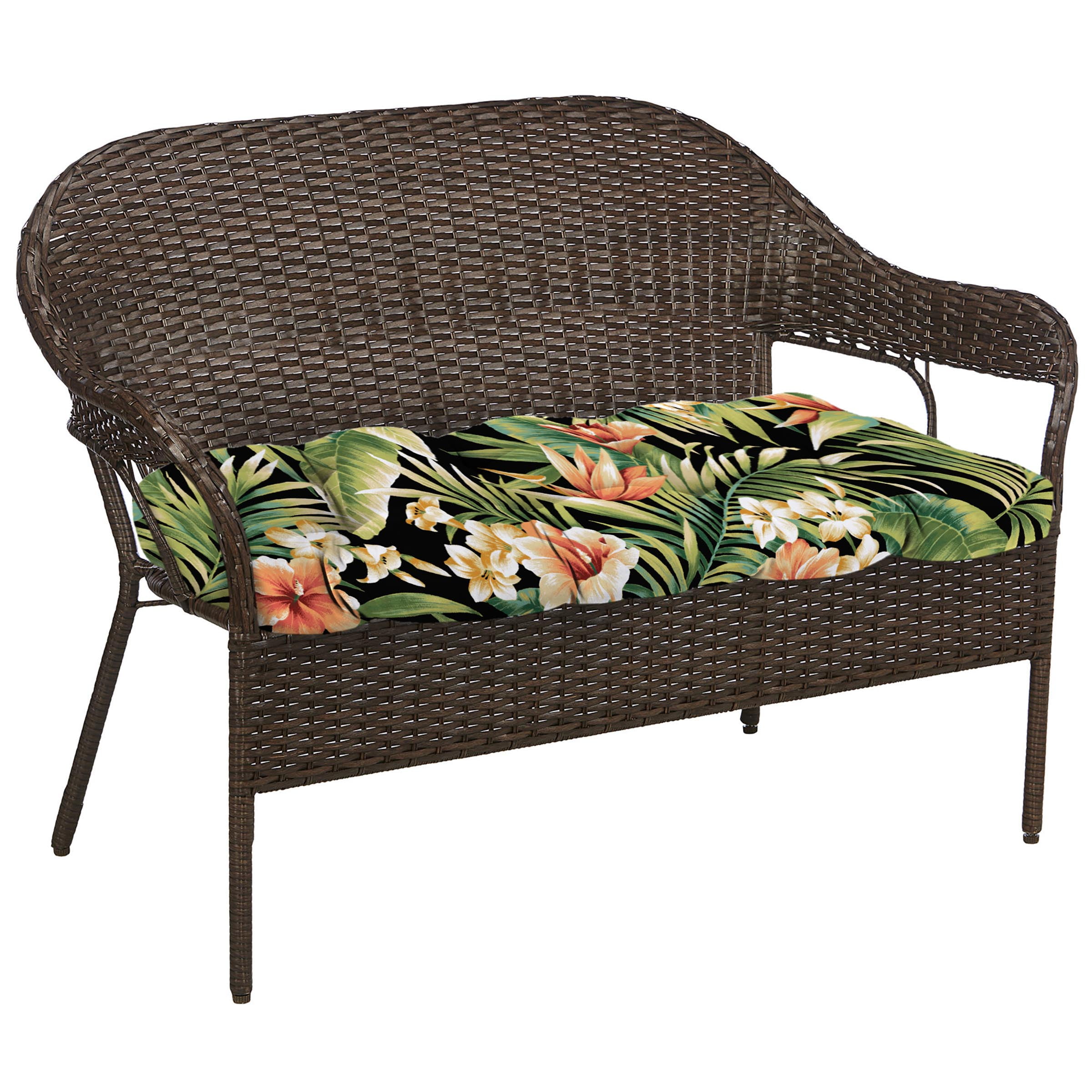Jordan Manufacturing 3-Piece Cypress Midnight Black Leaves Tufted Outdoor Cushion with 1 Wicker Bench Cushion and 2 Wicker Seat Cushions Three-piece outdoor wicker cushion set. Chair cushion dimensions 18″ width x 18″ depth x 4″ thick; Bench cushion dimensions 44″ width x 18″ depth x 4″ thick RESISTS FADING, MILDEW, WATER AND STAINS. Designed for outdoor use, the durable fabric protects against damage from rain, spills or sunlight, with up to 500 hours of UV protection to prevent fading. COMFORTABLE AND DURABLE. Filled with blown polyester fiber for soft support and superior resilience. UPGRADE YOUR OUTDOOR SPACE. Add this three-piece wicker cushion set to give your patio or porch an instant makeover. ALL IN THE DETAILS. Rows of sewn tufts maintain each cushion’s shape and add a decorative touch to outdoor furniture. EASY TO CLEAN. Keep your wicker cushions looking new by spot cleaning with a soft cloth, mild soap and warm water. VERSATILE DESIGN. Finished on the front and back so the wicker cushion set can be flipped for use on both sides. FINISHED LOOK. French edges add detail at each corner, creating a classic appearance. BETTER FIT. Designed for a tailored fit on most outdoor wicker loveseats, benches and chairs. Actual colors may vary from screen representation