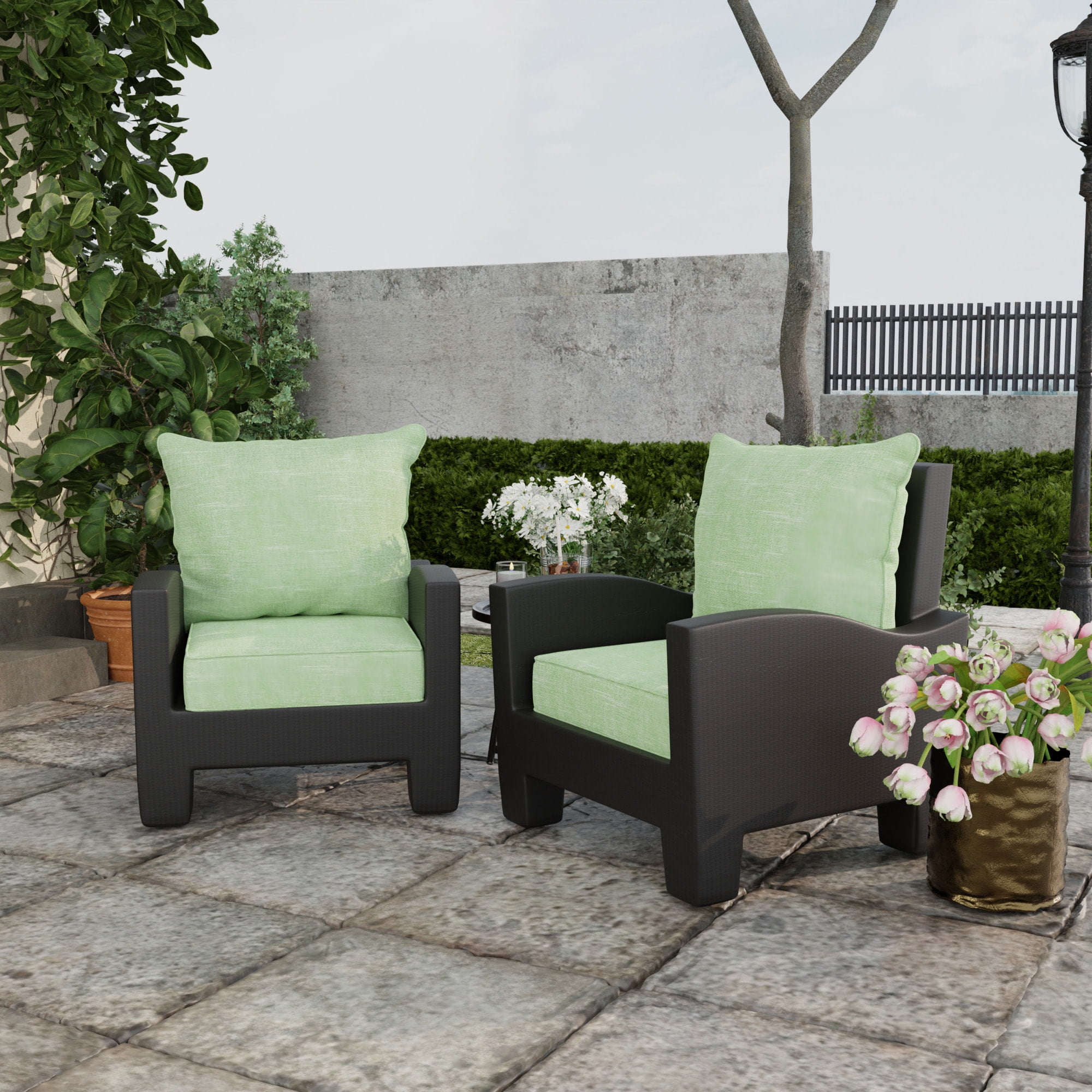 One 2-piece outdoor chair cushion. Seat dimensions 24″ width x 46.5″ length x 6″ thick; Back 22.5″ height; Seat 24″ depth RESISTS FADING, MILDEW, WATER AND STAINS. Designed for outdoor use, the durable fabric protects against damage from rain, spills or sunlight, with up to 500 hours of UV protection to prevent fading. COMFORTABLE AND DURABLE. Filled with a combination of medium-density foam and polyester fiber to add soft support and retain the cushion set’s shape. UPGRADE YOUR OUTDOORS. Add this cushion set to instantly and effortlessly refresh the style of your sunroom, front porch or patio. EASY TO CLEAN. Keep your cushions looking new by spot cleaning with a soft cloth, mild soap and warm water. VERSATILE DESIGN. Finished on the front and back so the cushions can be flipped for use on both sides. FINISHED LOOK. Boxed edges with a decorative welt lend classic style to the seat cushion, while knife edges create crisp corners to the back cushion. BETTER FIT. Designed for a tailored fit on most outdoor deep seat chairs. Actual colors may vary from screen representation