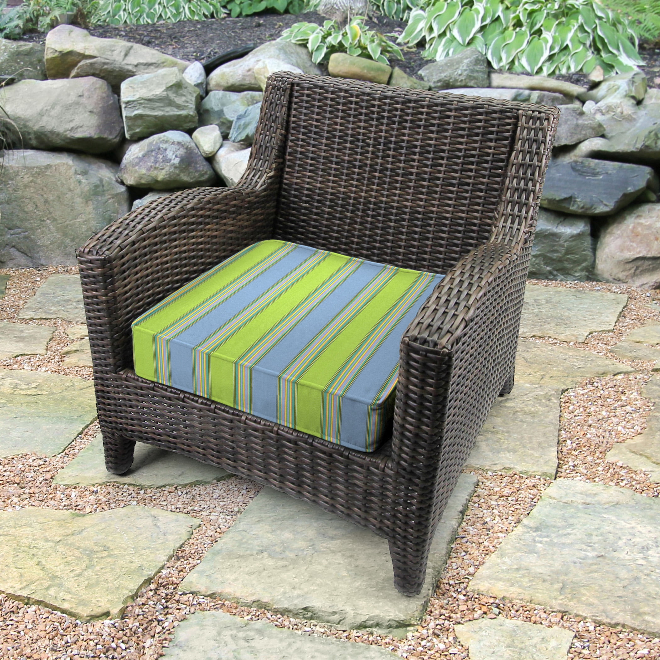 22.5″ length x 22.5″ width x 5″ thick outdoor seat cushion HIGH-QUALITY, ALL-WEATHER MATERIAL. Designed for outdoor use, the durable acrylic fabric repels water and resists mildew, mold and stains. The UV-protective solution dyes also prevent fading from up to 1,500 hours of sunlight exposure. COMFORTABLE AND DURABLE. Filled with layered polyester fiber to add soft support and retain the cushion’s shape. COLOR CHANGES EVERYTHING. Give your patio, sunroom, front porch or backyard a more stylish look with a new deep seat cushion. SECURE TIES. Corner fabric ties keep the seat cushion in place on your outdoor furniture. EASY TO CLEAN. Keep your patio cushion looking new by spot cleaning with a soft cloth, mild soap and warm water. VERSATILE DESIGN. Finished on the front and back so the seat cushion can be flipped for use on both sides. FINISHED LOOK. Boxed edges with a decorative welt create a stylish, structured appearance. BETTER FIT. Designed for a tailored fit on most outdoor deep seat chairs. Actual colors may vary from screen representation