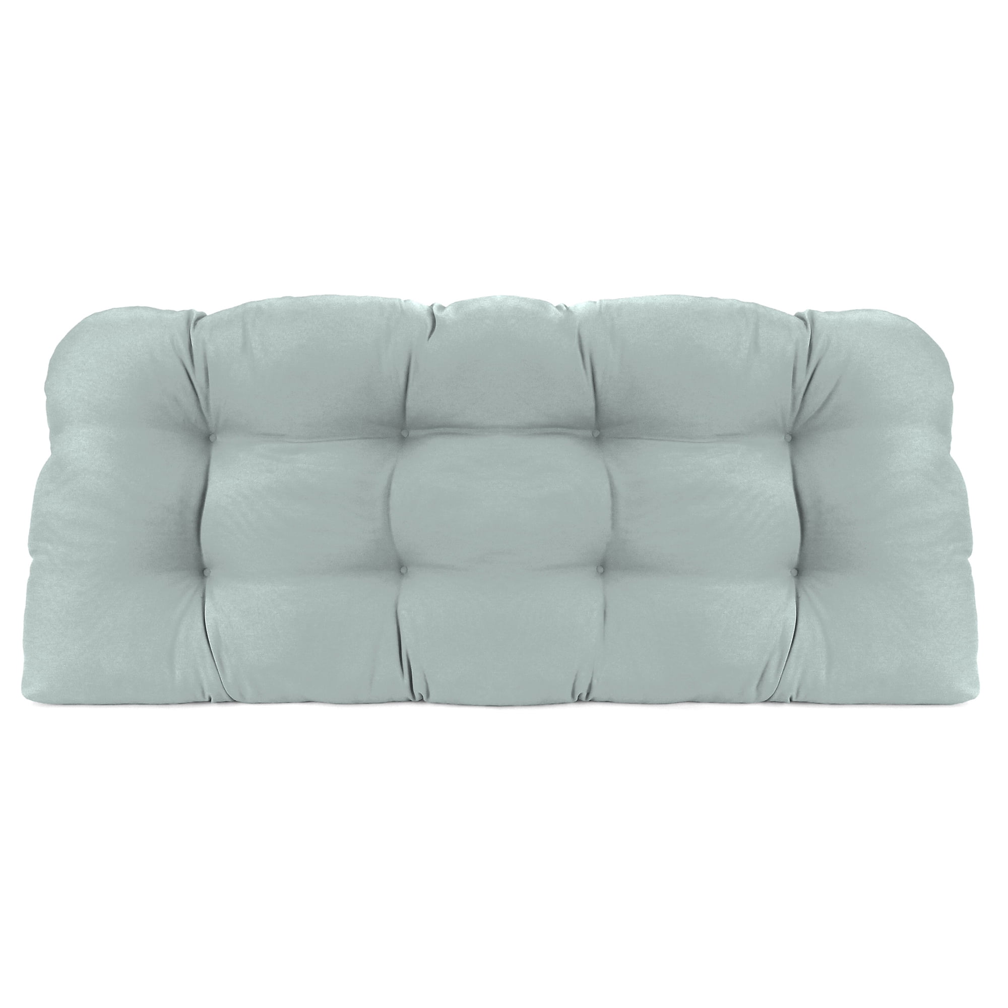 Jordan Manufacturing Sunbrella 44″ x 18″ Cast Silver Gray Solid Rectangular Tufted Contoured Outdoor Wicker Settee Bench Cushion 44″ width x 18″ depth x 4″ thick outdoor wicker bench cushion HIGH-QUALITY, ALL-WEATHER MATERIAL. Designed for outdoor use, the durable acrylic fabric repels water and resists mildew, mold and stains. The UV-protective solution dyes also prevent fading from up to 1,500 hours of sunlight exposure. COMFORTABLE AND DURABLE. Filled with blown polyester fiber for soft support and superior resilience. UPGRADE YOUR OUTDOOR SPACE. Add this wicker settee cushion to give your patio or porch an instant makeover. ALL IN THE DETAILS. Rows of sewn tufts maintain the cushion’s shape and add a decorative touch to outdoor furniture. EASY TO CLEAN. Keep your wicker cushion looking new by spot cleaning with a soft cloth, mild soap and warm water. VERSATILE DESIGN. Finished on the front and back so the bench cushion can be flipped for use on both sides. FINISHED LOOK. French edges add detail to each corner, creating a classic appearance. BETTER FIT. Designed for a tailored fit on most standard outdoor wicker benches, settees or swings. Actual colors may vary from screen representation