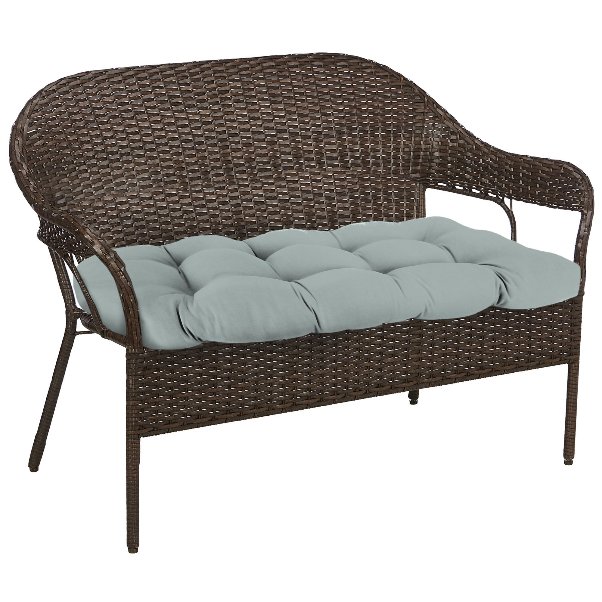 Add a touch of color and classic style to your outdoor seating area with this 44-inch by 18-inch Tufted Wicker Bench Cushion. Crafted from quick-drying, UV-protected fabric, this outdoor swing cushion will stay looking fresh and won’t fade, even after hours of fun in the sun. French edges on each side create a classic, finished look and rows of sewn tufts lend simple sophistication to any porch. Rounded back corners create a perfect fit for the contours of your furniture. This bench cushion features blown polyester fiber fill to enhance the feel of your outdoor furniture for family, friends and guests. Made for a multitude of uses, this versatile cushion can be used on wicker settees, loveseats or swings, plus it is finished on both sides for use on the front and back. This durable cushion adds comfort and decor to your deck without more maintenance, thanks to the water-, stain-, mold- and mildew-resistant outdoor fabric. If something spills during your next backyard BBQ or poolside party, spot cleaning is a snap with just soap, water and a soft cloth.