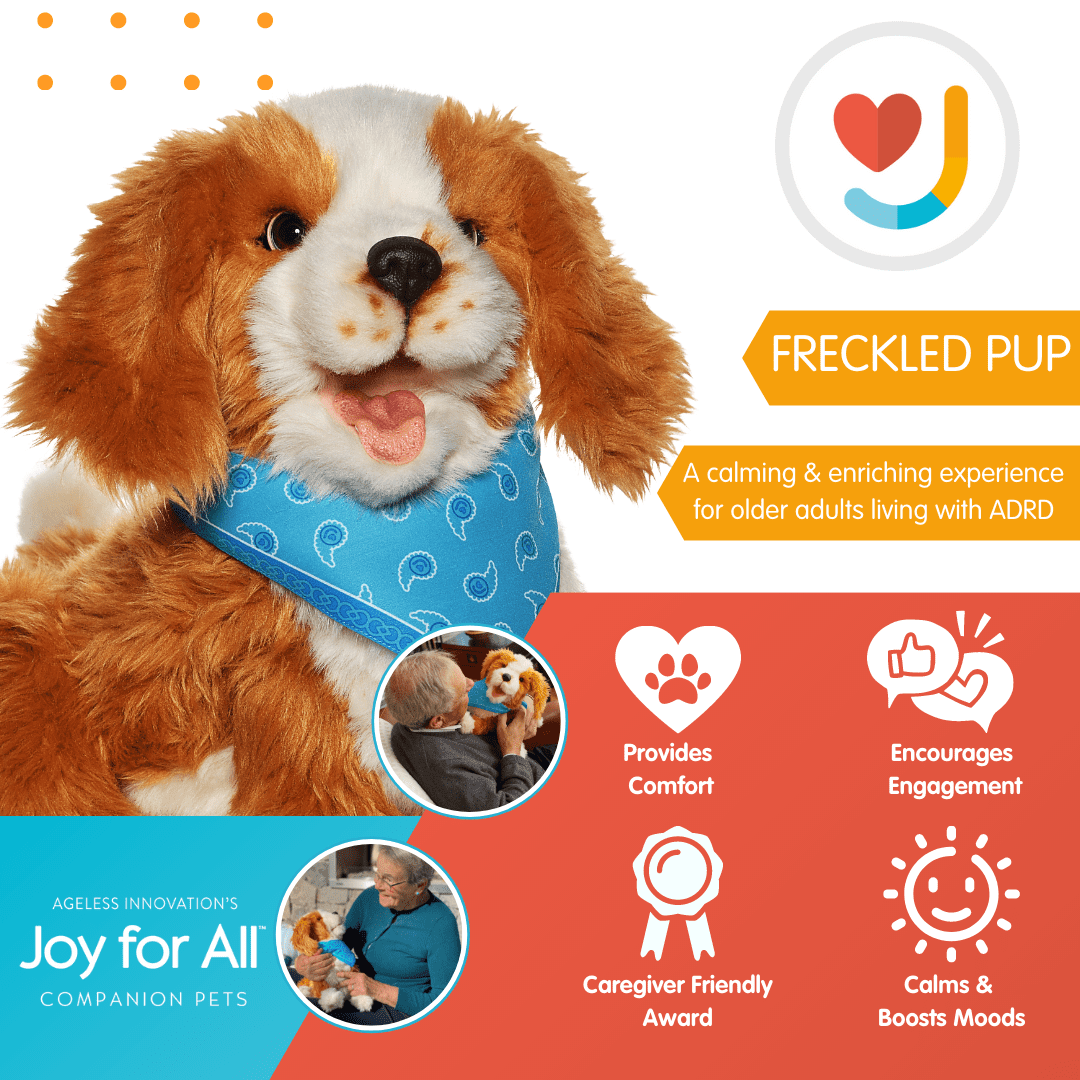 COMFORTING COMPANION: Help older adults feel more connected! Seniors often experience loneliness and social isolation as they age. Pets are beneficial in easing these feelings, giving a sense of purpose, and improving wellbeing but are not a feasible option for many elderly. Joy For All animatronic pets provide a comforting and engaging presence, promote the benefits of real pet ownership, and are suitable for any living situation or care setting. ENGAGING PLAY: Promote better cognitive activity and capability! Unlike toy stuffed animals, Ageless Innovation’s built-in sensors and speakers give this robotic dog unique, interactive lifelike reactions to motion, voice, and touch inspired by real puppies, such as head tilts and tail wags, playful barks, and a realistic heartbeat. This two-way interaction stimulates users, helping to improve cognition and engagement with caregivers and family. REFOCUSING CARE: Cost-effective therapeutic intervention! Elderly adults with Alzheimer’s and dementia may become easily agitated, confused, or anxious, leading to increased use of medications and a higher burden of care. The calming effect associated with Joy For All Companion Pets promotes improved moods and positive behaviors while also reducing the stress and strain on caregivers, allowing freedom to focus on other care needs. AGELESS INNOVATION: As a global company focused on unleashing the power of play through innovative designs, we believe play is a basic human need for everyone, regardless of their age! Beginning with our award-winning line of Joy for All Companion Pets, we’re focused on creating products that promote fun, joy, and play while reducing the cost of care and making meaningful connections for older adults, their families, and caregivers all around the world.