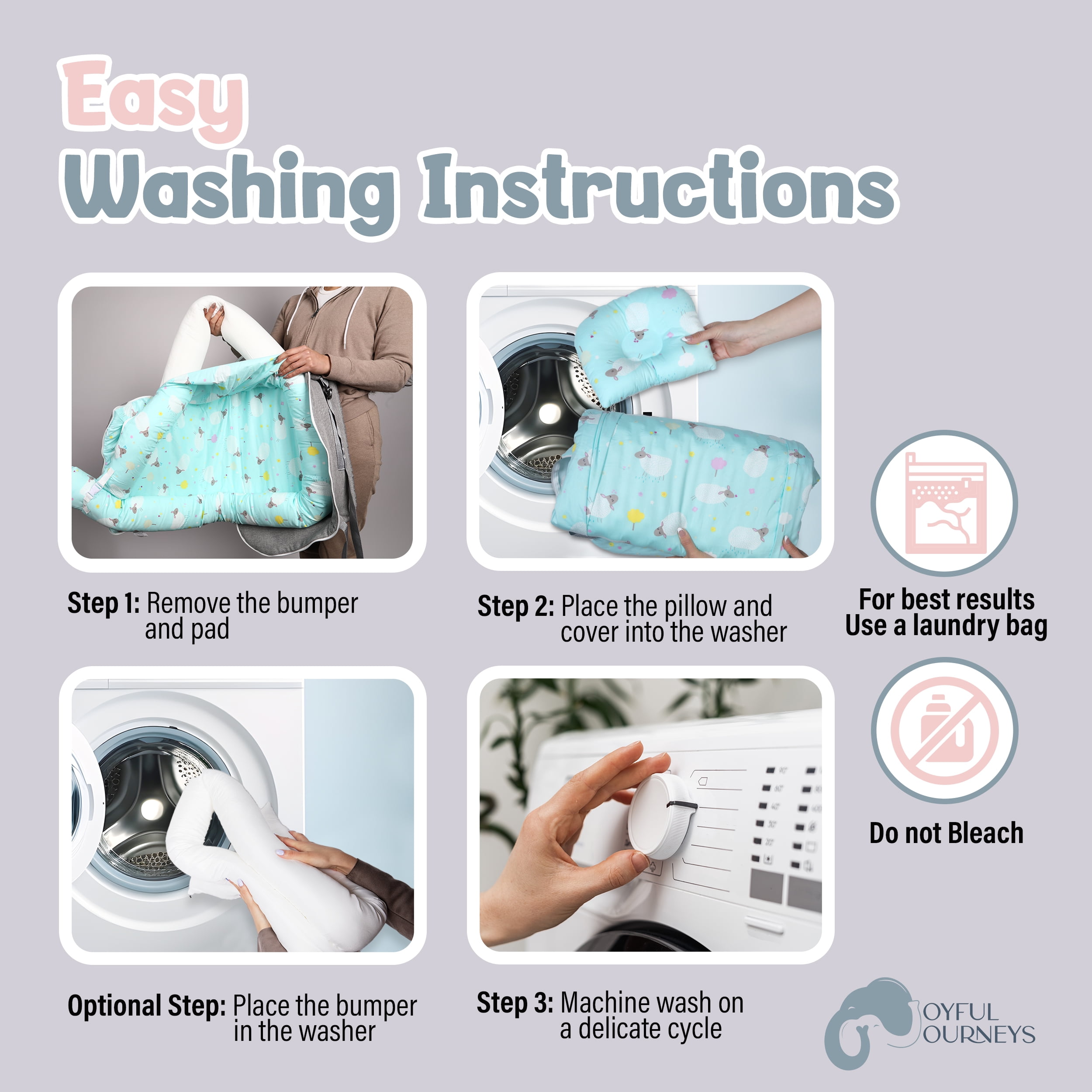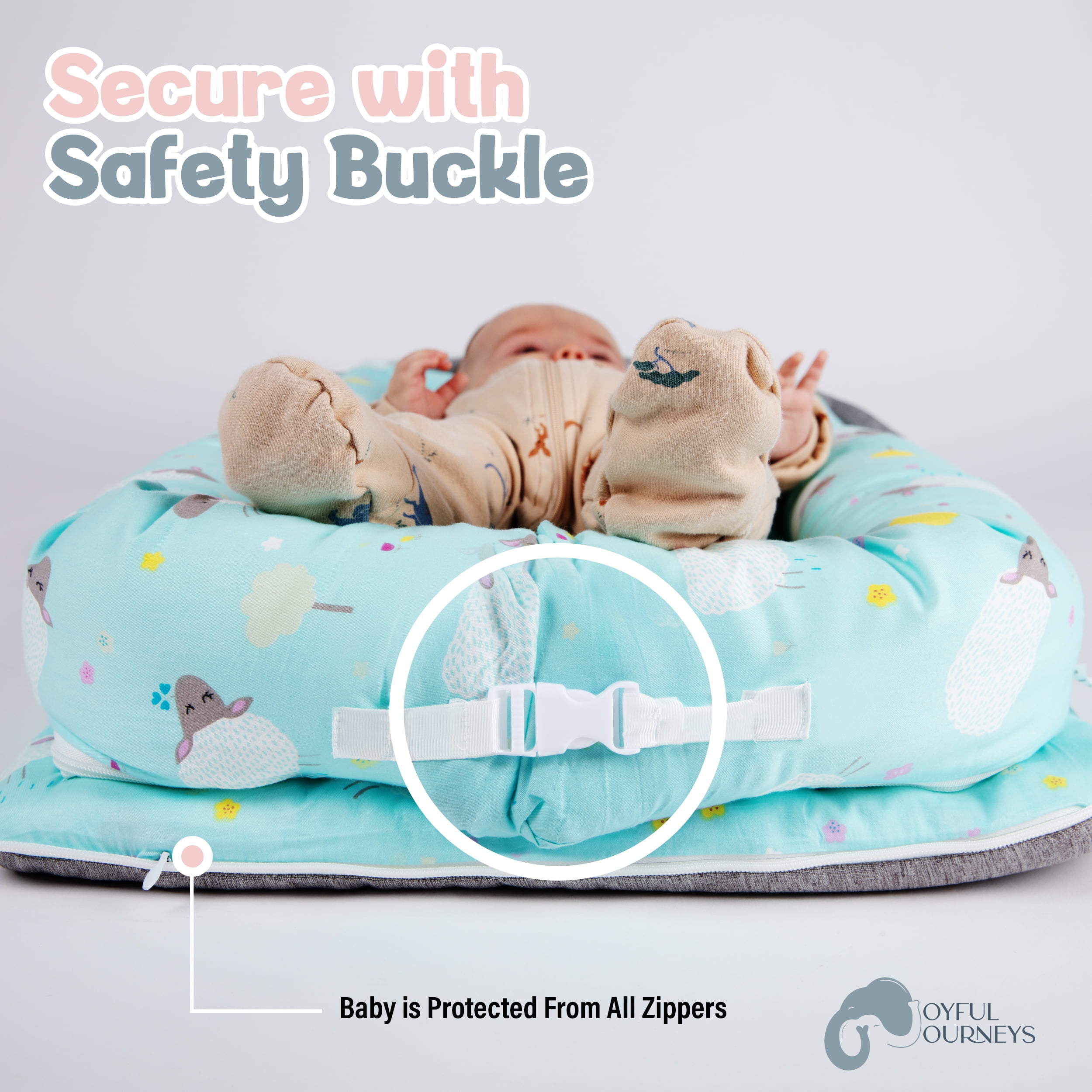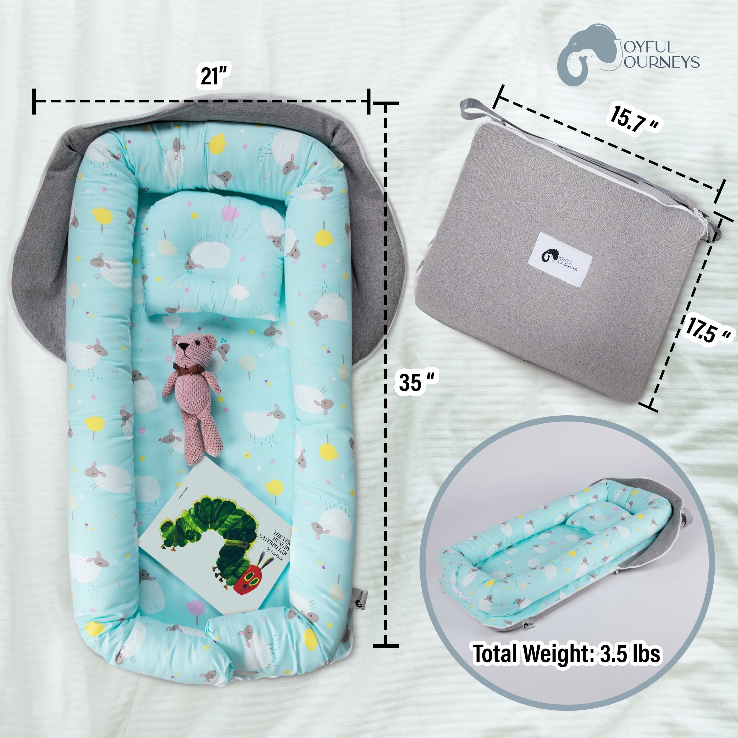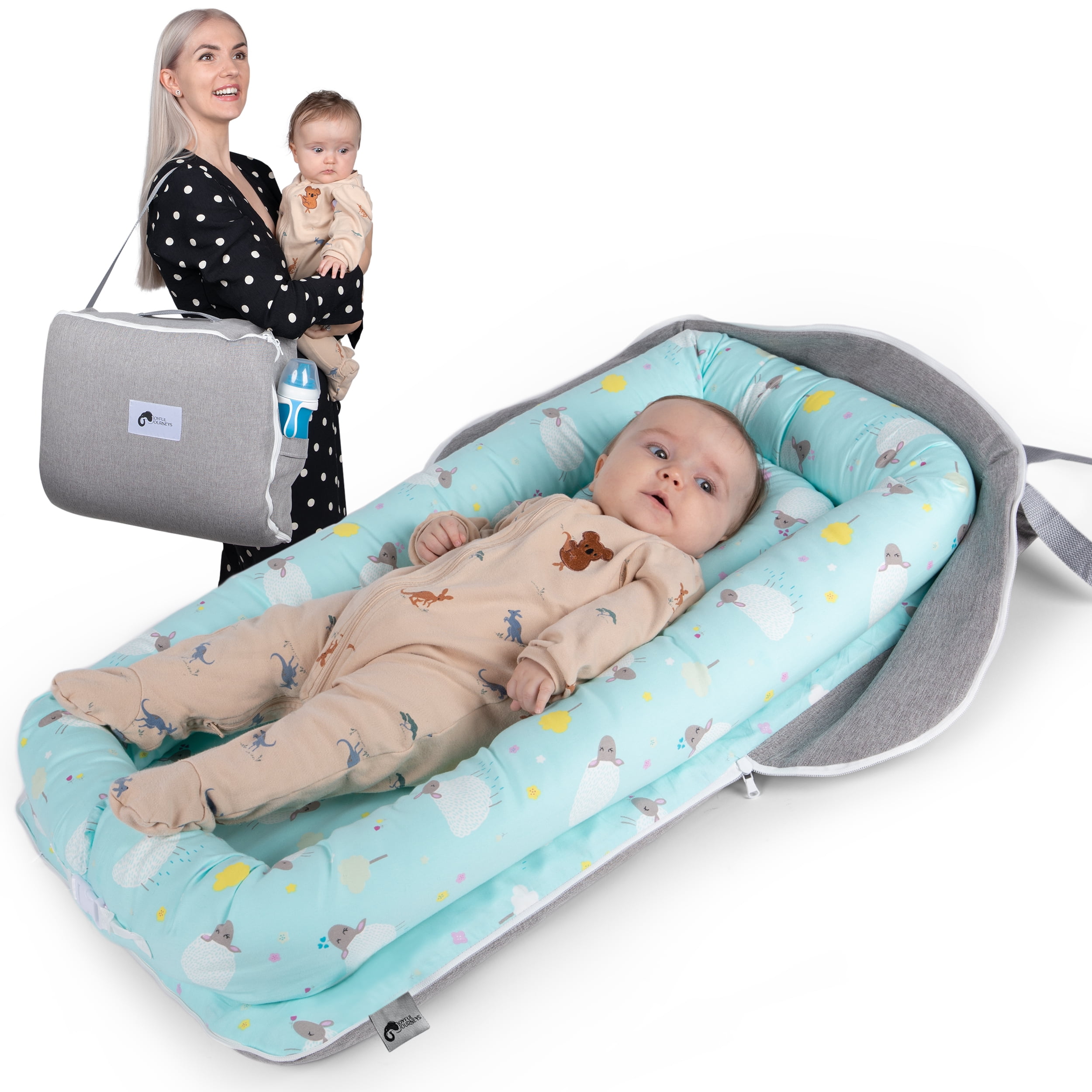 Introducing Joyful Journeys Baby Lounger Diaper Bag – the ultimate comfort companion for your little one on-the-go! The portable baby lounger is available in 5 adorable color patterns to match your preference. Crafted with 100% natural perle cotton for durability and softness. Our portable infant lounger is lightweight and easy to clean with a hidden zipper. Suitable for children ages 3 months to 18 months old, providing a cozy space for lounging. Experience unparalleled convenience with two side pockets providing storage for baby bottles. Also plenty of space for diapers, wipes and, an extra change of clothes. Making it a go-to solution for changing or lounging. Wherever you go, our portable baby lounger seamlessly adapts to the situation, making it the excellent choice for the dynamic lifestyle of the modern parent. Enjoy the premium quality materials and sturdy zippers incorporated into our baby loungers. The adorable, water-resistant and breathable design not only enhances the aesthetic appeal, but also ensures your baby experiences the utmost comfort in every use. We understand the demands of parenting, and that’s why our lounger for baby is designed for easy care. Simply remove the bumper and pad for a hassle-free machine wash on delicate cycle. Tumble dry low or lay flat to dry, allowing you to focus on what truly matters – cherishing moments with your little one. CPSC (2023) tested and CPSIA-certified to ensure compliance with safety standards. Doing a baby registry search? Add our baby bag for mom to your list of newborn essentials must haves! Smooth and Durable Our baby lounger diaper bag has 100% perle cotton filling, making it ultra-soft and durable. It provides a comfy environment, ensuring your baby’s relaxation and comfort Cozy Bumpers The baby lounger diaper bag features smooth zippers, ensuring easy and secure closure. It has ample space for all the baby essentials, including two side pockets large enough to easily hold baby bottles Sturdy Clasp This baby lounger diaper bag features a clasp for expanding the lounger to accommodate your growing baby. No need to worry about pesky ribbons catching your baby’s toes Water-Resistant Padding The padding ensures protection against spills and unexpected messes, maintaining a clean and dry environment for your baby. It is also easy to wash, making it perfect for busy parents