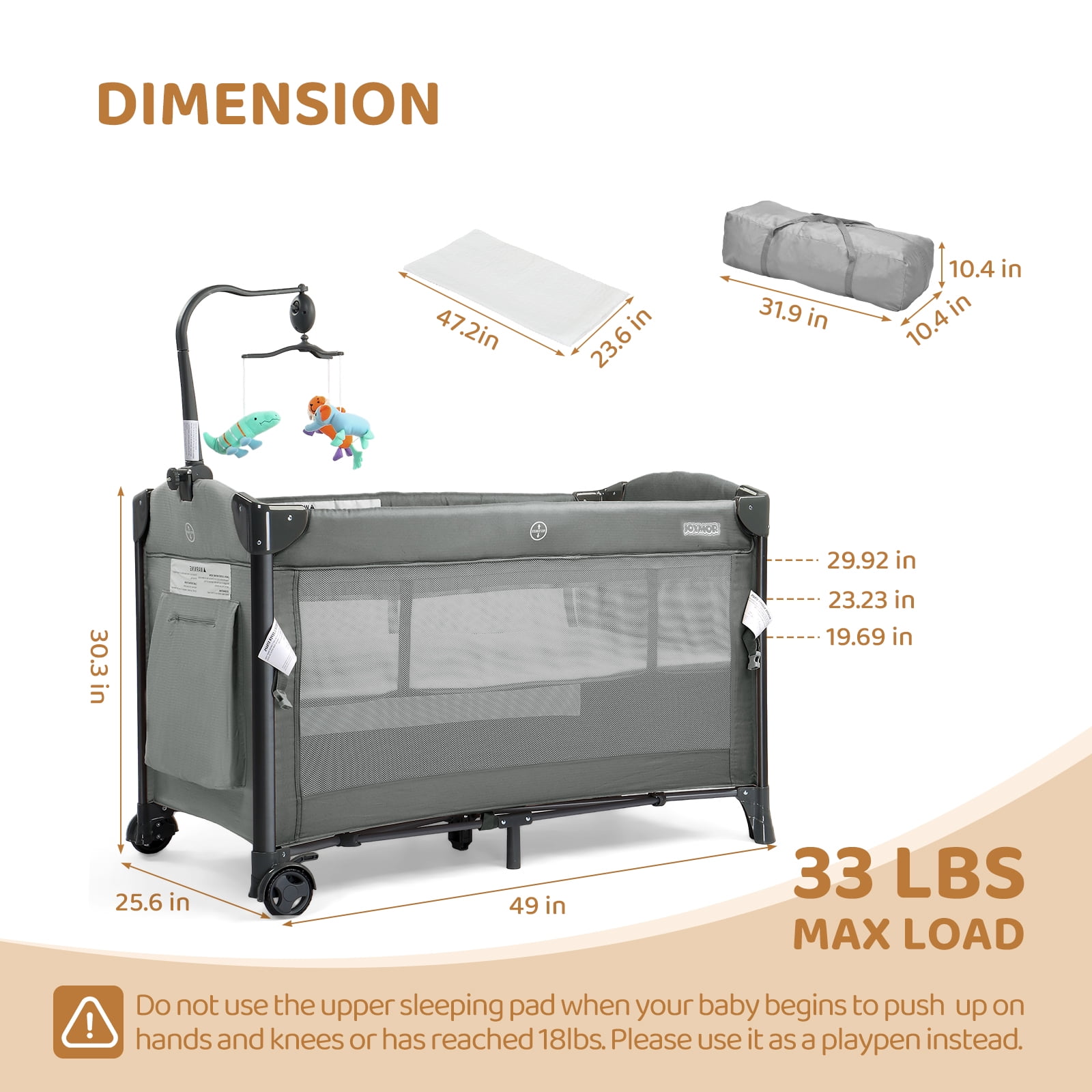 Upgrade 3 in 1 Design for Various Use — JOYMOR baby bed side sleeper is designed to grow with your kids from newborn to infant to toddler, it is easily convert to baby bassinet, bedside cribs and playpen, meeting the needs of different periods. Spacious playpen is equipped with a zipper game entrance for baby in and out Replacement Sheet & Thicker Mattress–You will get a free sheet for replacement. which material is cotton. We also increased the thickness of the mattress to ensure maximum comfort. Mattress Size: 47.2*23.6 in Breathable & Visible Mesh Design–Designed with mesh provides a well-ventilated and bright sleeping space. You can observe your baby’s status at any time, with peace of mind and care. Side Storage Bag & Second Layer for Storage–The large pocket on the side can also store baby clothing and supplies. When used as a baby bassinet, you can store baby supplies on the second level for easy access. Adjustable Height–Our co-sleeper has a detachable sidebar, that can easily attach to the parent’s bed. It’s easy access to your baby and have parent-child interaction at night. 3 adjustable heights to meet the different needs of parents. Max load: 33 Lbs Gender: Unisex Infant Color: Gray