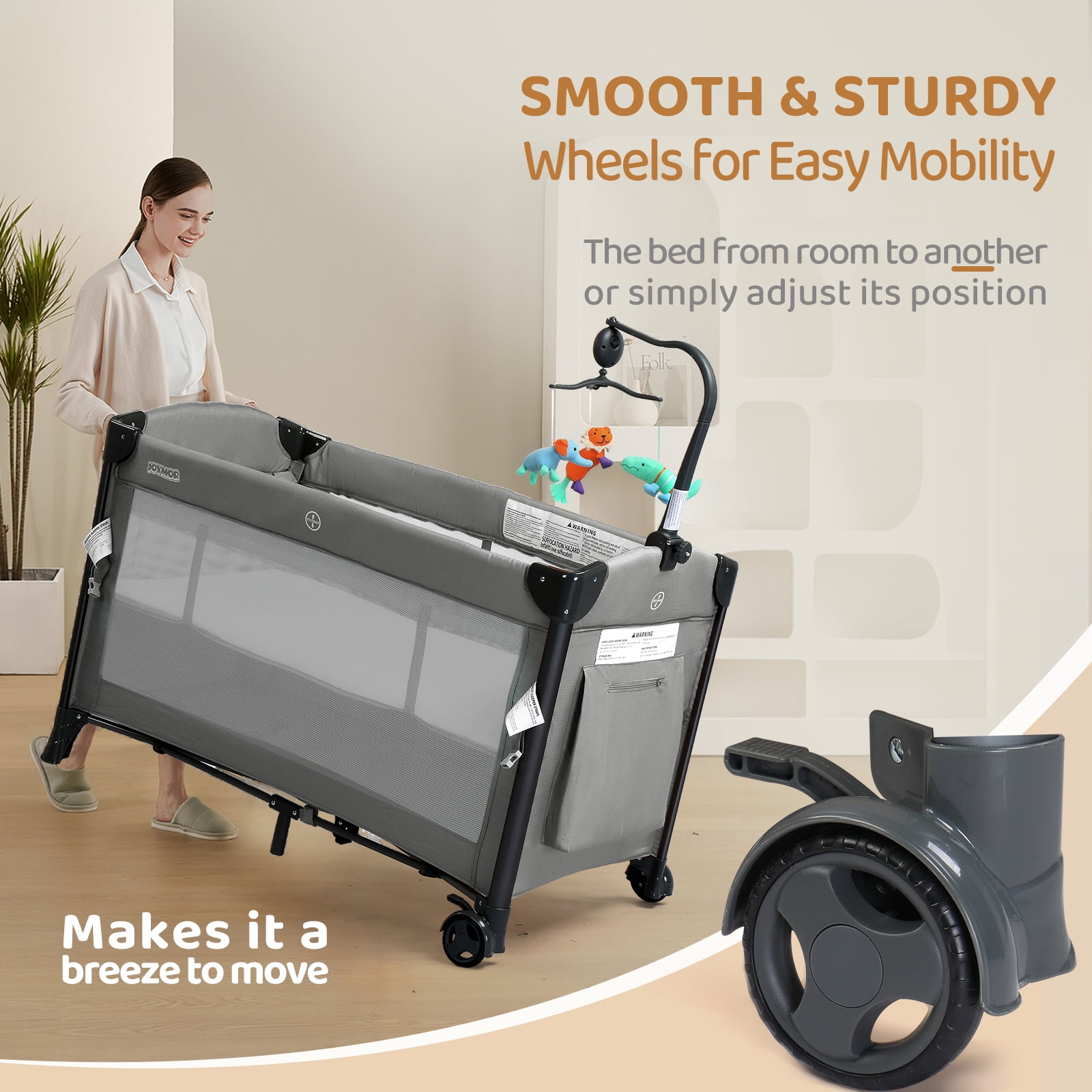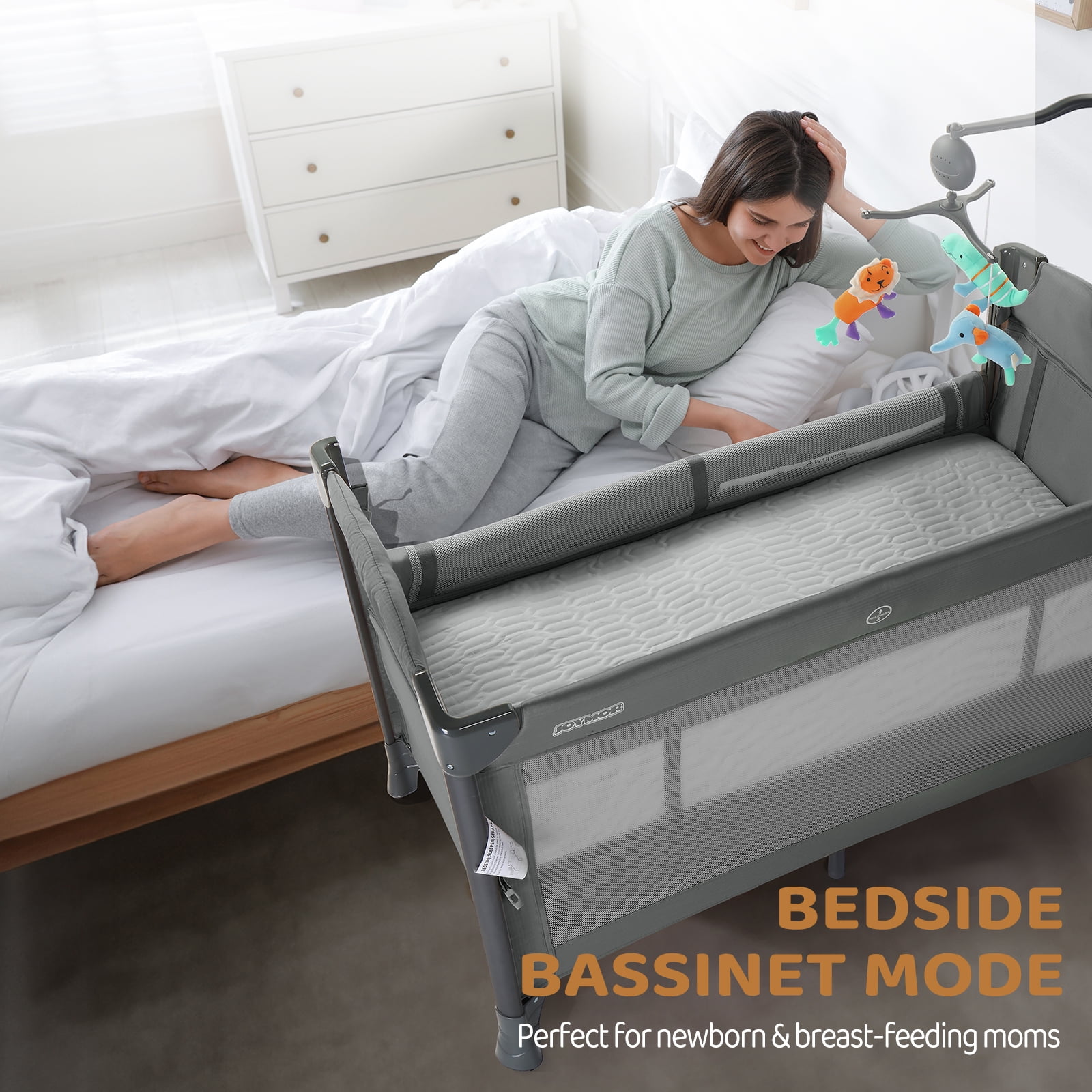 Our JOYMOR 3-in-1 Unisex Baby Bedside Bassinet Portable Crib in Gray is designed to prioritize safety, quality, and security. The bassinet is made of high-quality and durable Oxford cloth that is gentle on your baby’s skin and won’t cause any harm. We use PP material that is free of toxins and chemical smells, making it safe and healthy for your little one.Our products meet CPSC, CPSIA and ASTM safety standards The bassinet comes with a thick mattress and detachable cotton sheet that can be easily cleaned.This product is designed with a firm, flat sleeping surface that meets the Consumer Product Safety Commission’s recommendations for safe sleep. Its easy locking mechanism ensures stability, and the large wheels with brakes make it easy to move from place to place. Additionally, the bassinet includes a convenient travel bag for transport. To provide added safety and security for your baby, we’ve added an extra crossbar to the bassinet to prevent the mattress from tilting to one side. Overall, our JOYMOR 3-in-1 Baby Bedside Bassinet Portable Crib is the perfect choice for new parents who prioritize safety, comfort, and convenience for their little ones. Conformity CPSC Side-height Requirement – Next to the adult bed, our bassinet a lowered side height is 6.69 inches, and the highest side height is 10.23 inches. 【Note】: Please read the product manual carefully and assemble it according to the manual will get the best use effect; The bassinet with an incline less than or equal to 7° from horizontal. They are under the ten degree cut off.This product is designed with a firm, flat sleeping surface that meets and/or exceeds all U.S. Consumer Products Safety Commission safety standards. JOYMOR crib adopts H-shaped iron pipe design, and three support iron pipe at the bottom better the stability of the crib side bed; strictly abide by the American safety standard: 12cm Ruffle