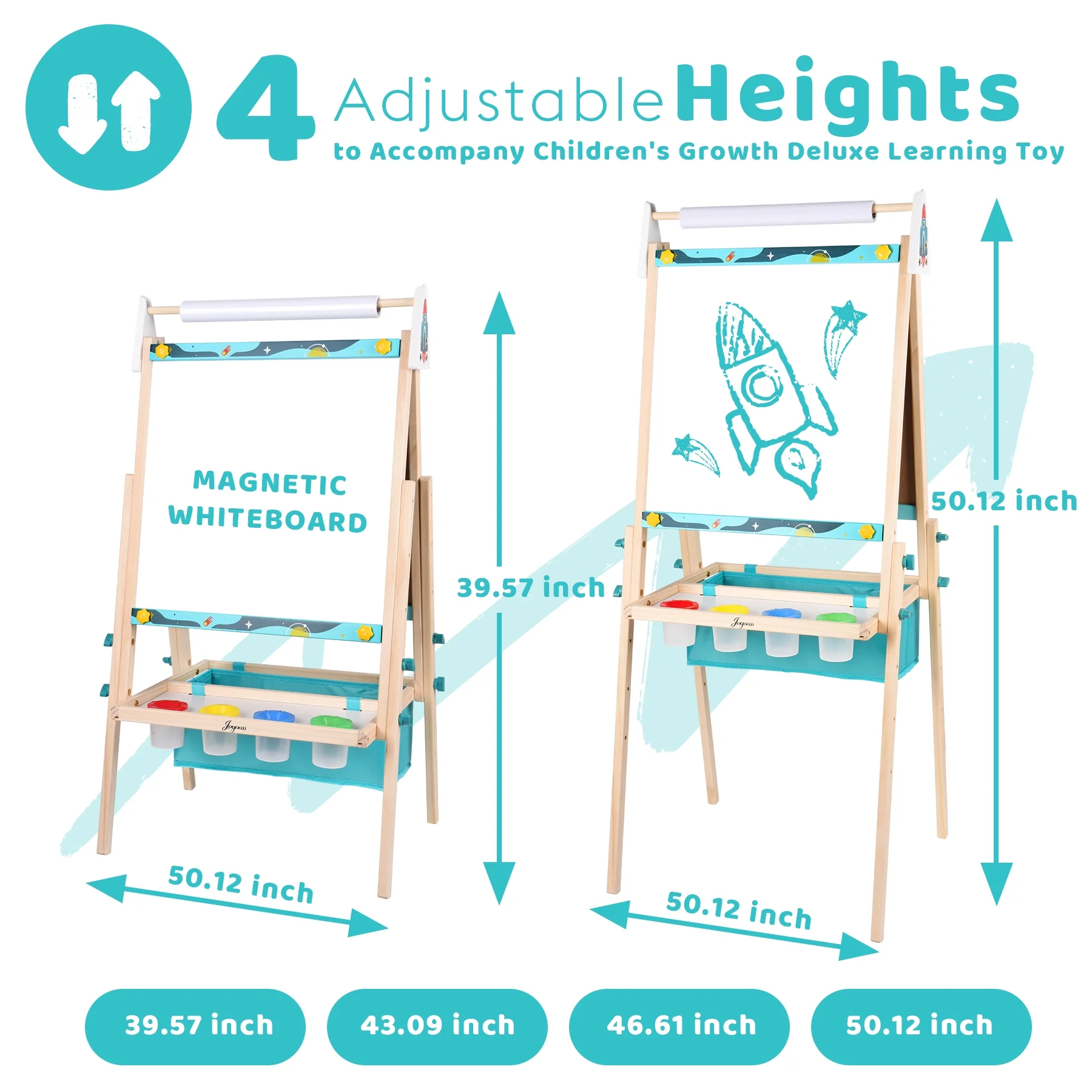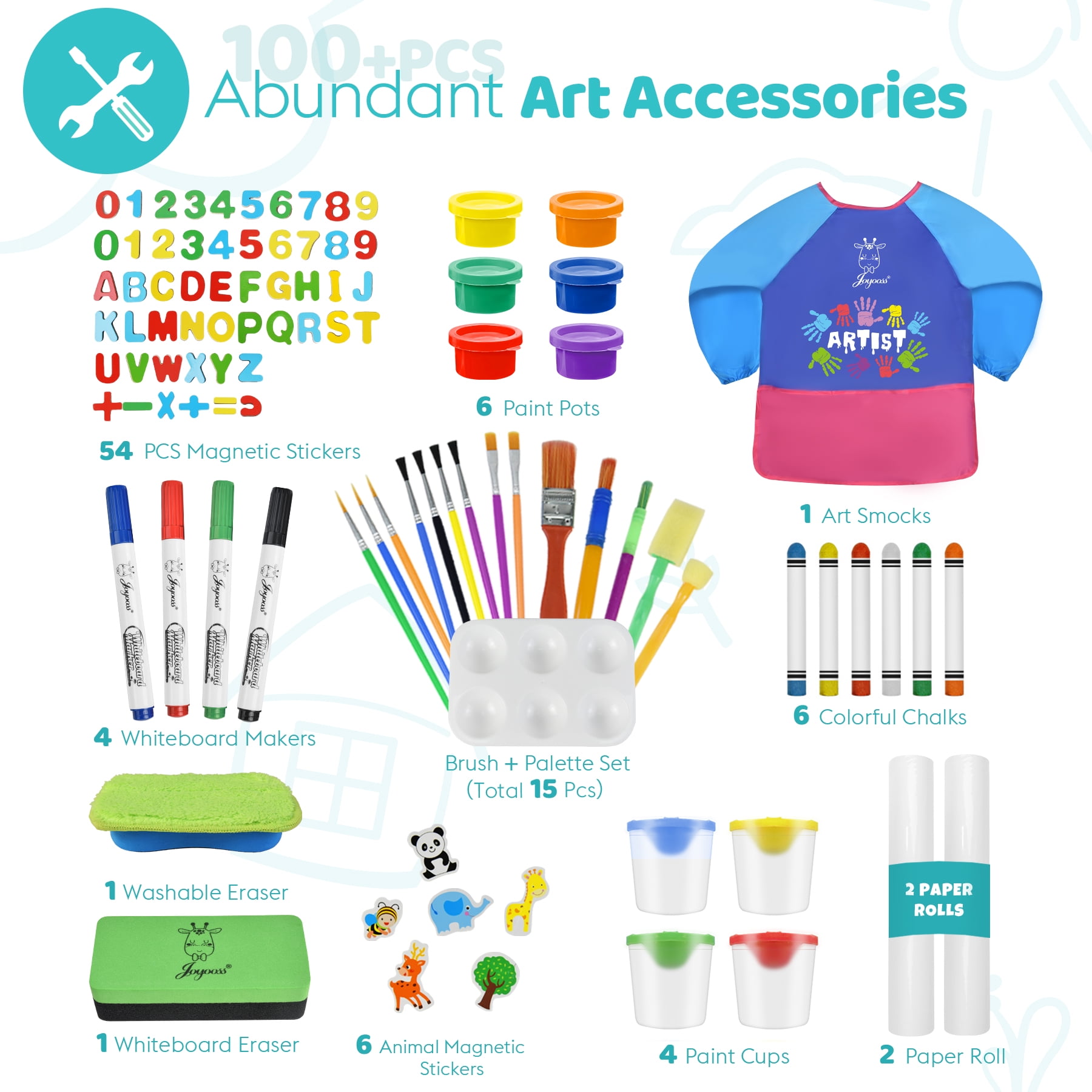 JOYOOSS Kids Double-Sided Wooden Art Easel with 98+ Accessories Adjustable Heights: Features 3 adjustable heights (39.57″, 46.61″, 50.12″) to grow with your child, ensuring a comfortable and ergonomic drawing experience for toddlers and older children alike Multifunctional Surface: Double-sided design includes a magnetic whiteboard and blackboard, providing versatile options for creative expression and learning Creative Accessories: Comes with over 98 accessories, including 2 paper rolls, 6 paint cans, 14 brushes, a set of color palettes, an art apron, chalk, whiteboard pens, and more, catering to all painting and learning needs Safety First: Constructed from high-quality pine wood for stability and durability, with smooth surfaces and rounded corners to ensure safety for young artists Built-in Storage: Equipped with a built-in tray to keep all art supplies organized and within reach during creative sessions