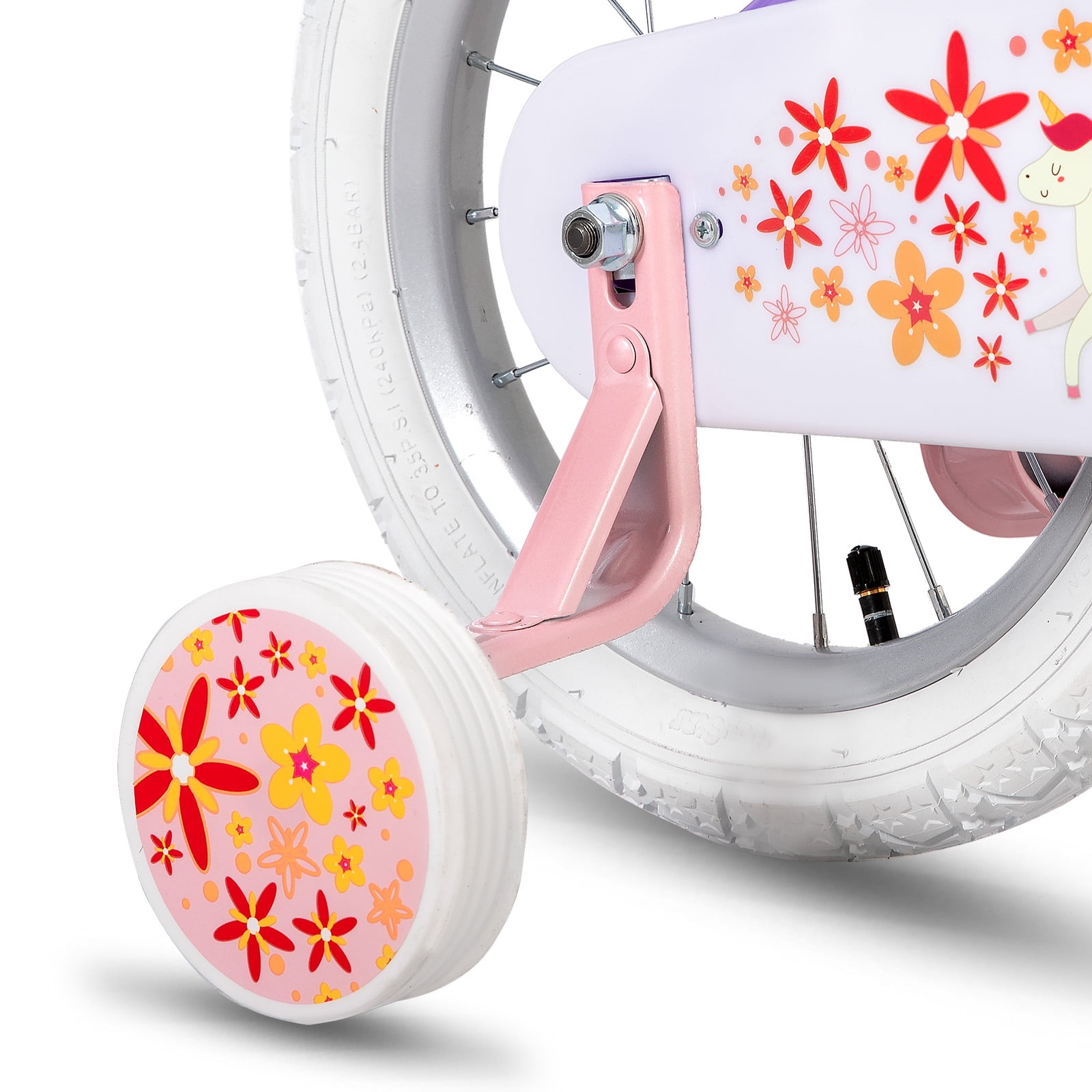 JOYSTAR Unicorn Princess Girls Bike: Vibrant, charming design with DIY decals, basket & doll seat. Adjustable fit, dual brakes, wide tires, steel frame, non-slip pedals, reflectors ensure safety & ease. Singlespeed, soft seat, removable training wheels. 85% pre-assembled, lifetime warranty. Sizes for 2-8years girls.