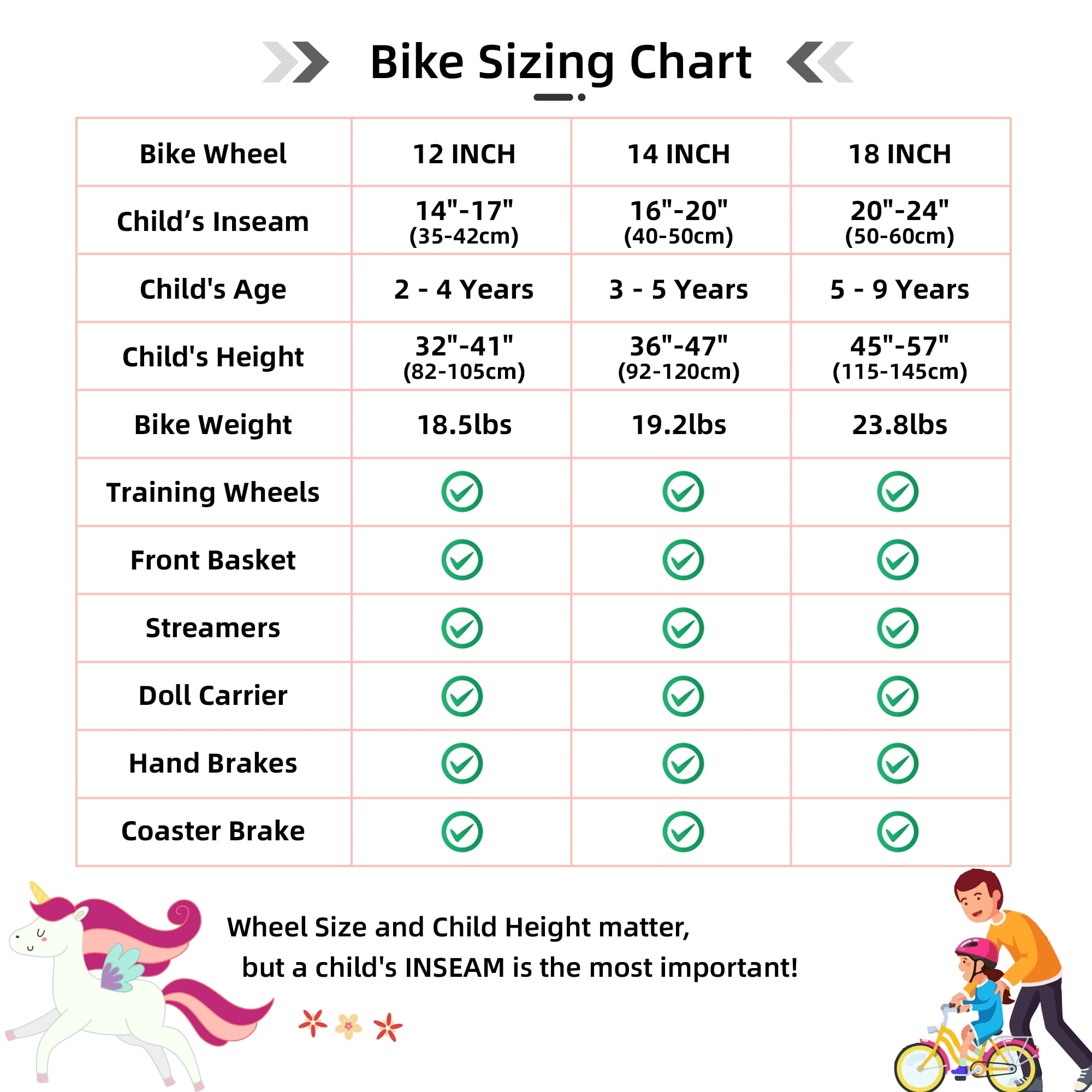 Amazing Design and Color! JOYSTAR Unicorn Girls bike with Bright colors, stylish and charming. DIY decals, beautiful basket and doll bike seat add extra fun to the ride. They have adjustable saddle & stem height for a better fit for easy pedalling. Safer Riding! The front hand brake plus rear coaster/foot brake offer ample stopping power with more safety, wide 2.125″ pneumatic tires add more stability, Sturdy steel frame, enclosed chainguard, front & rear reflectors and wheel reflectors. Easier to Ride! Your little ones will enjoy a smoother ride with JOYSTAR kids bike, Small brake lever allows little riders brake efficiently. Removable training wheels are included. Single speed bike is easy for kids to manipulate the bicycle. Easy Assembly! 85% of the bike is assembled. The front tire, the seat and training wheels need to be installed. Assembly tools and an instructions are included. Adult assembly is required. The bicycles are guaranteed by our limited LIFETIME WARRANTY. More Size Options! 12 inch bike is suitable for 2-4 years old girls; 14 inch bike is suitable for 3-5 years old; 16 inch bike is suitable for 4-7 years old; 18 inch bike is suitable for 5-8 years. Use our easy-to-follow size chart, you’ll find a perfect size for your little beloved.