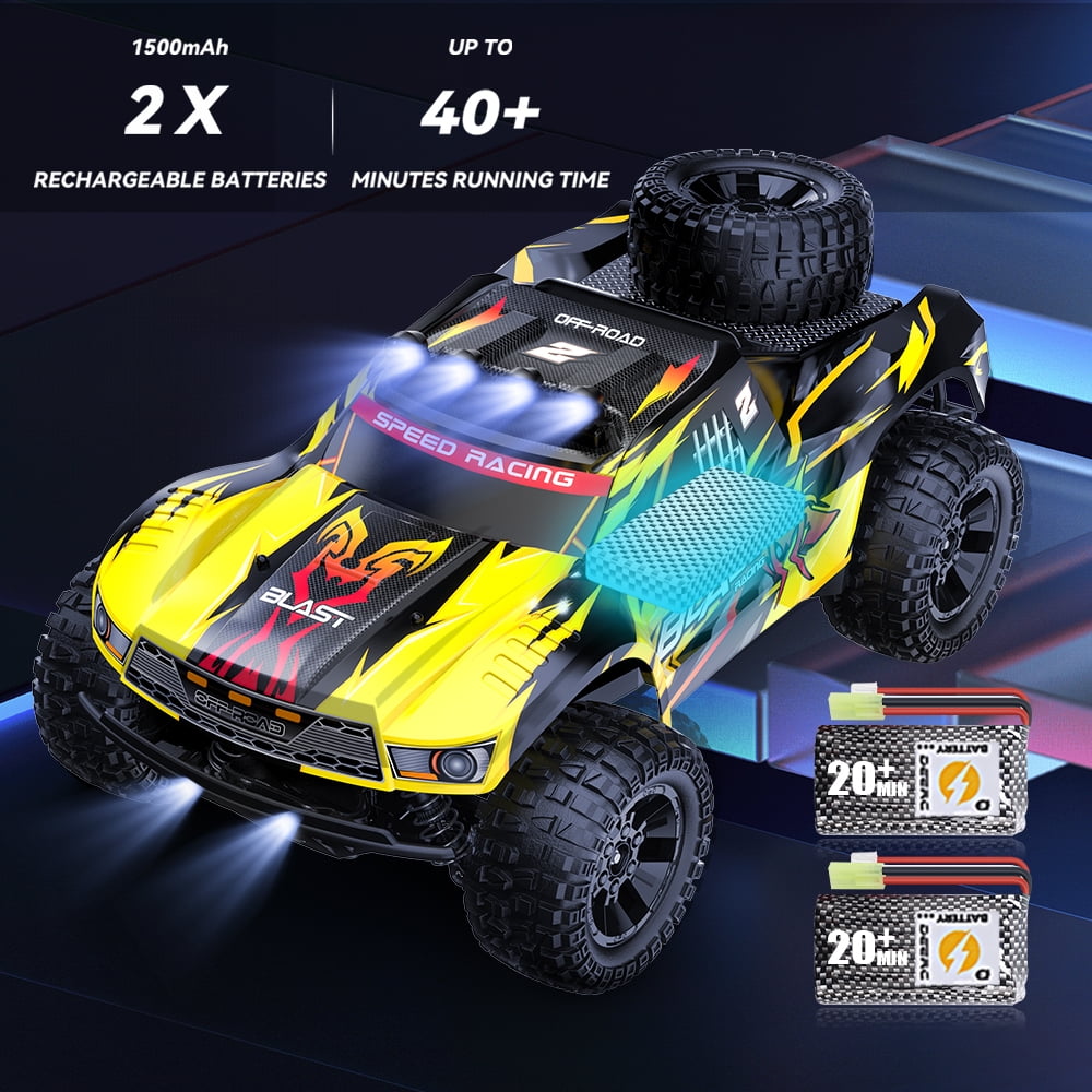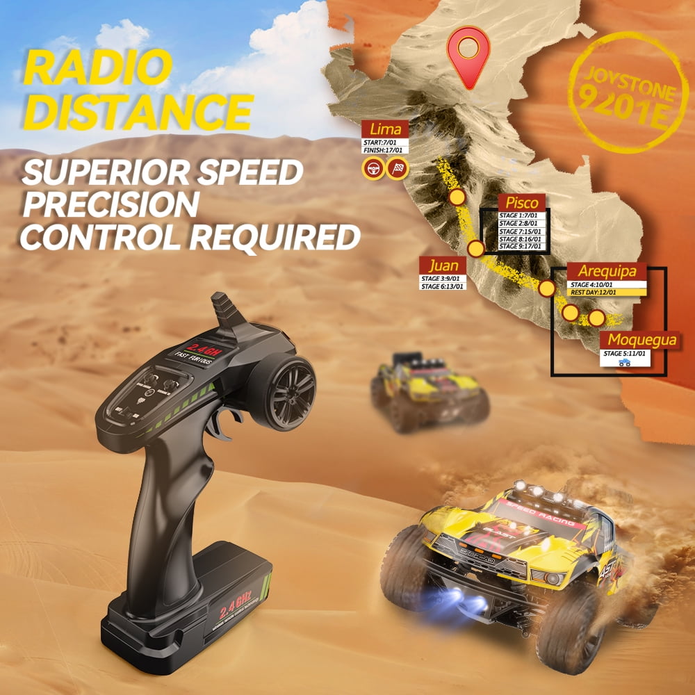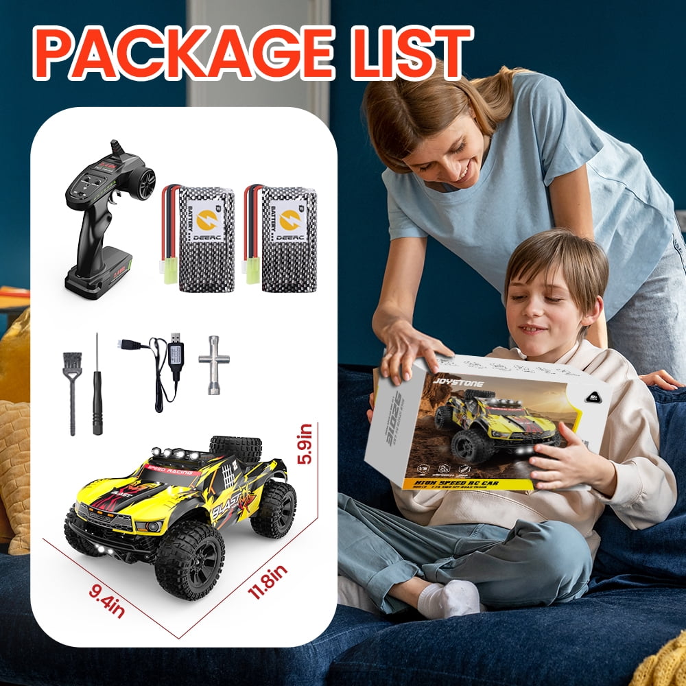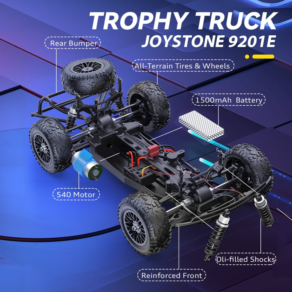 1:10 HIGH-SPEED RC CAR – Large scale fast RC car outfitted with the powerful 540 brushed motors, reinforced bumpers, LED lighting system, and all-terrain tires take on any high-flying and all-weather adventure you can throw at it. Grab your transmitter, rip some 4-wheel roost, and discover why nothing else is built like a JoyStone RC CAR! HIGH-PERFORMENCE MOTOR – Built-in powerful motor rips out of the turn and has the speed to impress on the straightaways. The full speed can reach up to 35+MPH. With heat sink on it; maintain good performance while prolonging its service life. 2 BATTERIES & 40 MIN+ PLAY TIME – The RC car is equipped with two 1200mAh high-quality rechargeable batteries, you can enjoy the fun of driving for about 40+ mins a time (20+ min for each battery). With just one drive you will see why our short course trucks performance to a whole new level. HIGH-TORQUE STEERING SERVO – 2.2kg servo provides higher accuracy and better-fixed power, quick response, softer and faster acceleration. 30A ESC provides great power, torque, and top speed to help the 9201 tear up the track, park, or street! ALL-TERRAIN RACING – Independent suspension design is introduced to both front and rear suspension on this high-speed RC car. These shock absorbers help keep the car incredibly stable. Working together with anti-skid rubber tires, an aggressive tread pattern will help you tackle any terrain. DRIVE SYSTEM – 4WD Speed: 50+ km/h, 35+ mph Playing Time : 2* 20+ mins (Depends on playing operations) Charging Time: about 120mins Remote Control Battery: 3 x 1.5V AA Battery(Not included) Remote Distance: about 263 ft Size: 11.8 x 9.4 x 5.9 inches (1/10) Package Included: 1* RC Short Course Truck 1* 2.4GHz Remote Controller 2* Truck Battery 1* USB Charging Cable 1* User Manual 1* Spare Part Kit