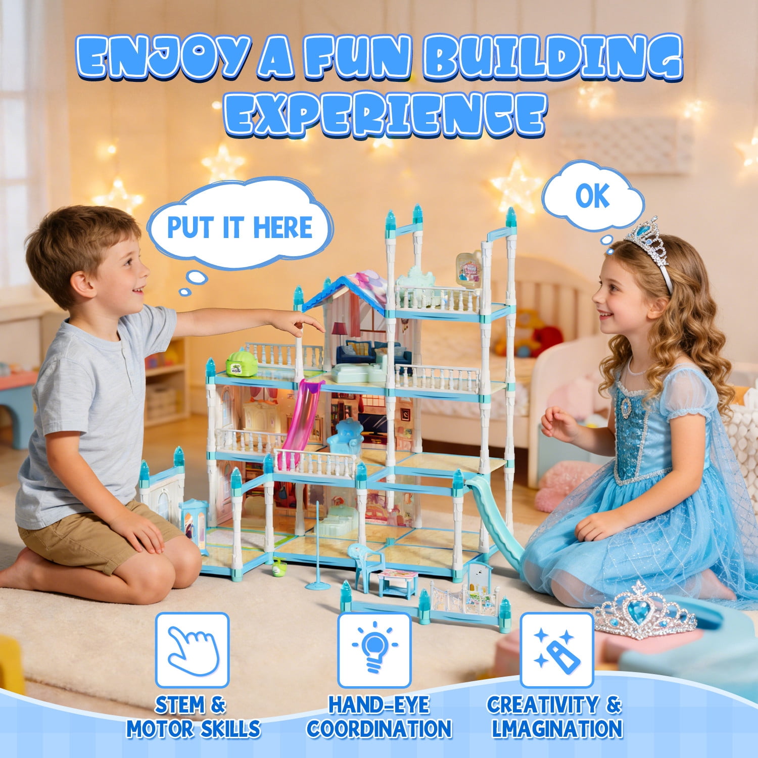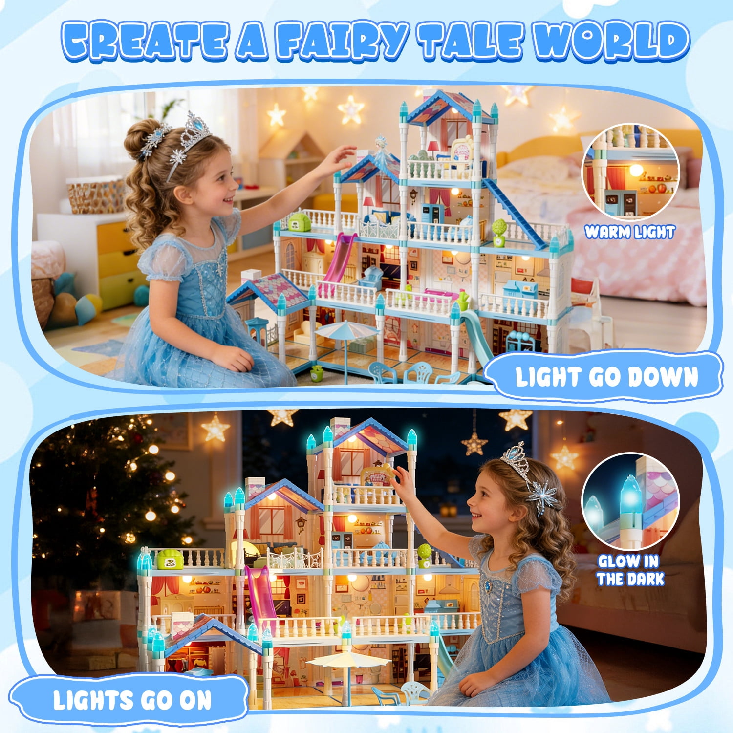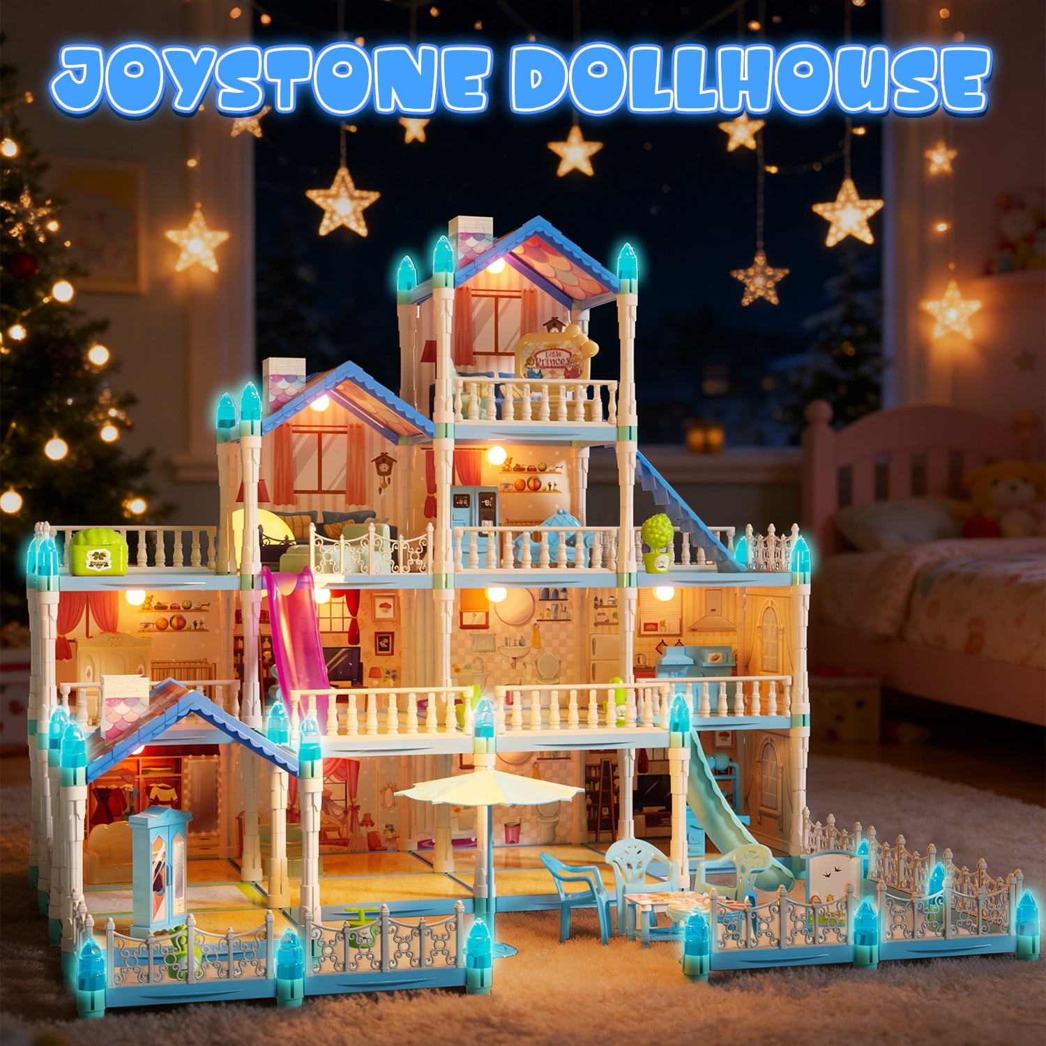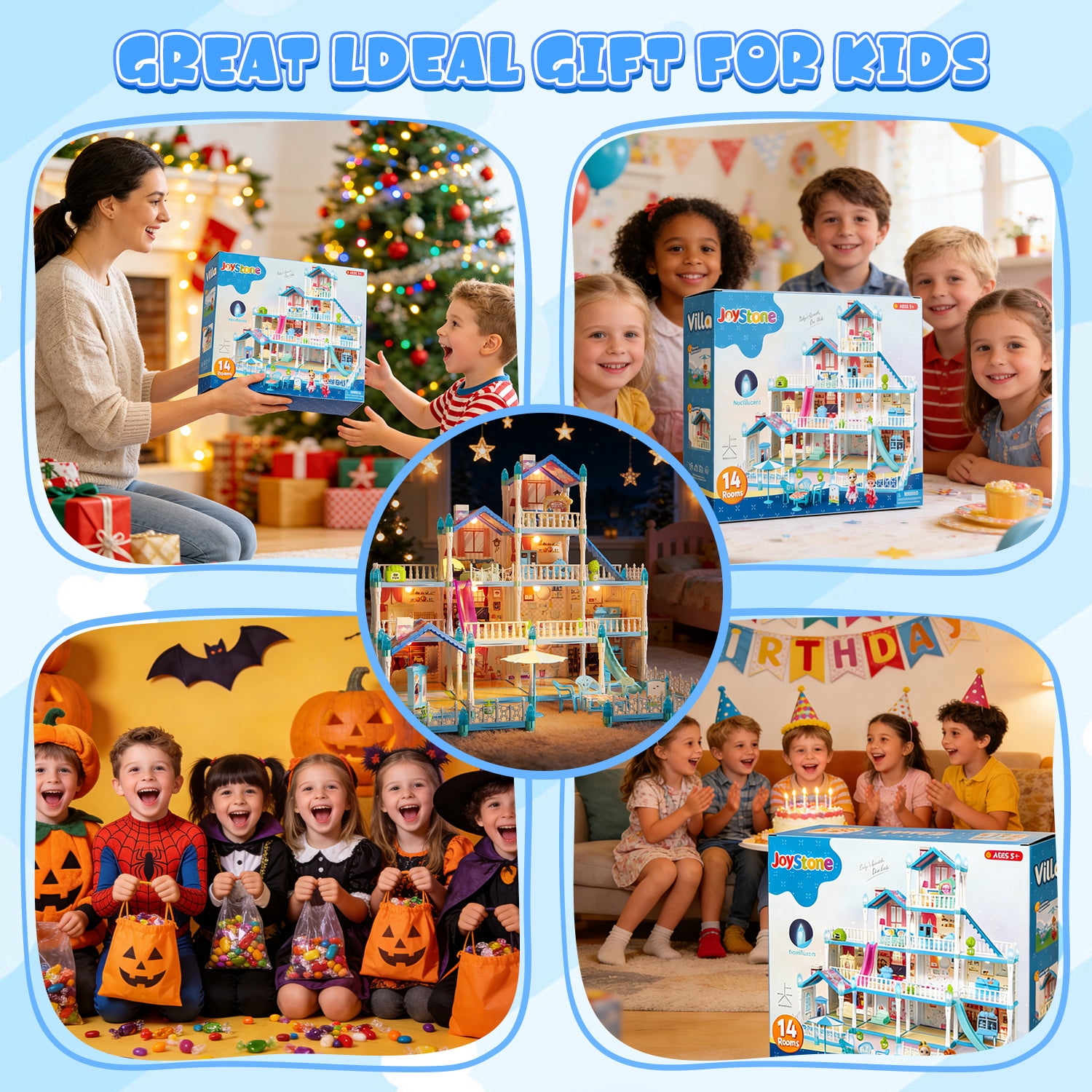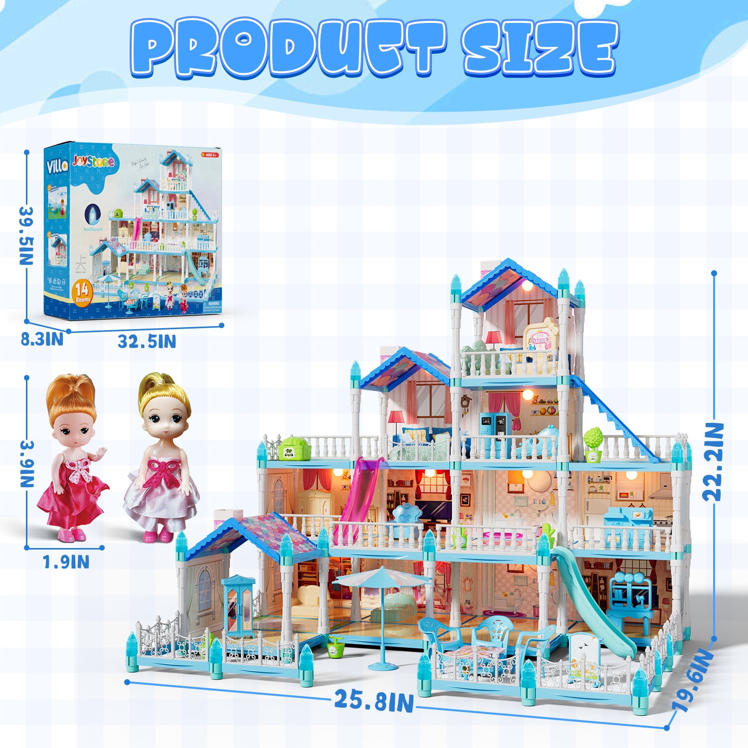 JoyStone Dollhouse with Warm Light, Pretend Play 14 Rooms DIY Playhouse, Kids Doll House with 2 Dolls, Creative Gift for Girls, Blue