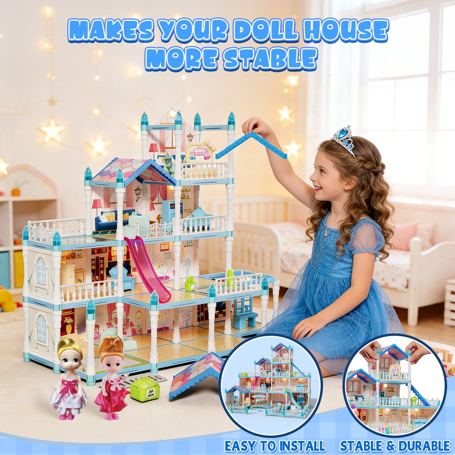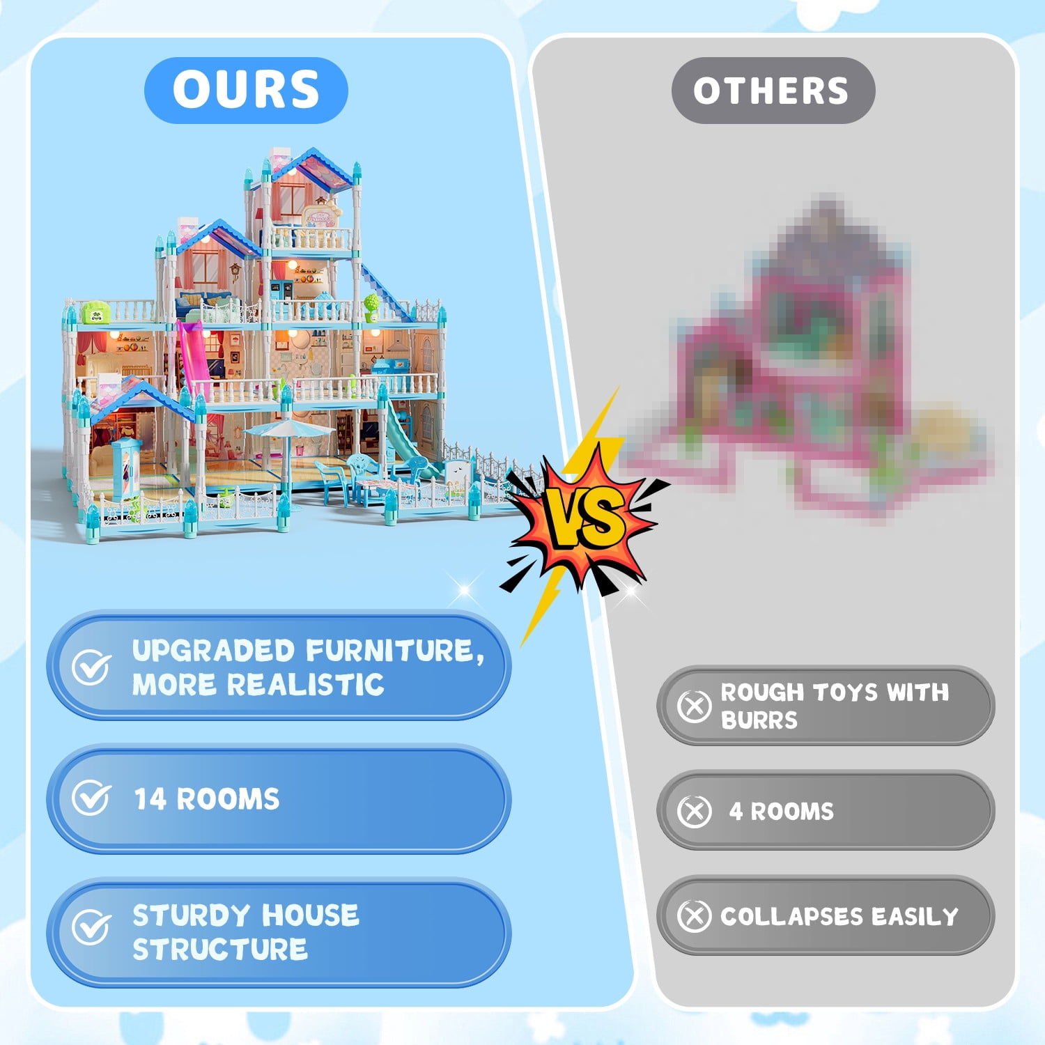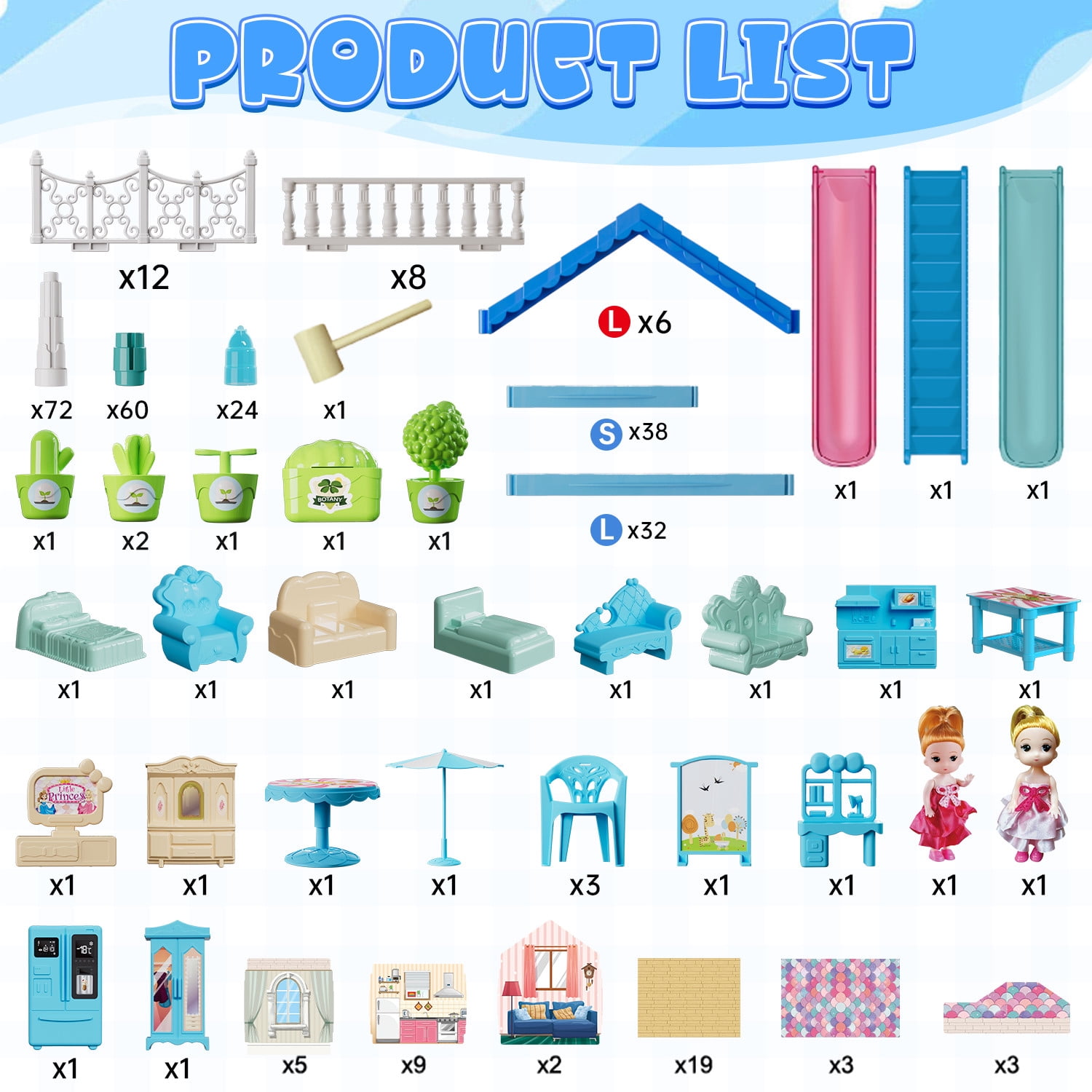 Kids Dollhouse Girls need to build their own house by themselves, thereby promoting critical thinking and innovation among our dear kids. Parent-child interaction will make this process more interesting. The colorful lights will make your house look like the fairy tale. Huge Doll House: there are 14 rooms which are categorized into Bedroom, kitchen, dining room, bathroom, living room, study room, piano room, etc. Unique Furnishing Features: Sliding doors, carriage, fences, dressing table, sofas, piano, rocking chair, pet, bathtub, toilet, TV, refrigerator, stove, dining table and many more. DIY: Girls need to build their own house by themselves. The house-building process promotes critical reasoning and great sense of accomplishment among girls. Parent-child interaction will make this process more interesting. The parental supervision process also seen as a fun-driven bonding activity. With the Dollhouse, girls can create & imagine anything! The possibilities are endless in this amazing dollhouse.Transforming furniture doubles the fun!Move into the Dollhouse & make yourself at home! Young imaginations will discover with doll!