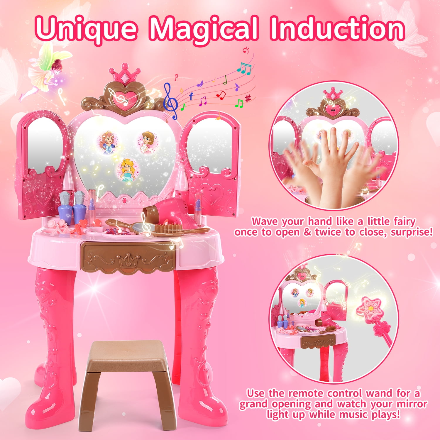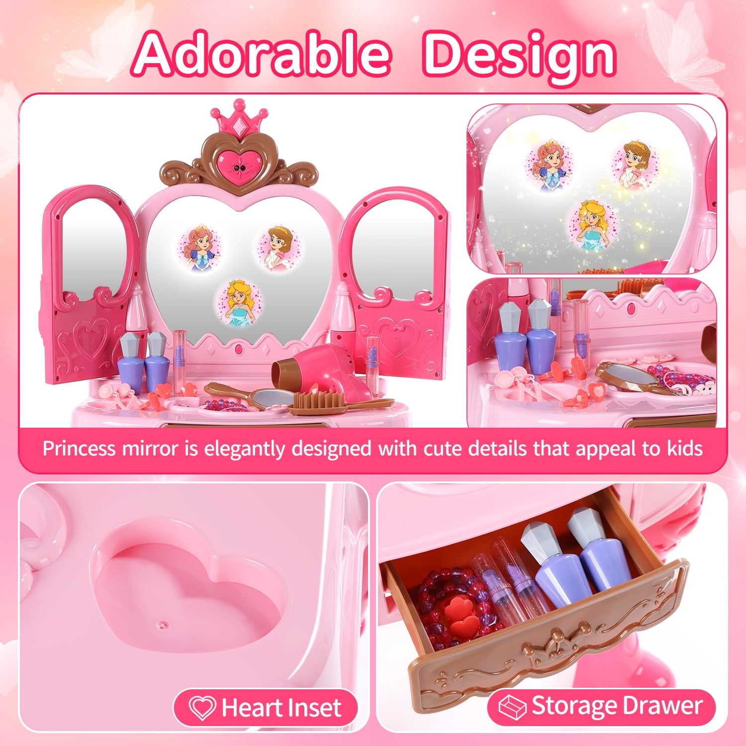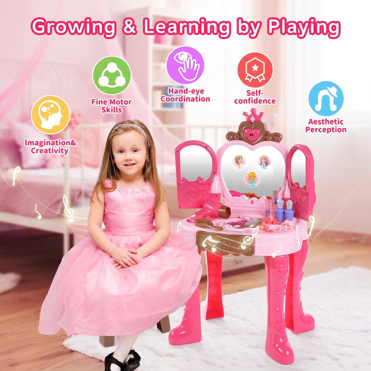 JoyStone Toddler Vanity Makeup Table with Mirror and Chair, Kids Pretend Play Vanity Set with Accessories and Lights and Music for 2-5 Years Old, Pink