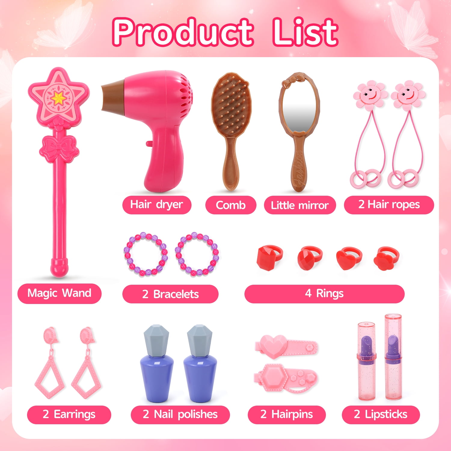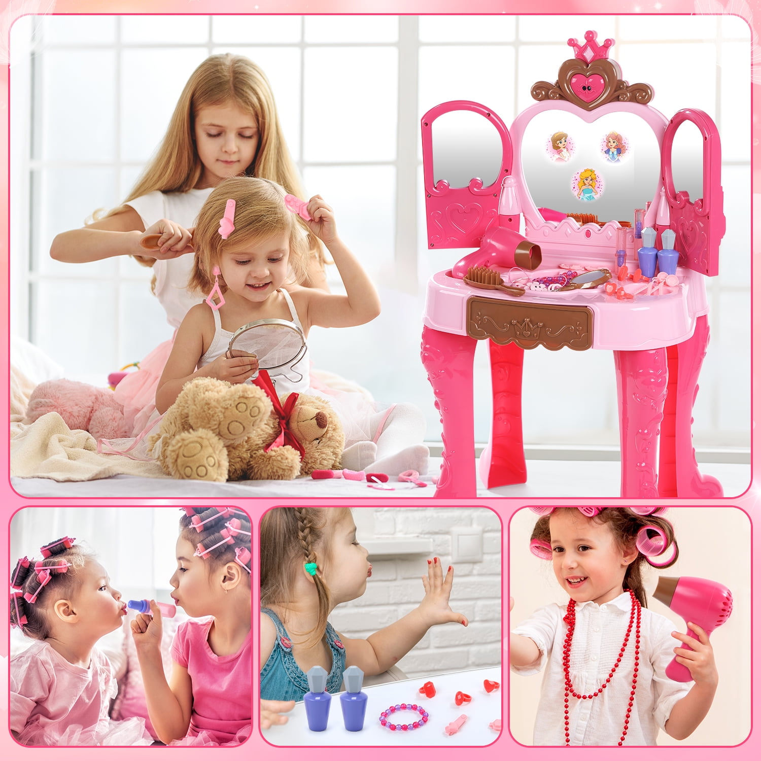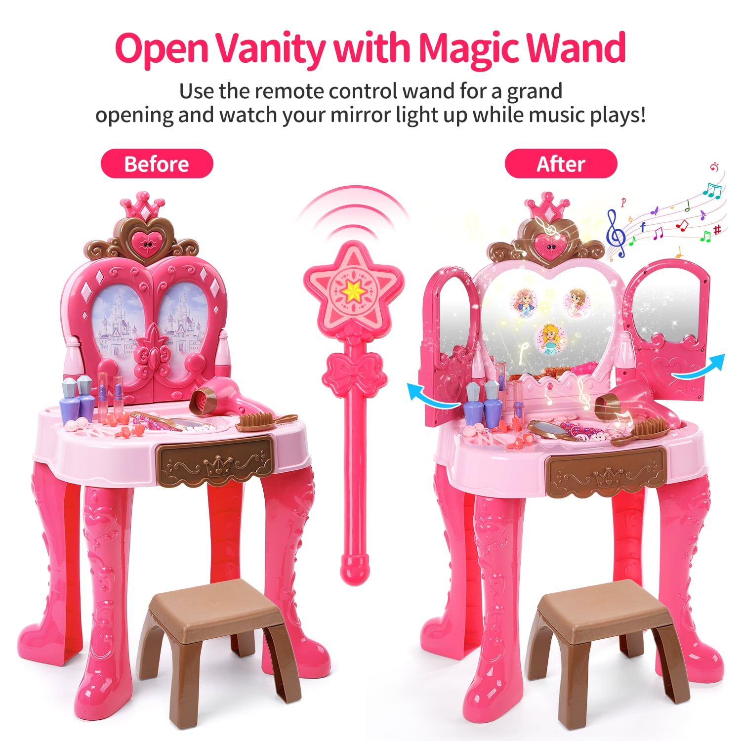 JoyStone Toddler Vanity Makeup Table with Mirror and Chair, Kids Pretend Play Vanity Set with Accessories and Lights and Music for 2-5 Years Old, Pink